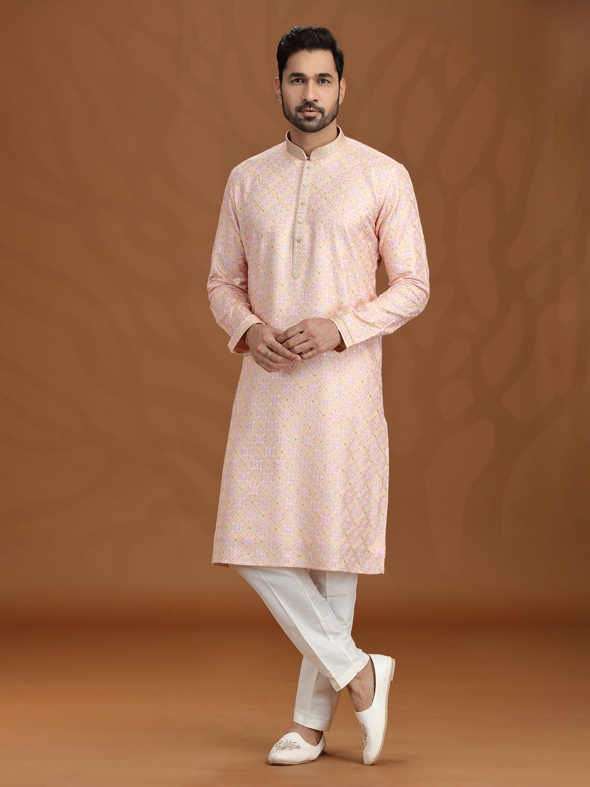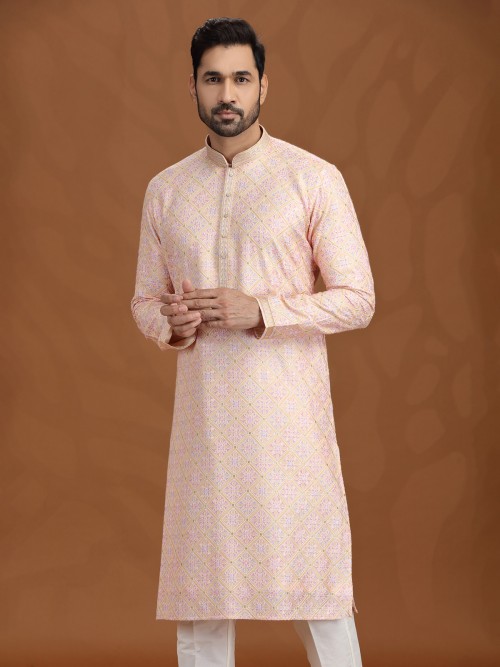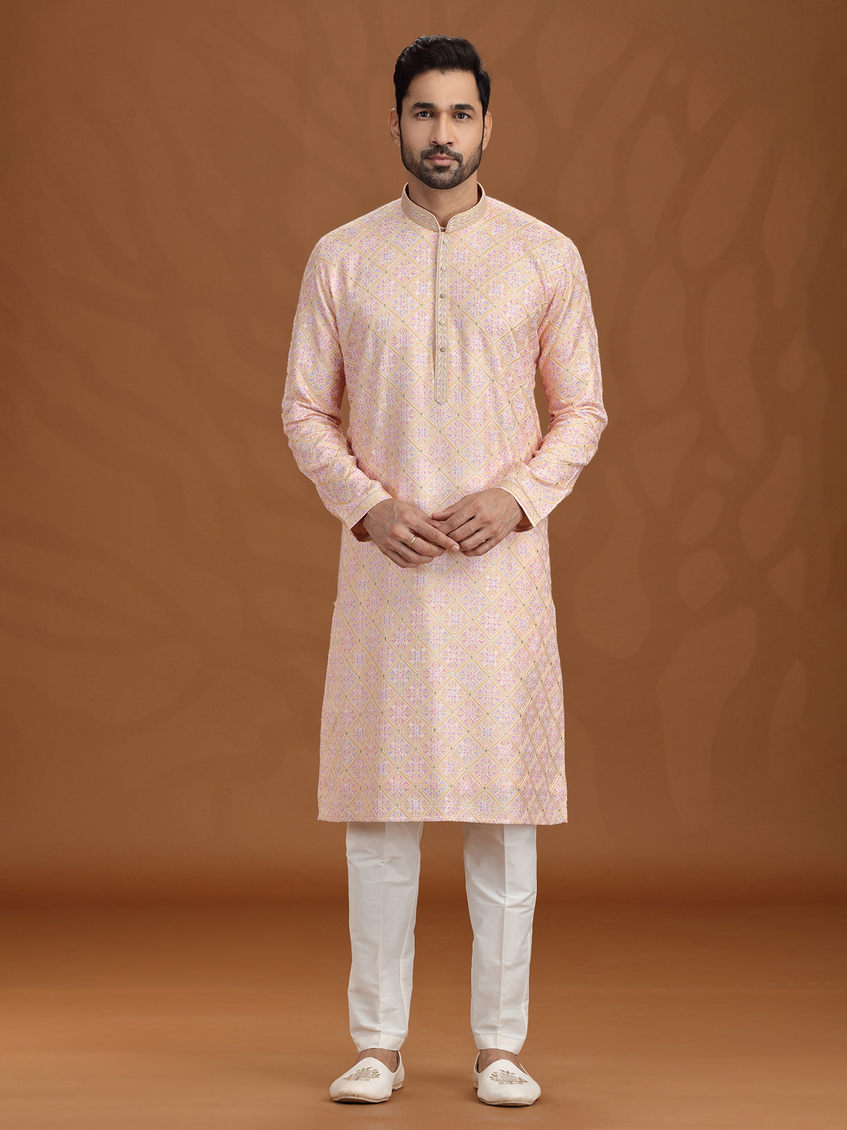 Step into festive grandeur with this gold and pink viscose kurta suit, intricately designed with embroidery, sequins, and thread embellishments. The colorful motifs enhance its regal aura, while the stand collar and pant create a sharp finish. A distinguished choice for weddings and celebrations, reflecting cultural elegance with contemporary styling.