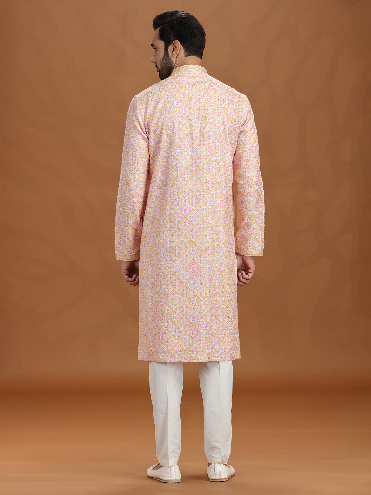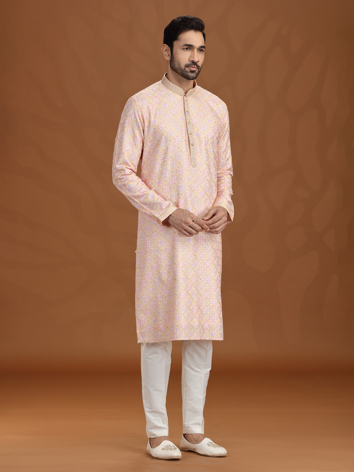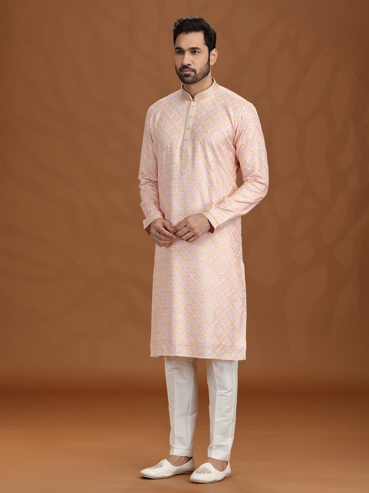 Step into festive grandeur with this gold and pink viscose kurta suit, intricately designed with embroidery, sequins, and thread embellishments. The colorful motifs enhance its regal aura, while the stand collar and pant create a sharp finish. A distinguished choice for weddings and celebrations, reflecting cultural elegance with contemporary styling.