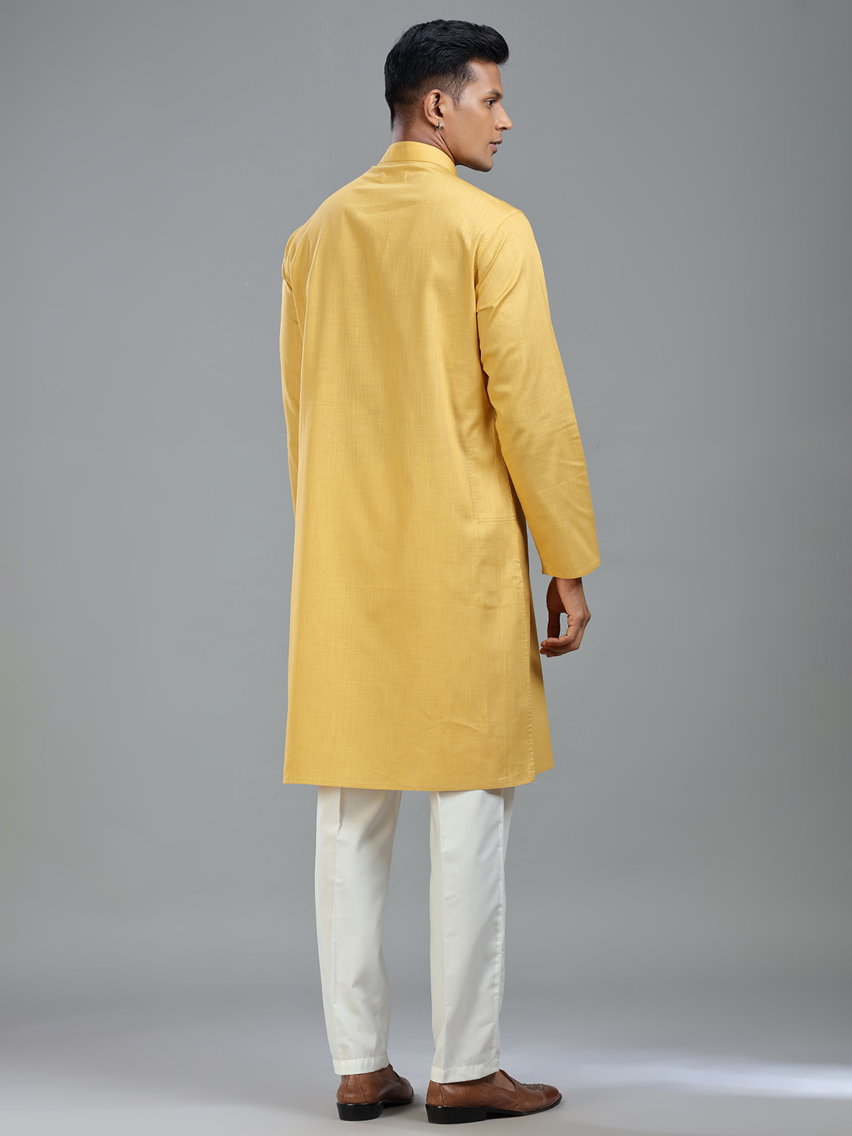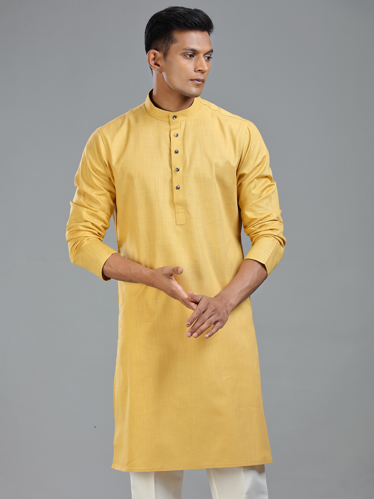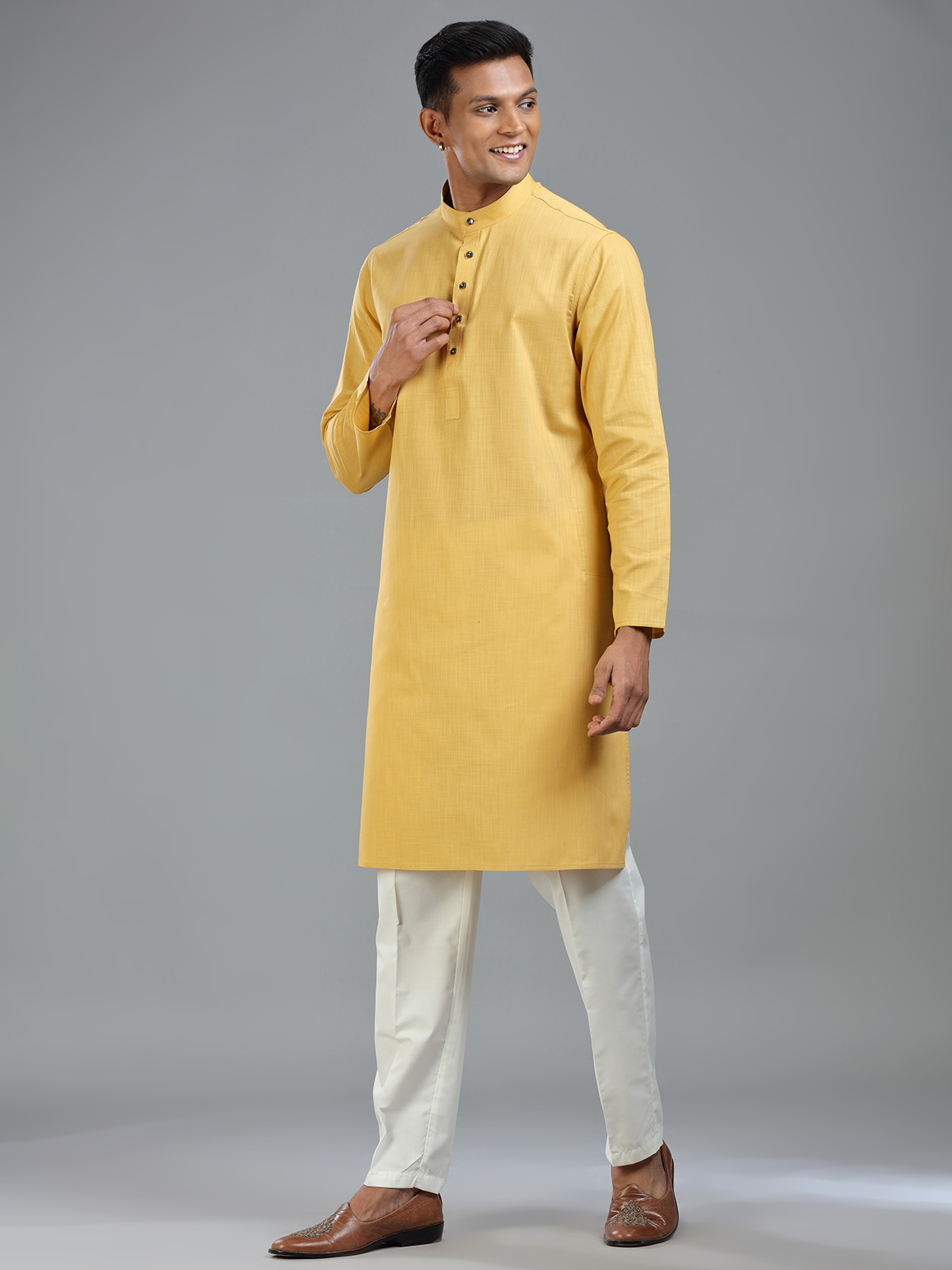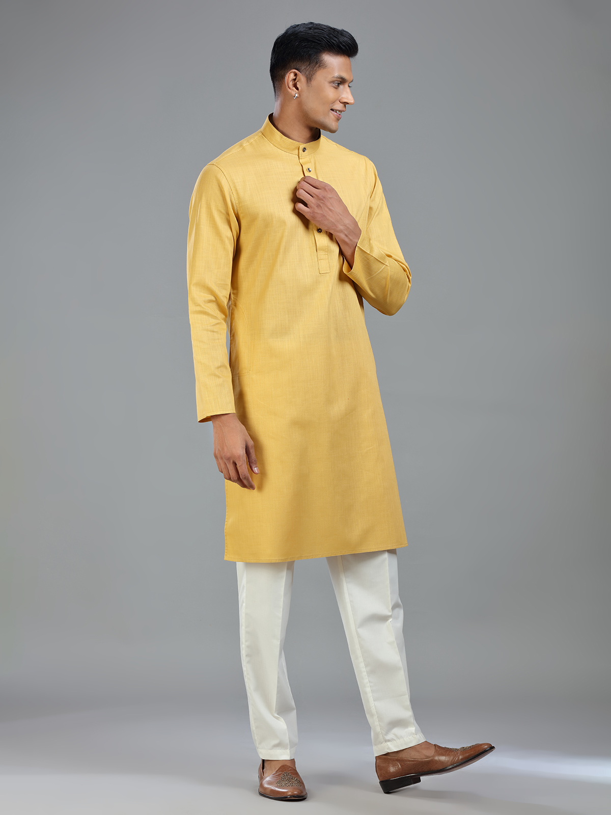 A traditional golden kurta suit made of airy, luxurious cotton fabric. Comfort is ensured with the long sleeves and mandarin collar. Includes a bottom.
