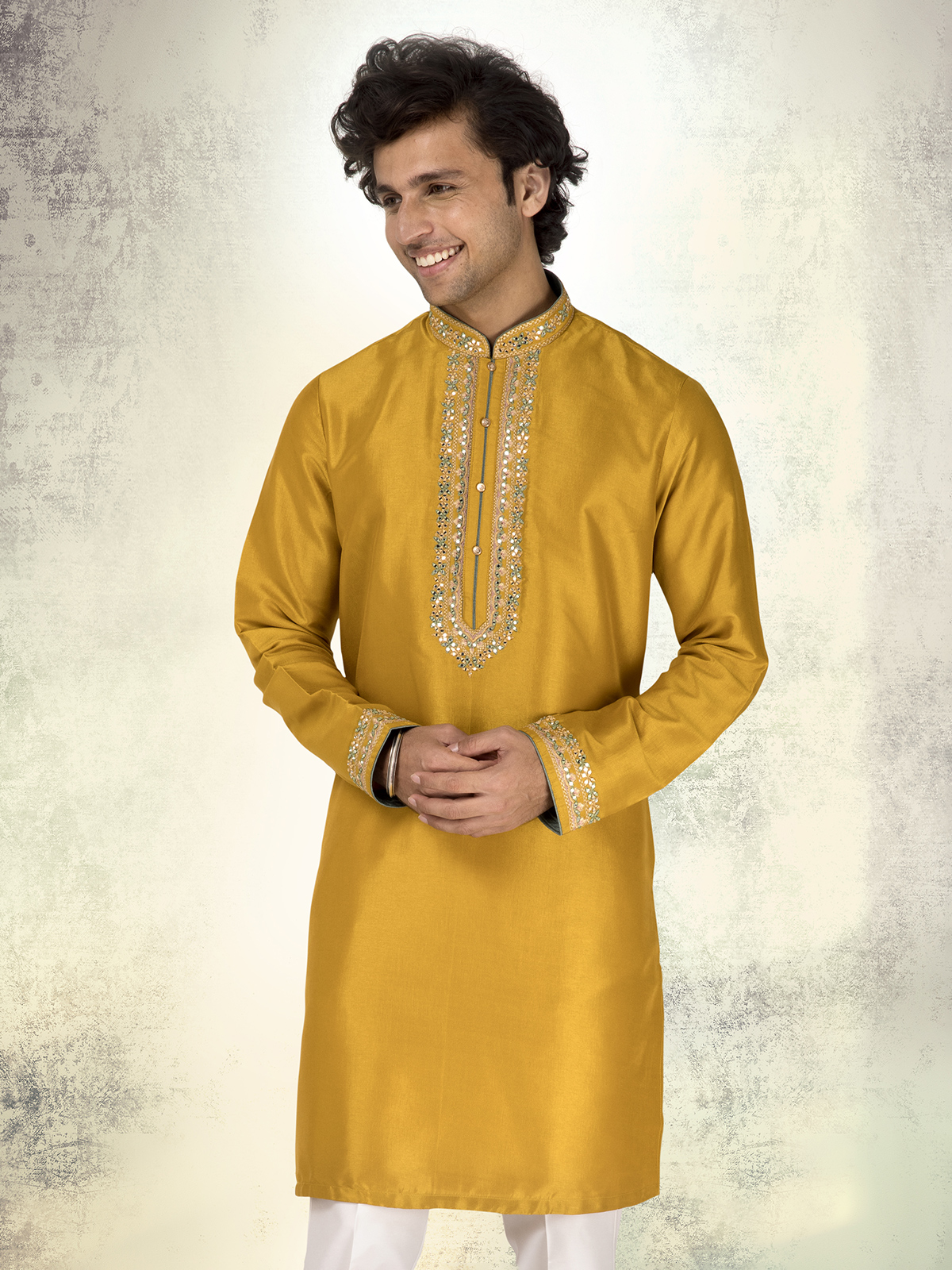 Tailored in luminous golden silk, this kurta suit shimmers with embroidery and aabla craftsmanship. The mandarin collar and refined tailoring evoke grandeur. Paired with pants, it’s perfect for weddings, pujas, and celebrations.