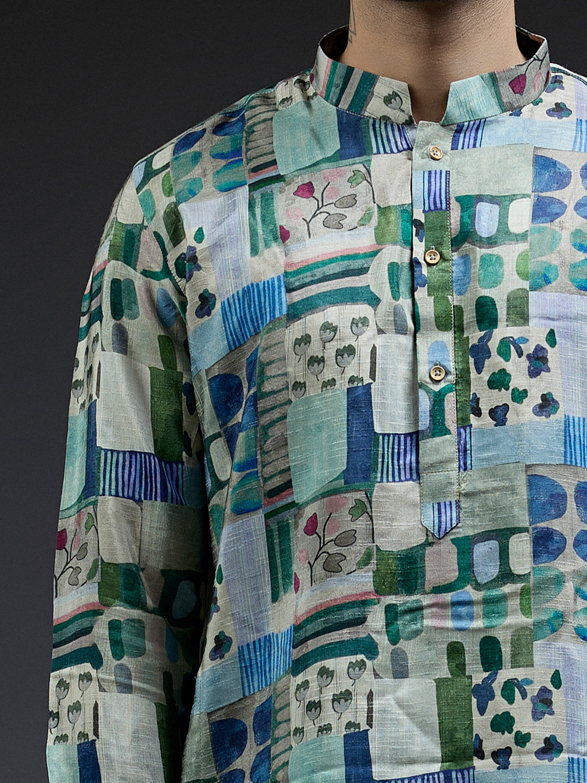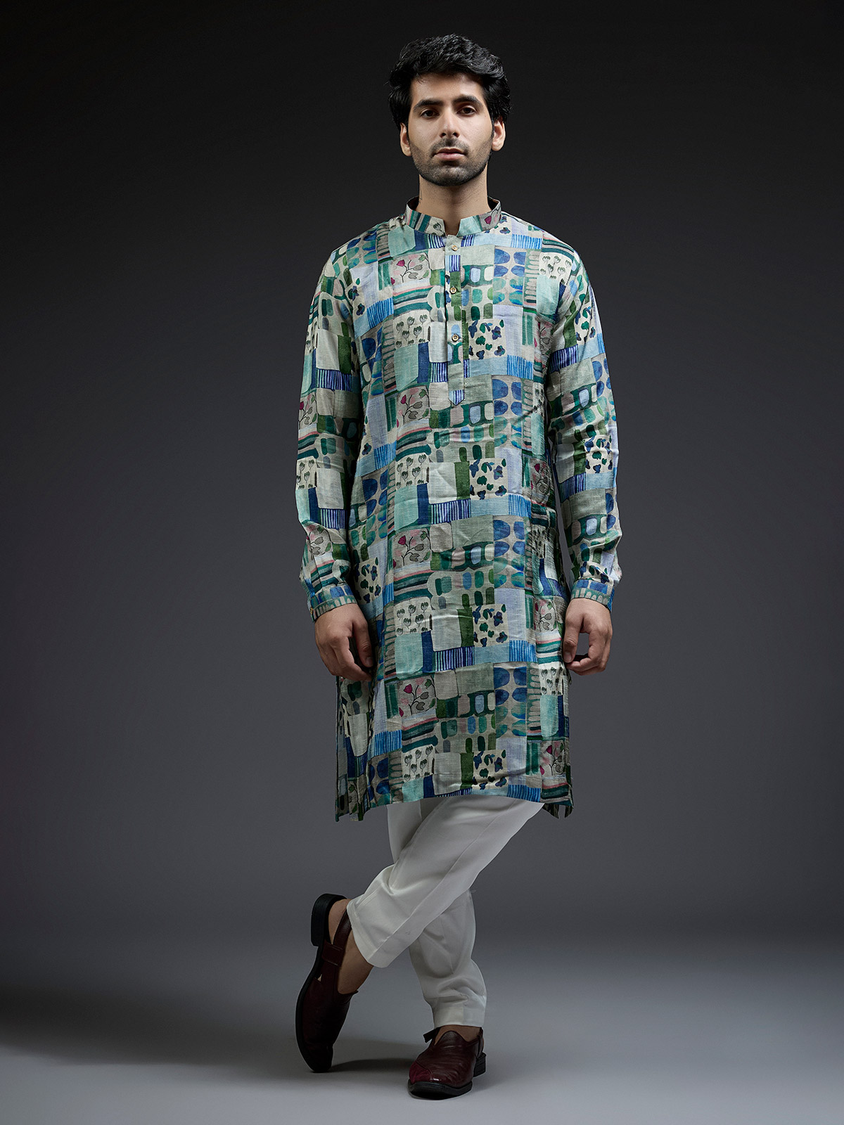 This silk-fabric green and blue kurta set is the ideal fusion of refinement and ethnicity. It has a lovely coral print, is intricate, and fits comfortably. The white bottom and mandarin collar provide the last touch.