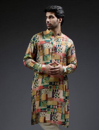 This set of green and yellow kurtas is perfect for people who like a subtle yet fashionable style. This set is comfortable and colorful, with a coral-style design and silk fabric construction. A unified look is guaranteed by the white bottom and mandarin collar.