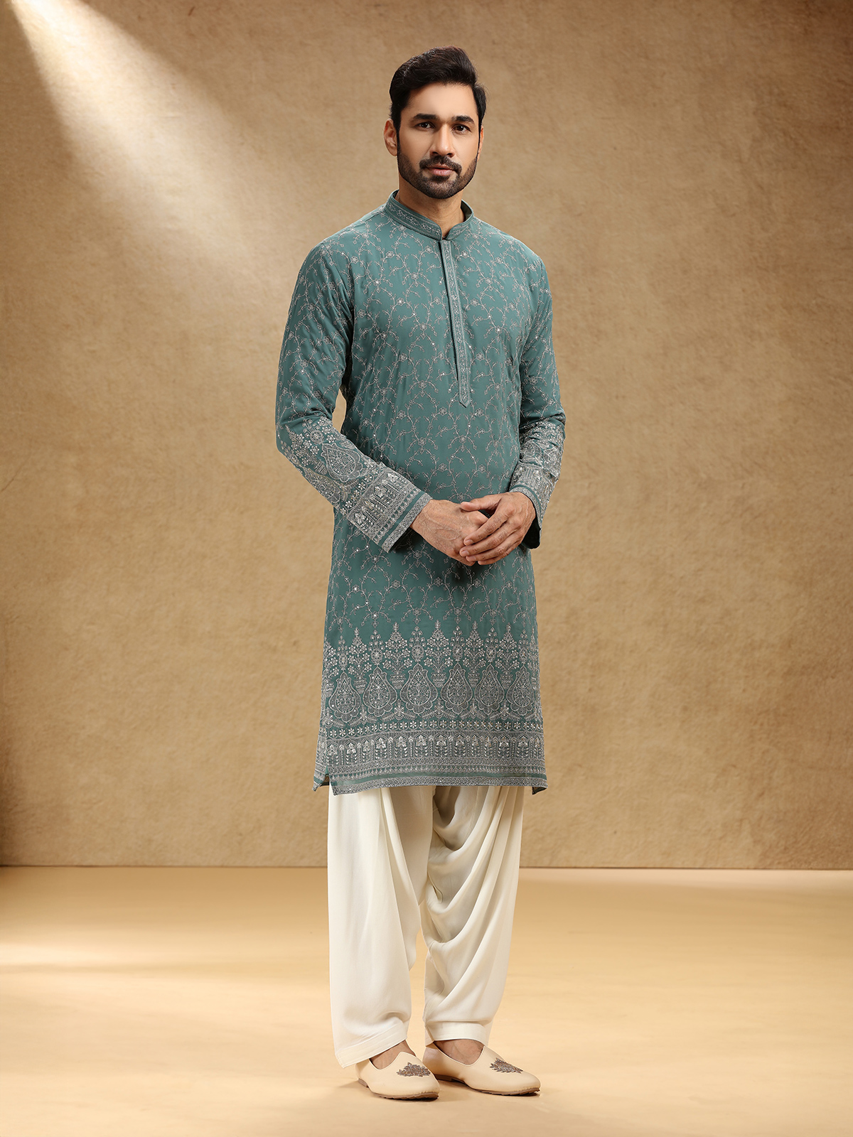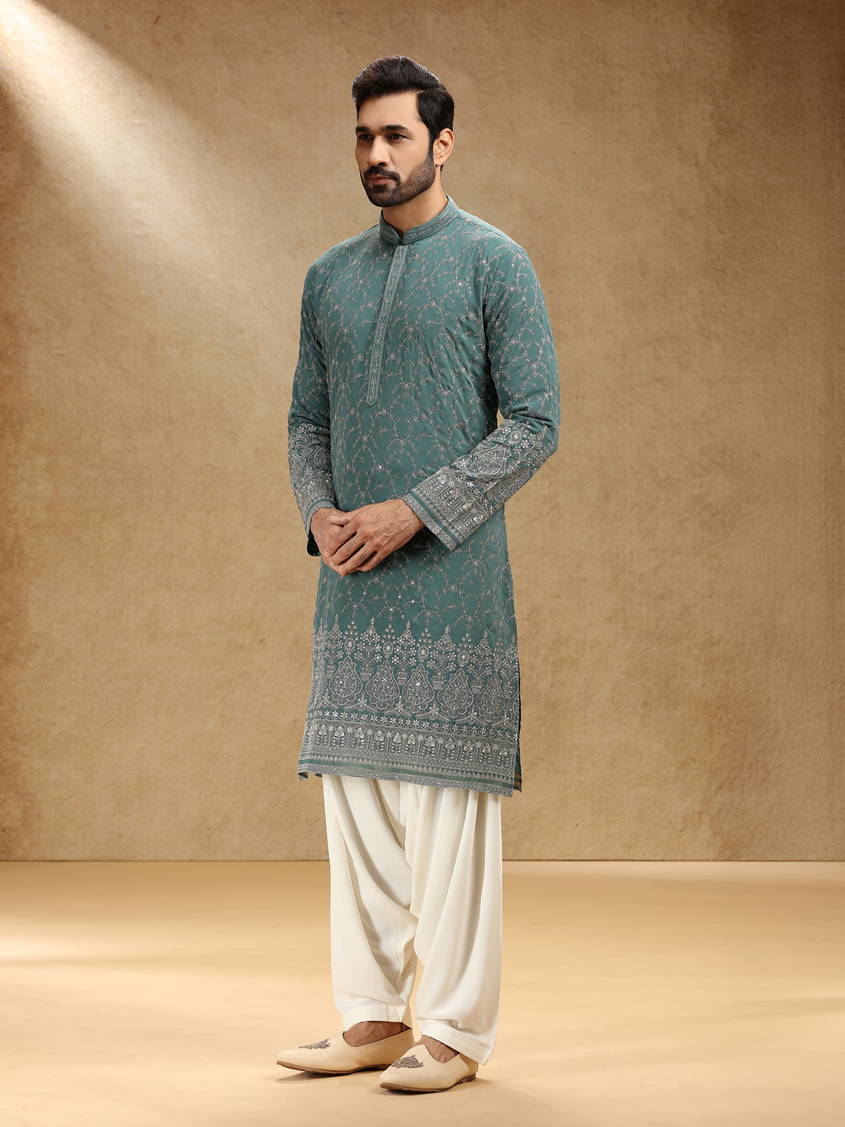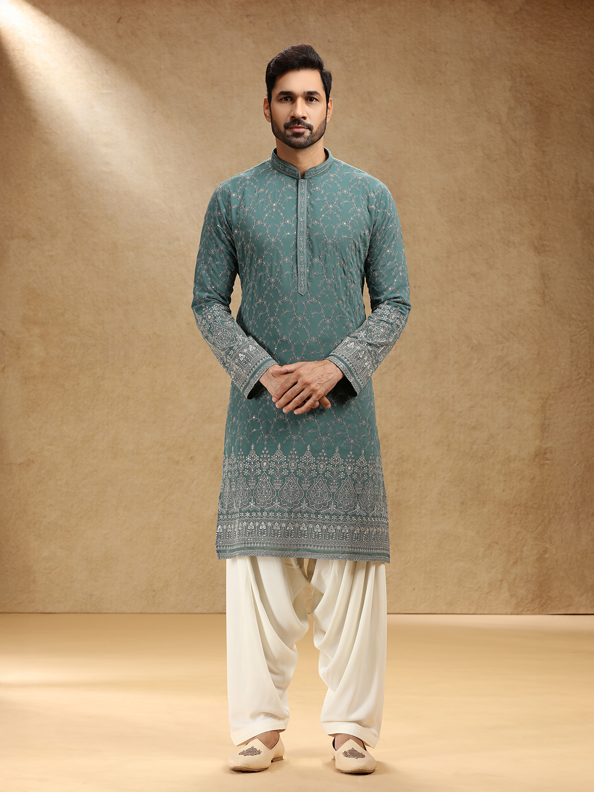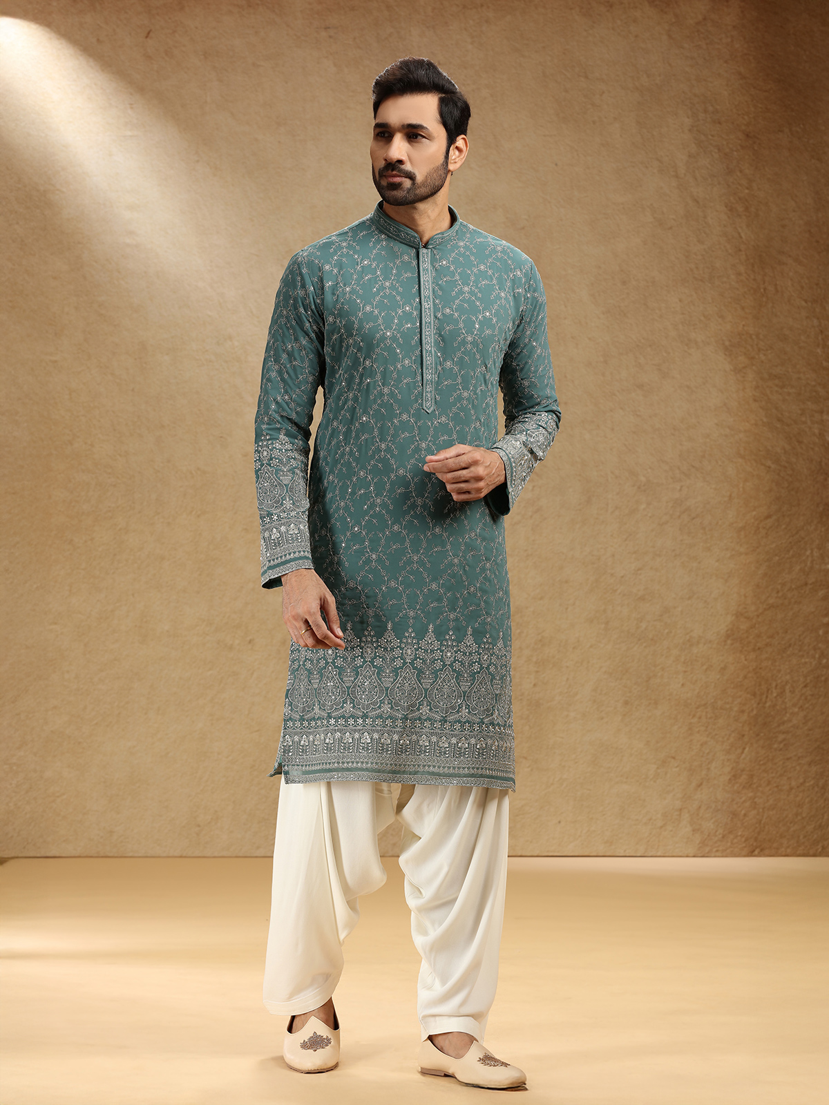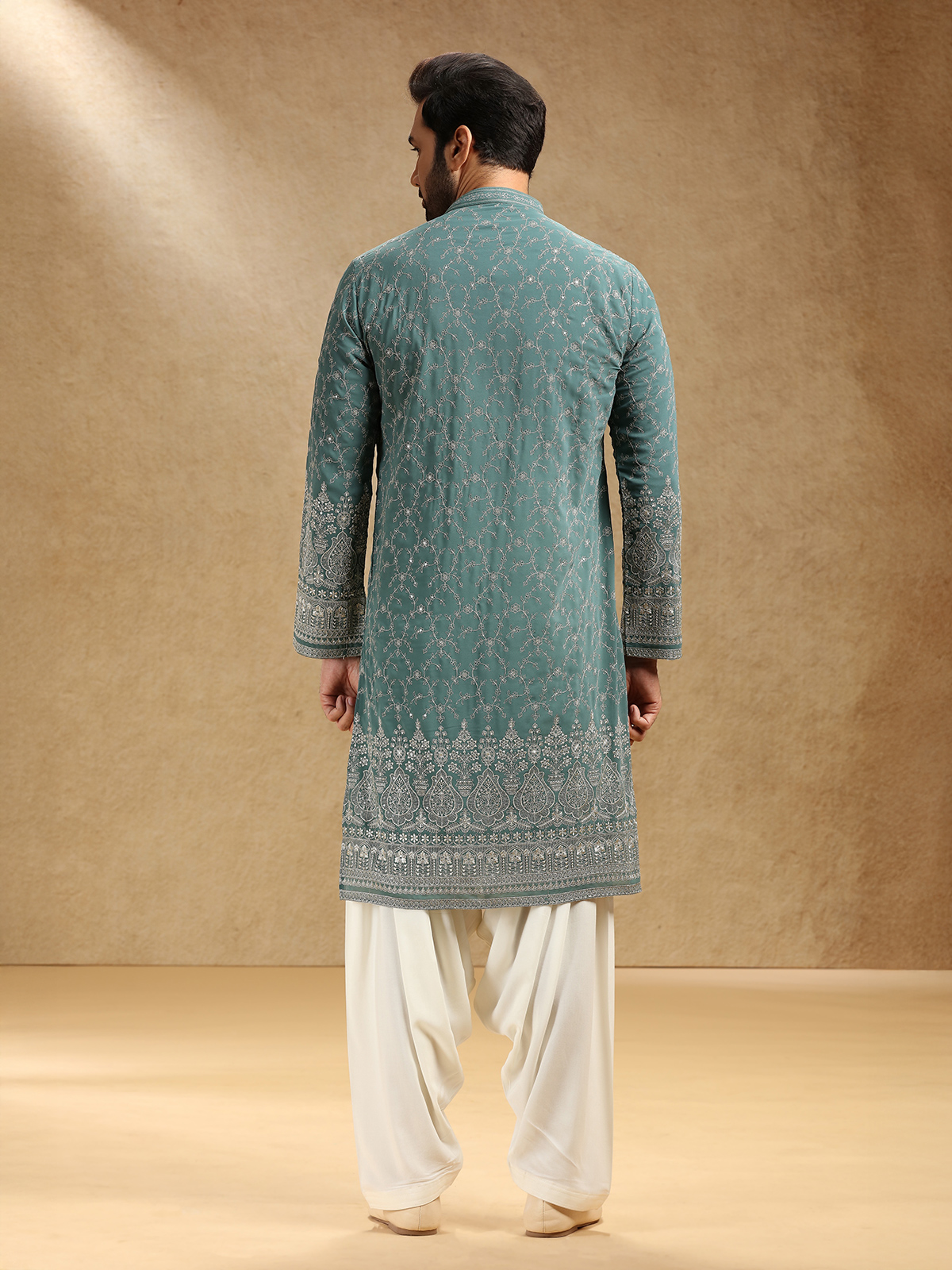 Draped in regal green georgette, this kurta suit shines with sequins and resham work, exuding festive grandeur. A dignified stand collar and full sleeves frame its silhouette, while tailored pants lend modern appeal. The deep green shade glows with traditional beauty, perfect for cultural celebrations that celebrate grace, poise, and luminous craftsmanship.