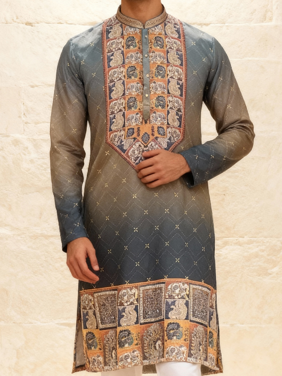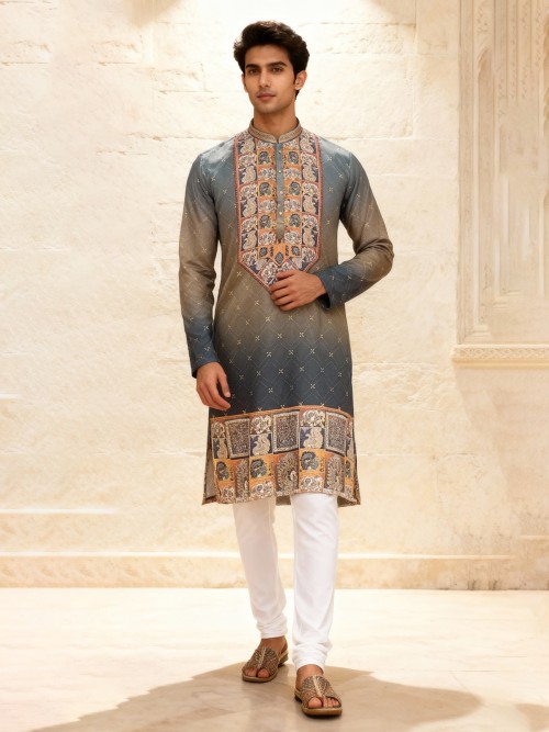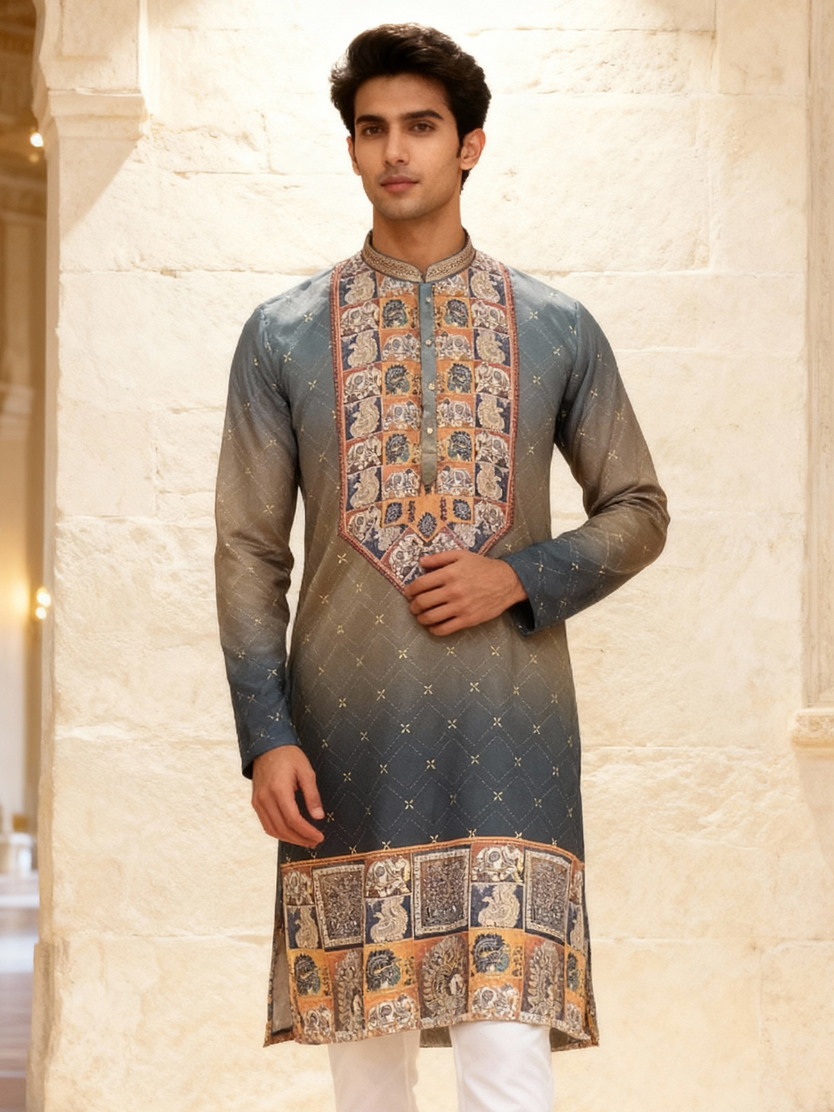 This shaded grey and beige cotton silk kurta features exquisite daman printing for refined elegance. Designed with a Chinese collar and full sleeves, it pairs with matching pants—perfect for festive or family occasions.