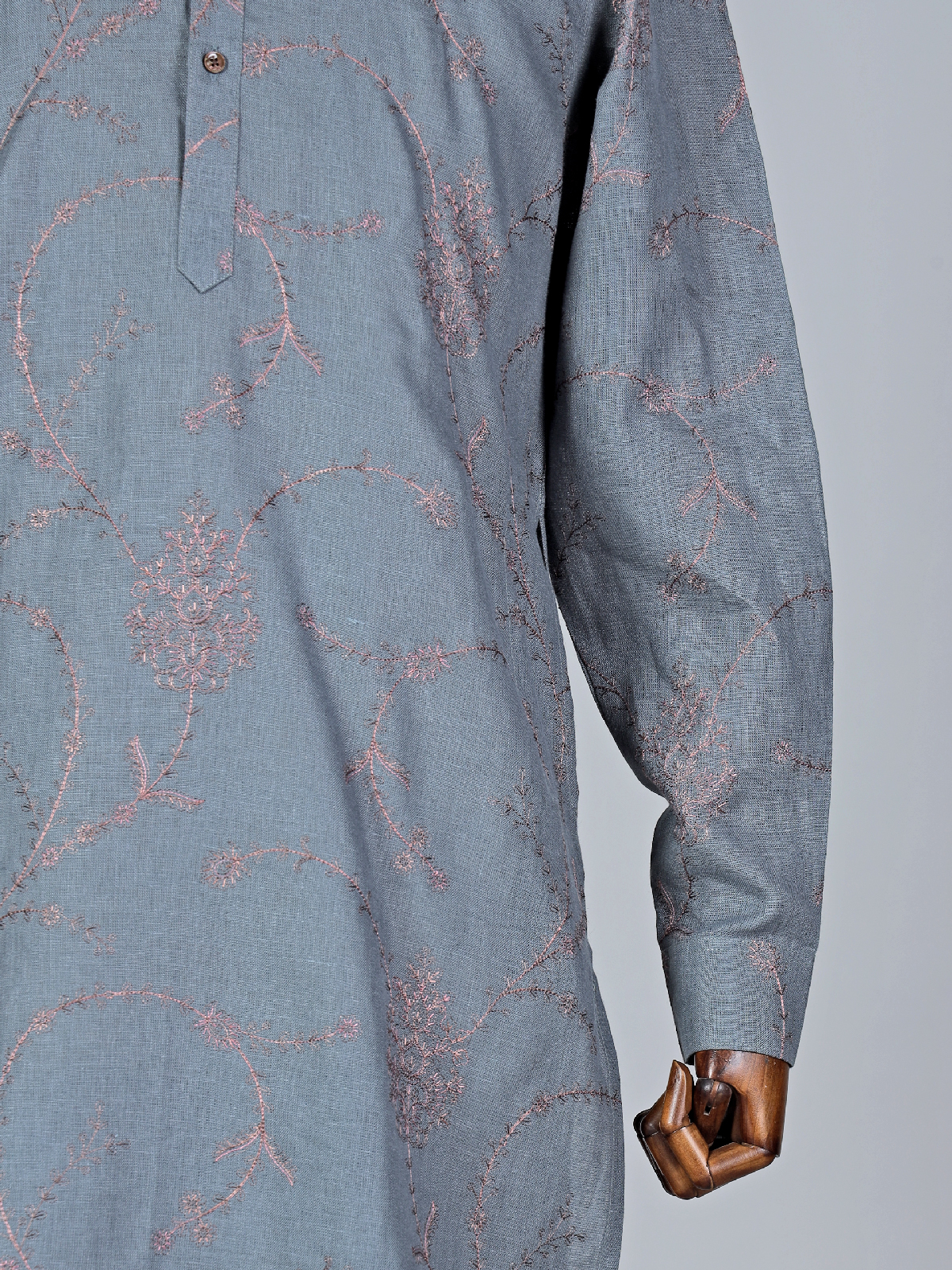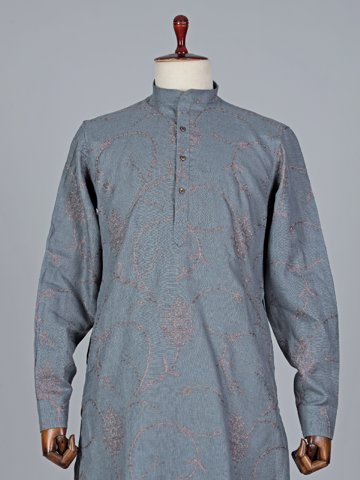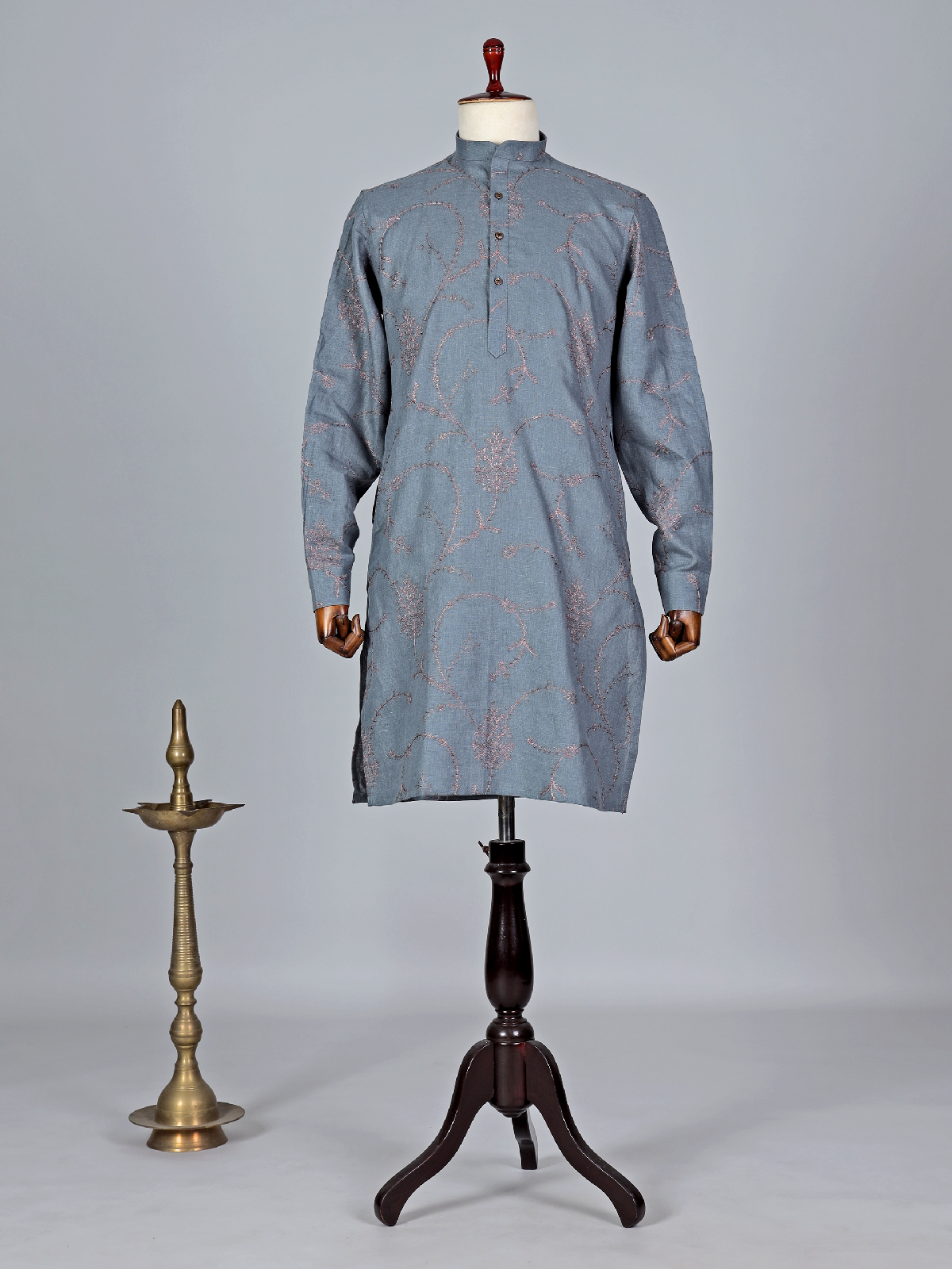 This grey kurta suit in superb cotton silk fabric, inhanced with embroidery work exudes joy and elegance. It features a mandarin collar and full sleeves. Comes with a bottom.