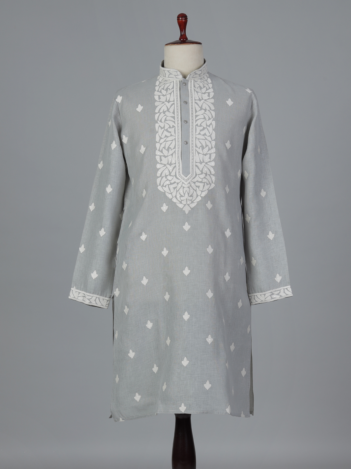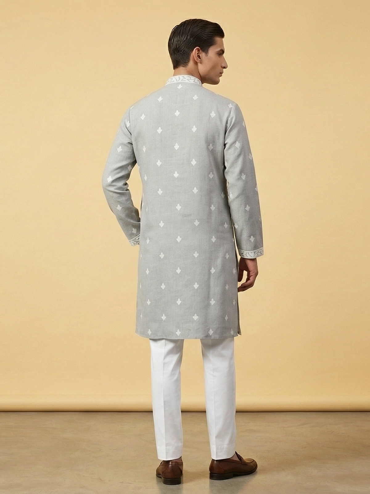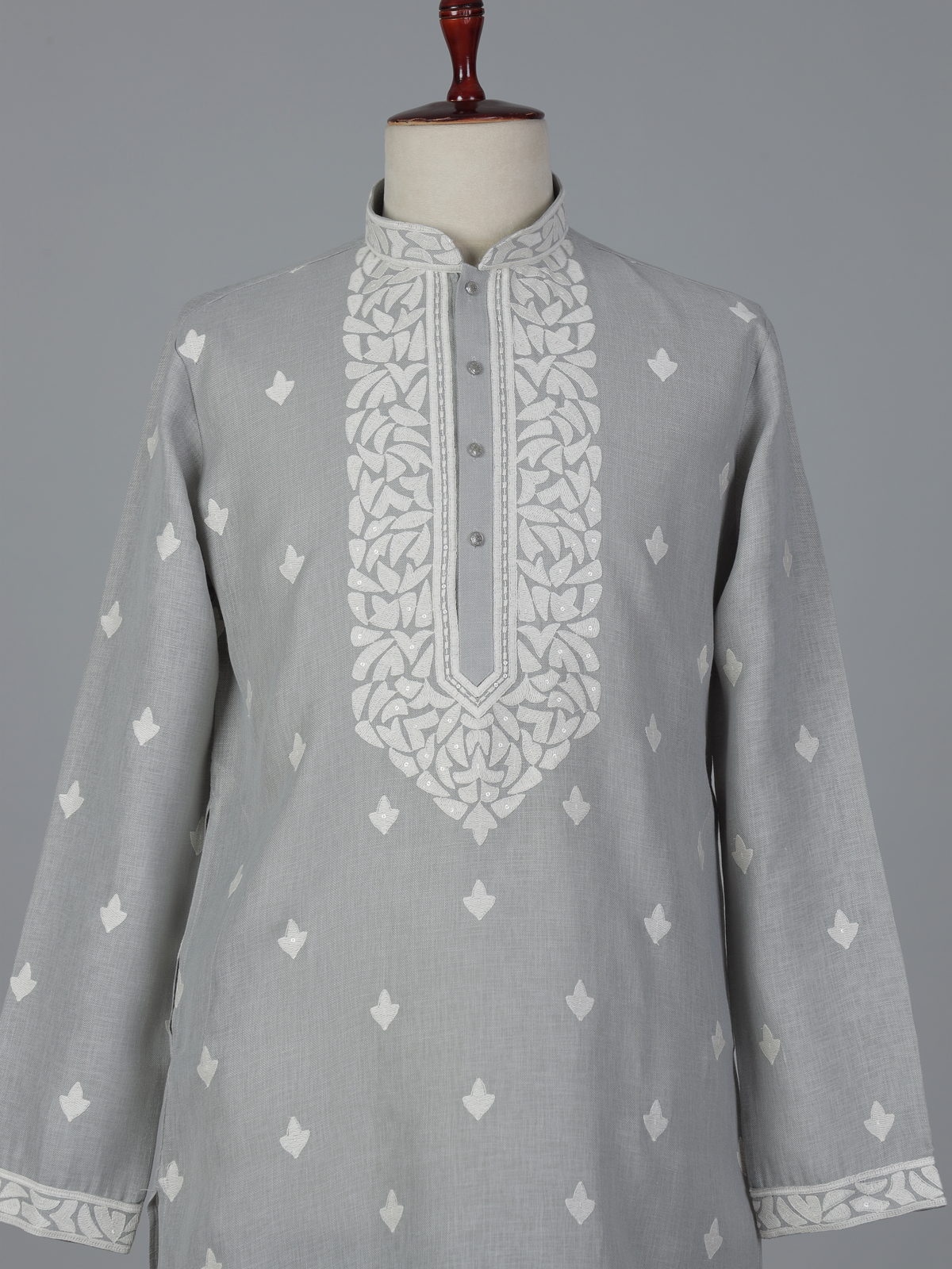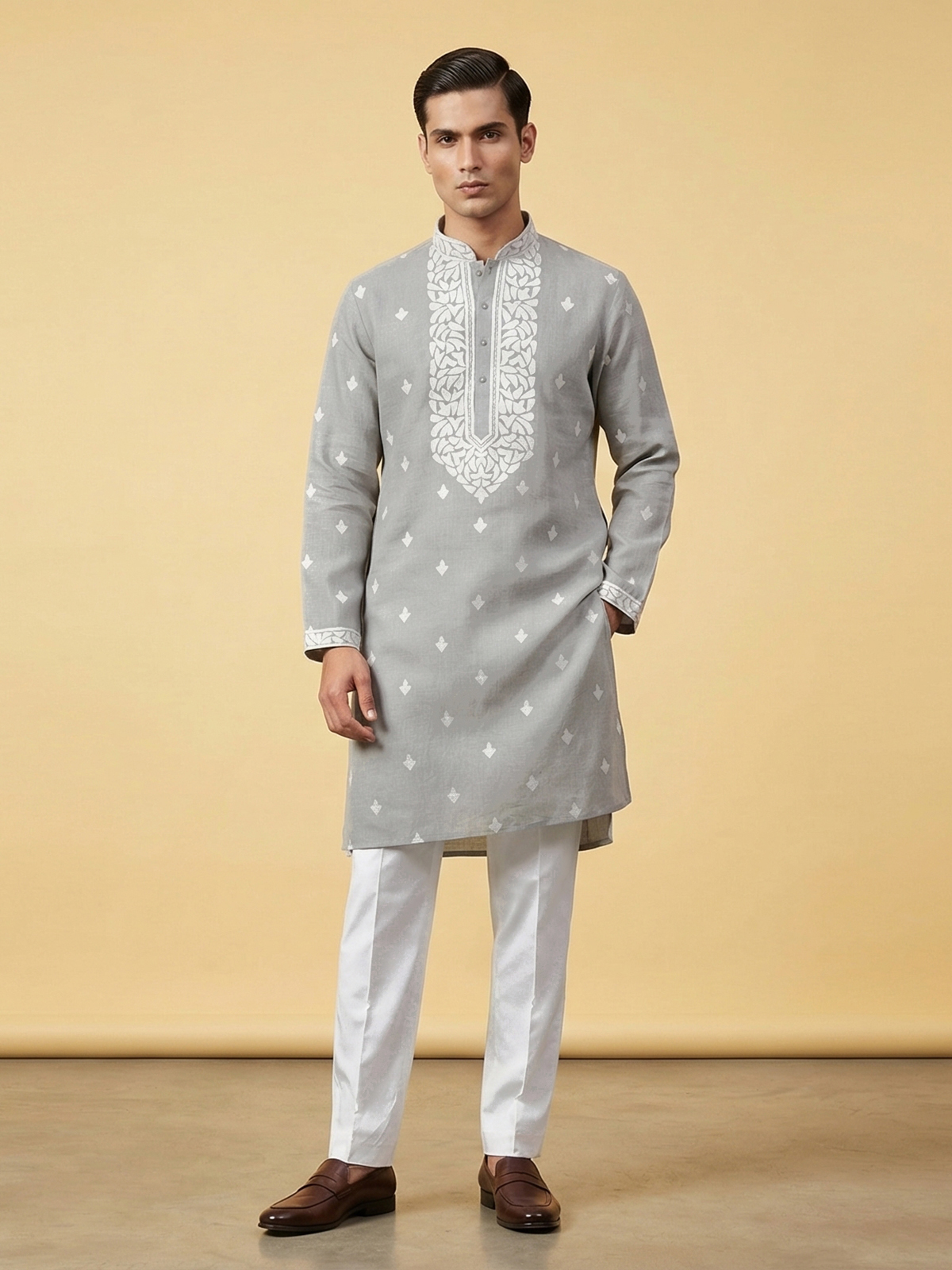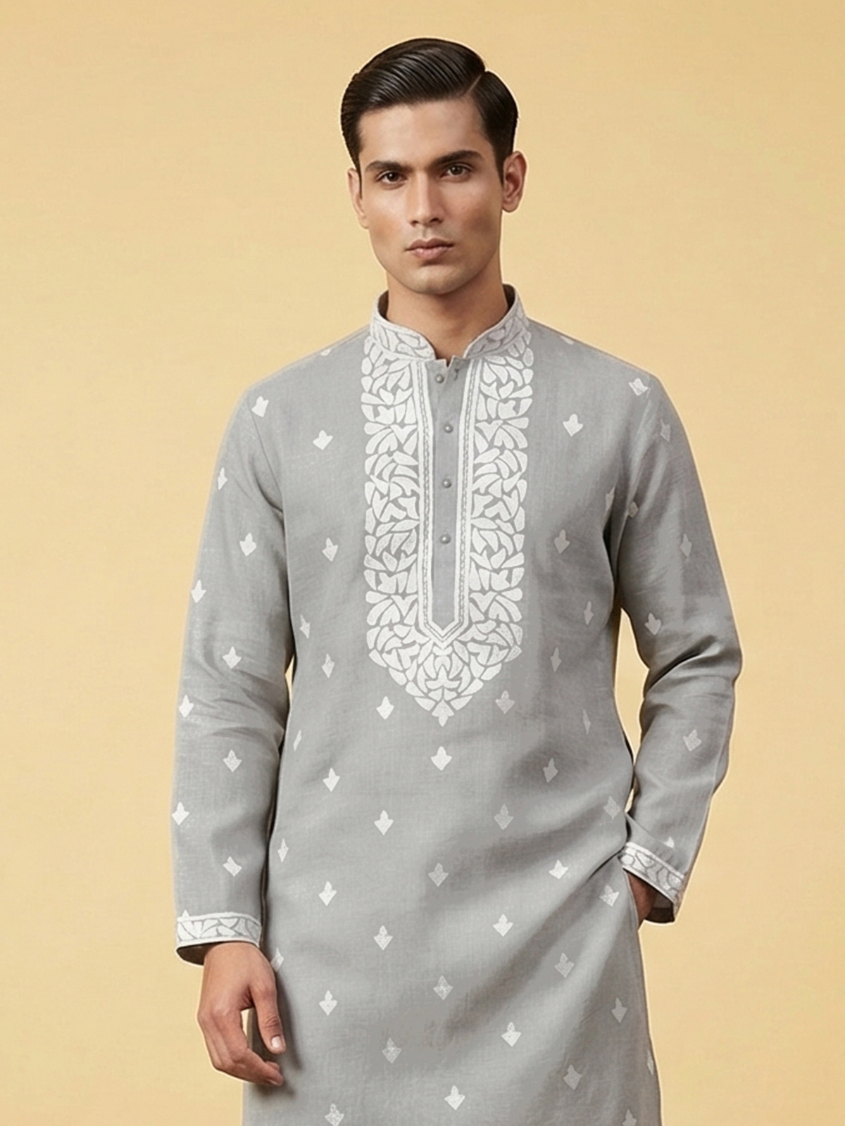 Subtle grey tones bring refined elegance to this linen kurta suit designed for festive occasions. The kurta features a classic mandarin collar that enhances its sophisticated ethnic appeal. Delicately adorned with embroidery and sequins that add gentle festive shimmer. Paired with comfortable pants. The ensemble creates a graceful traditional silhouette perfect for eid celebrations and festive gatherings.