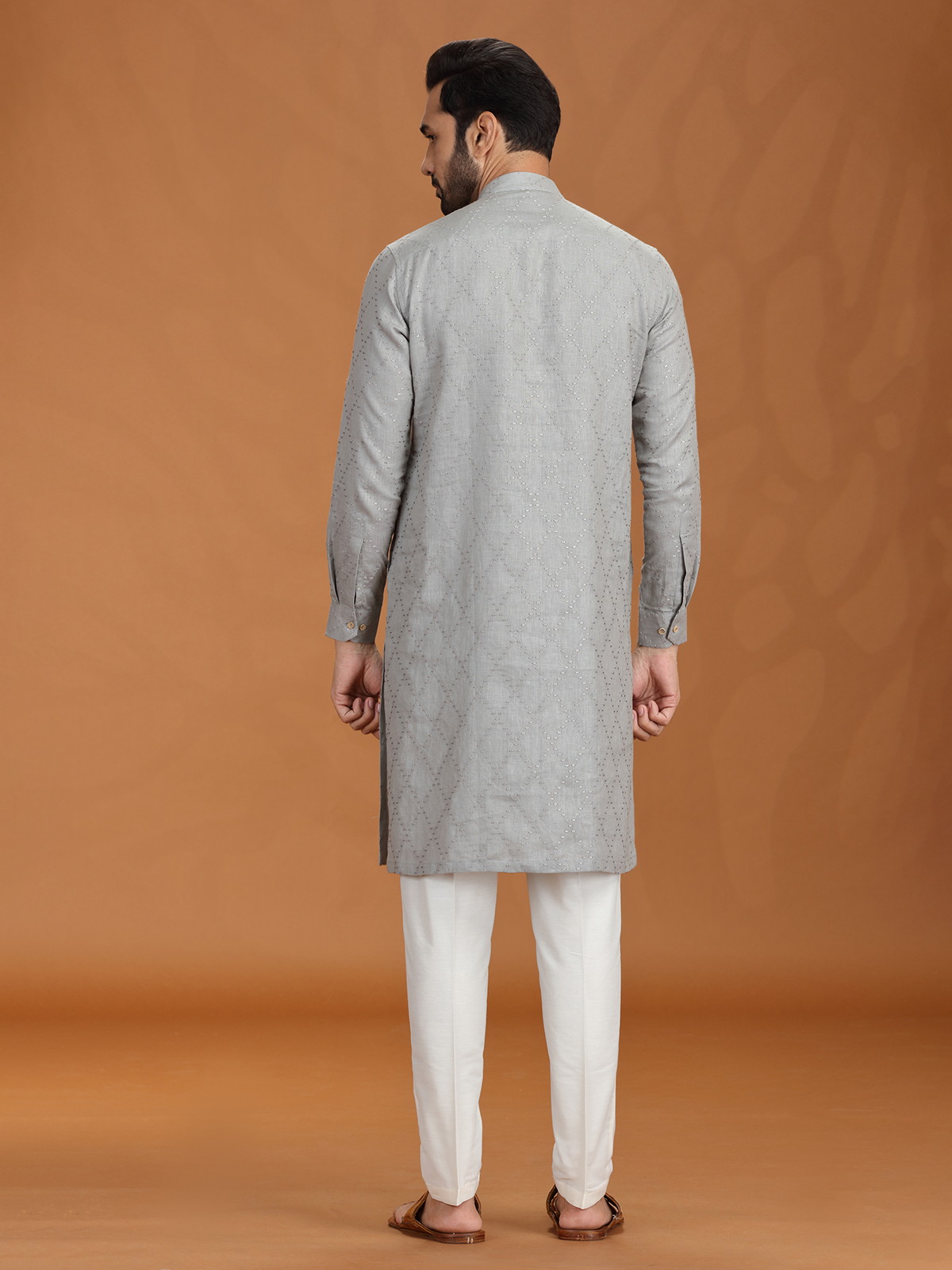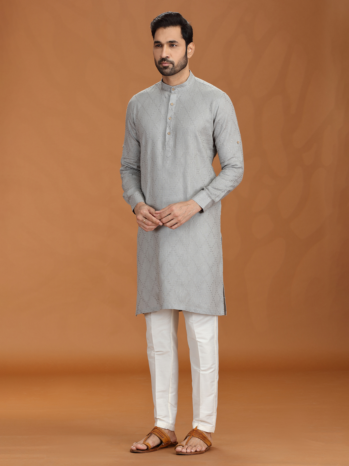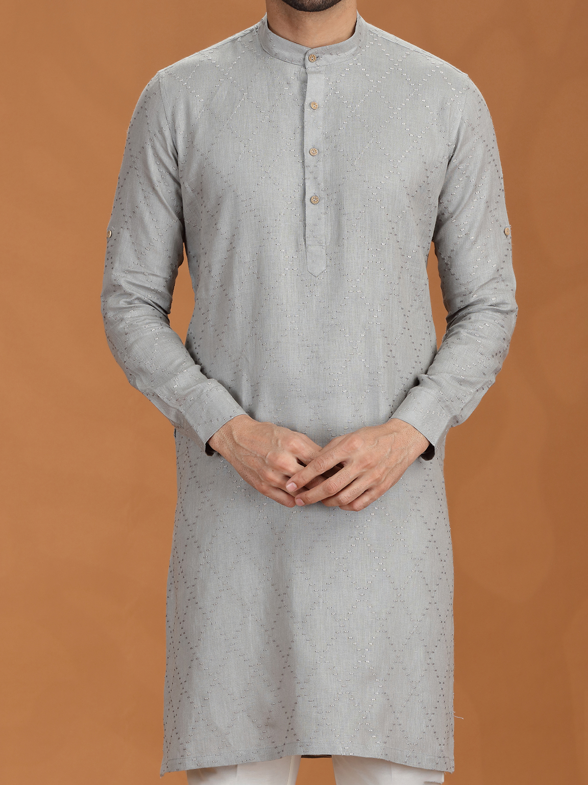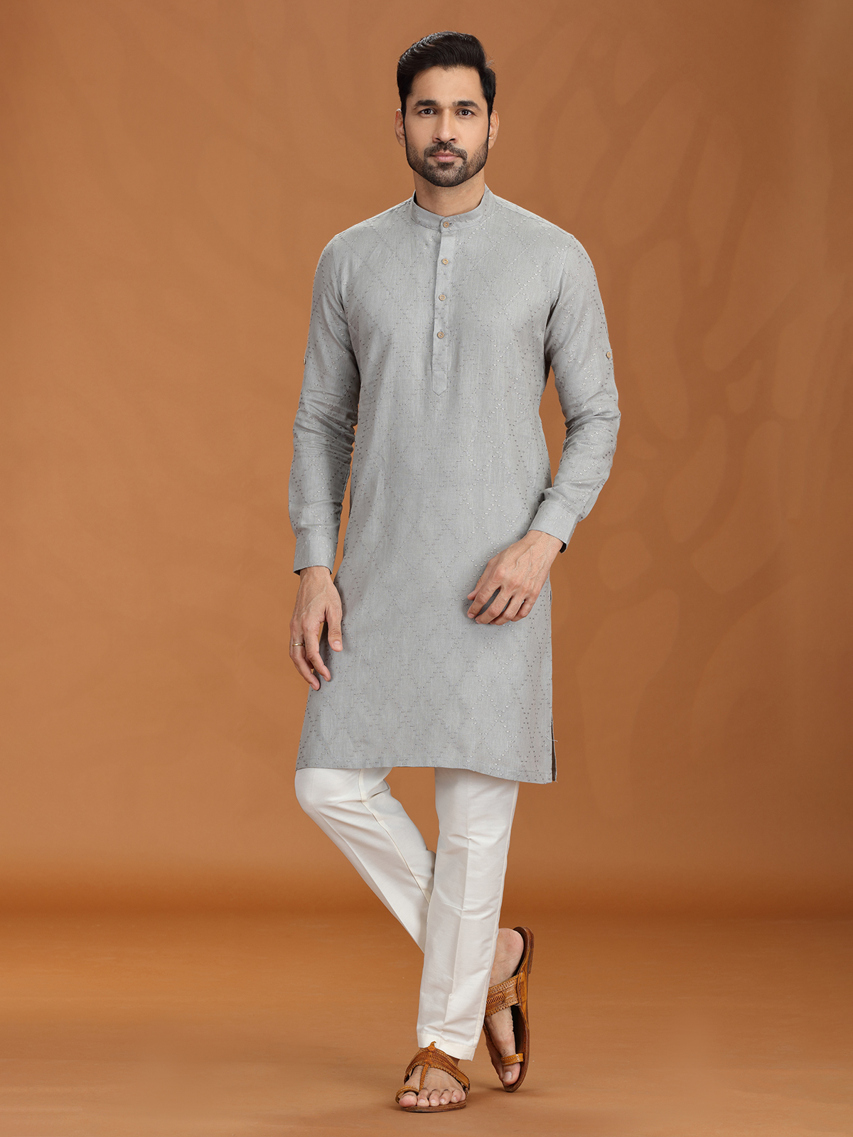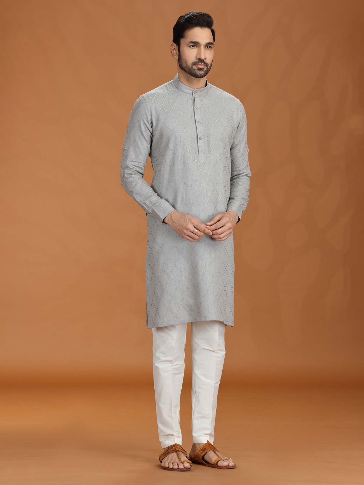 Sleek and graceful, this grey linen kurta set is accented with fine embroidery for a touch of quiet luxury. A mandarin-style Chinese collar and relaxed pant offer an elevated silhouette for any festive evening. Subdued in tone but rich in detail, it's perfect for refined traditional wear.