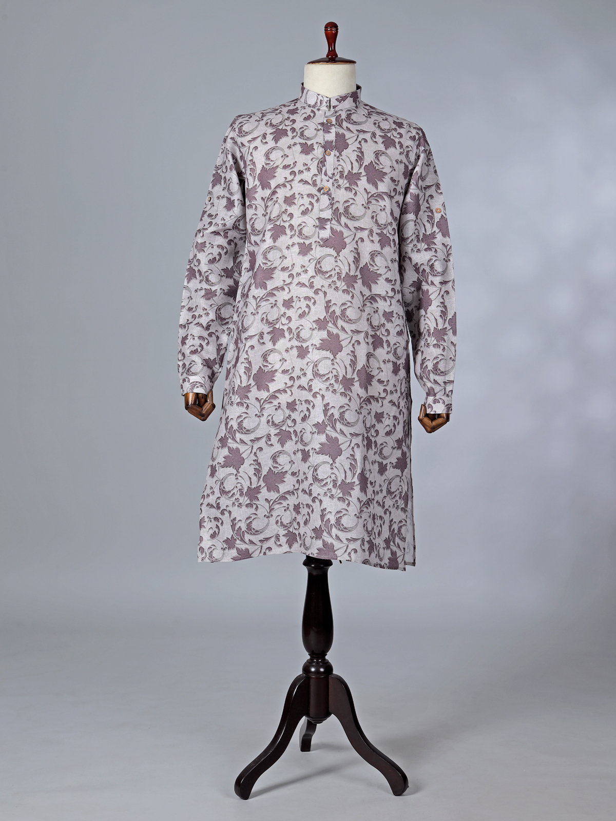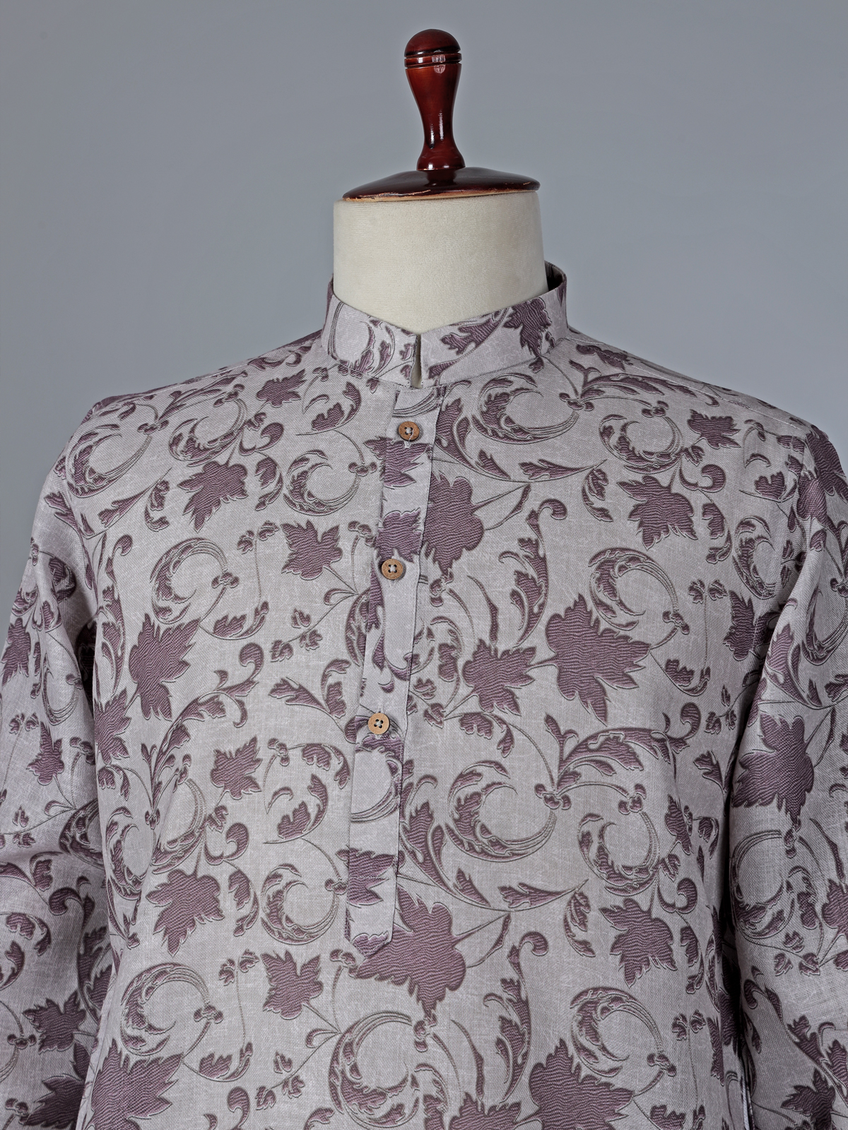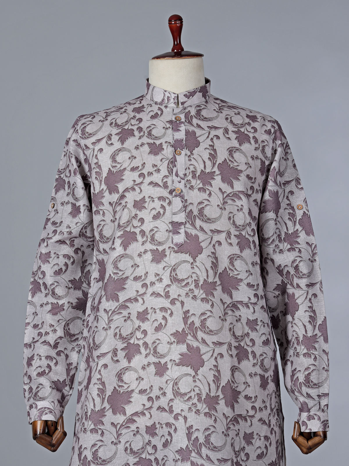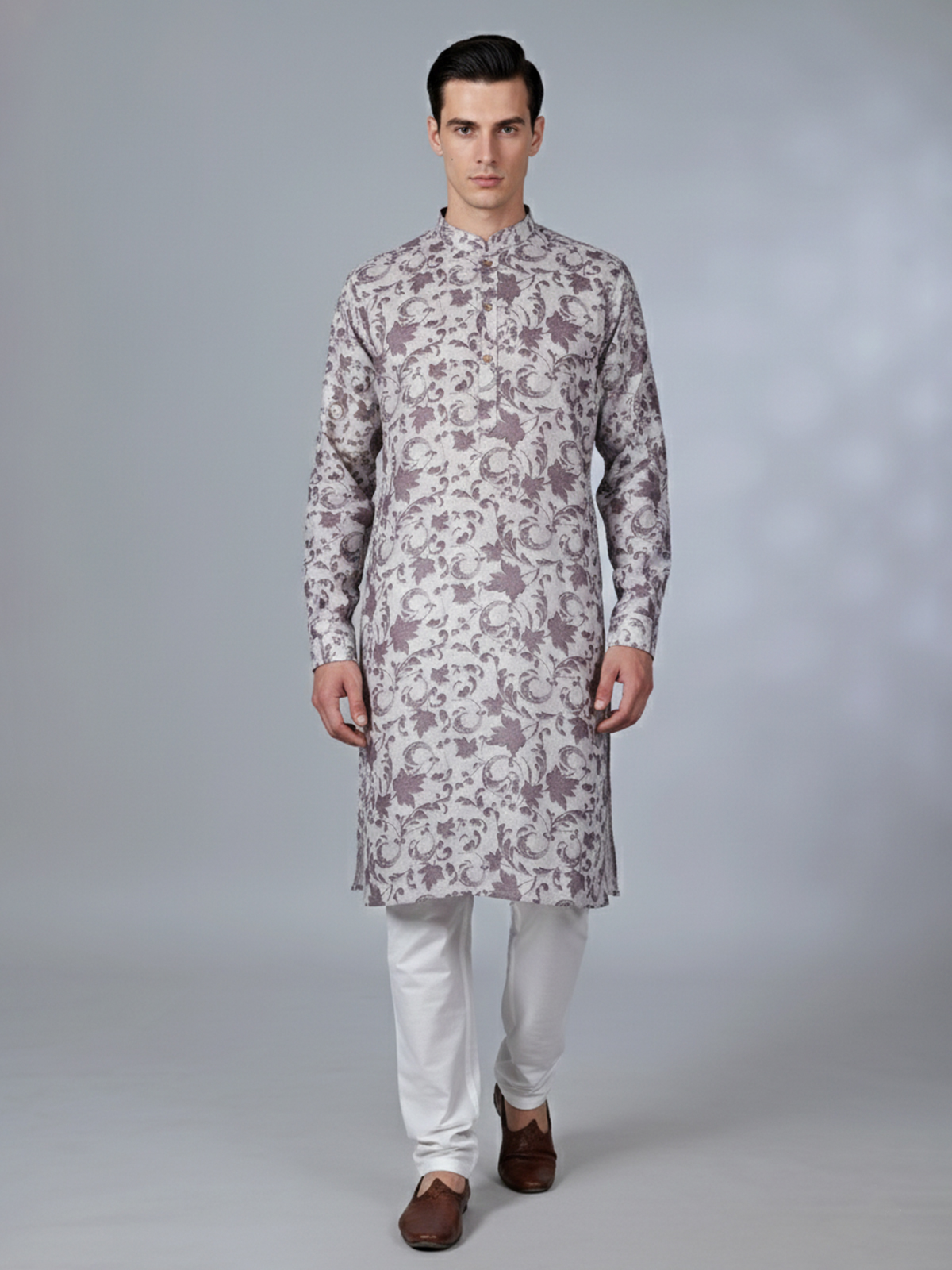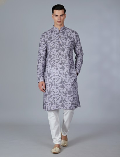This grey cotton kurta suit brings a modern edge to traditional wear. Featuring tasteful printed accents, the kurta is enhanced with a chinese collar with half button placket and full sleeves with half button placket and full sleeves that adds a structured finish. The lightweight cotton fabric allows easy movement, while pantt maintain a clean silhouette. Ideal for Festival and Eid occasions, this outfit is perfect for men seeking understated yet refined ethnic fashion.