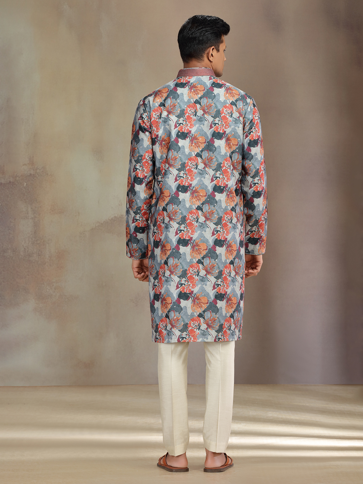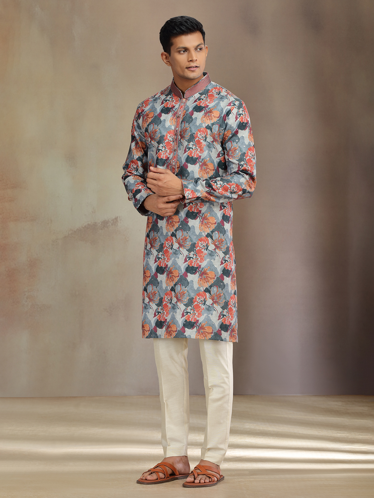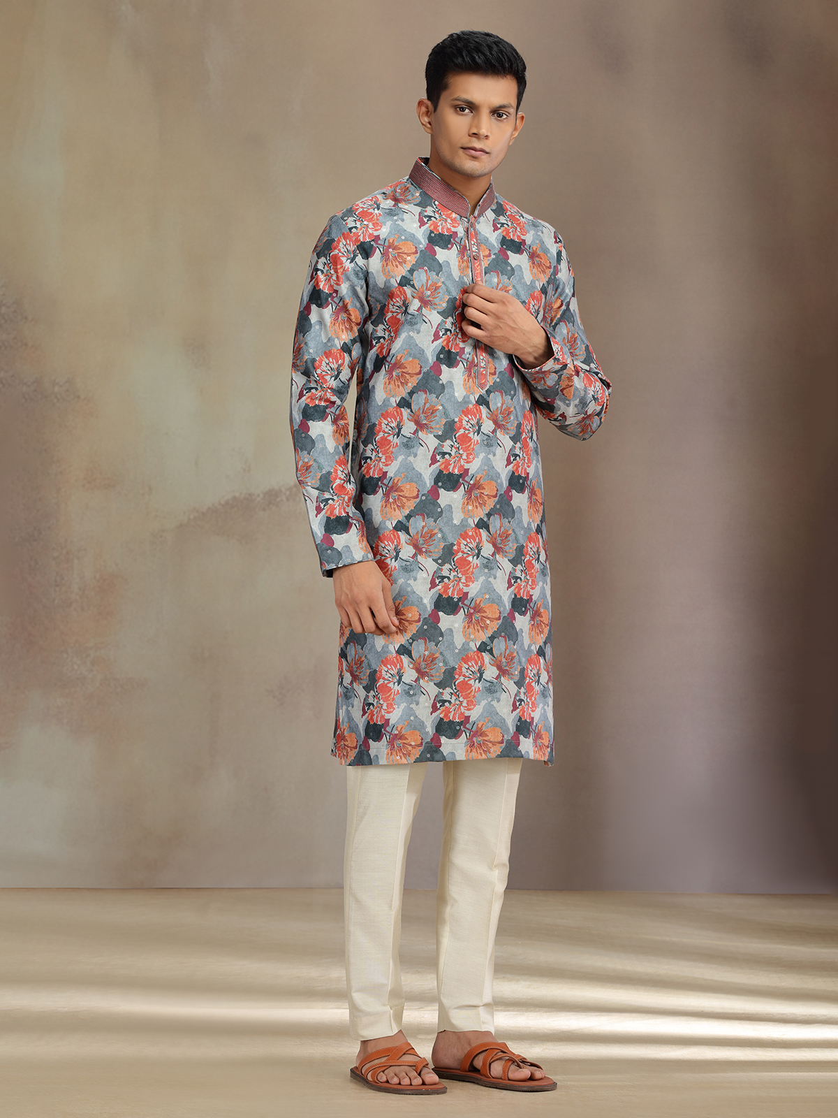 Grey Printed Jaquard Silk Festive Wear Kurta Pajama For Men