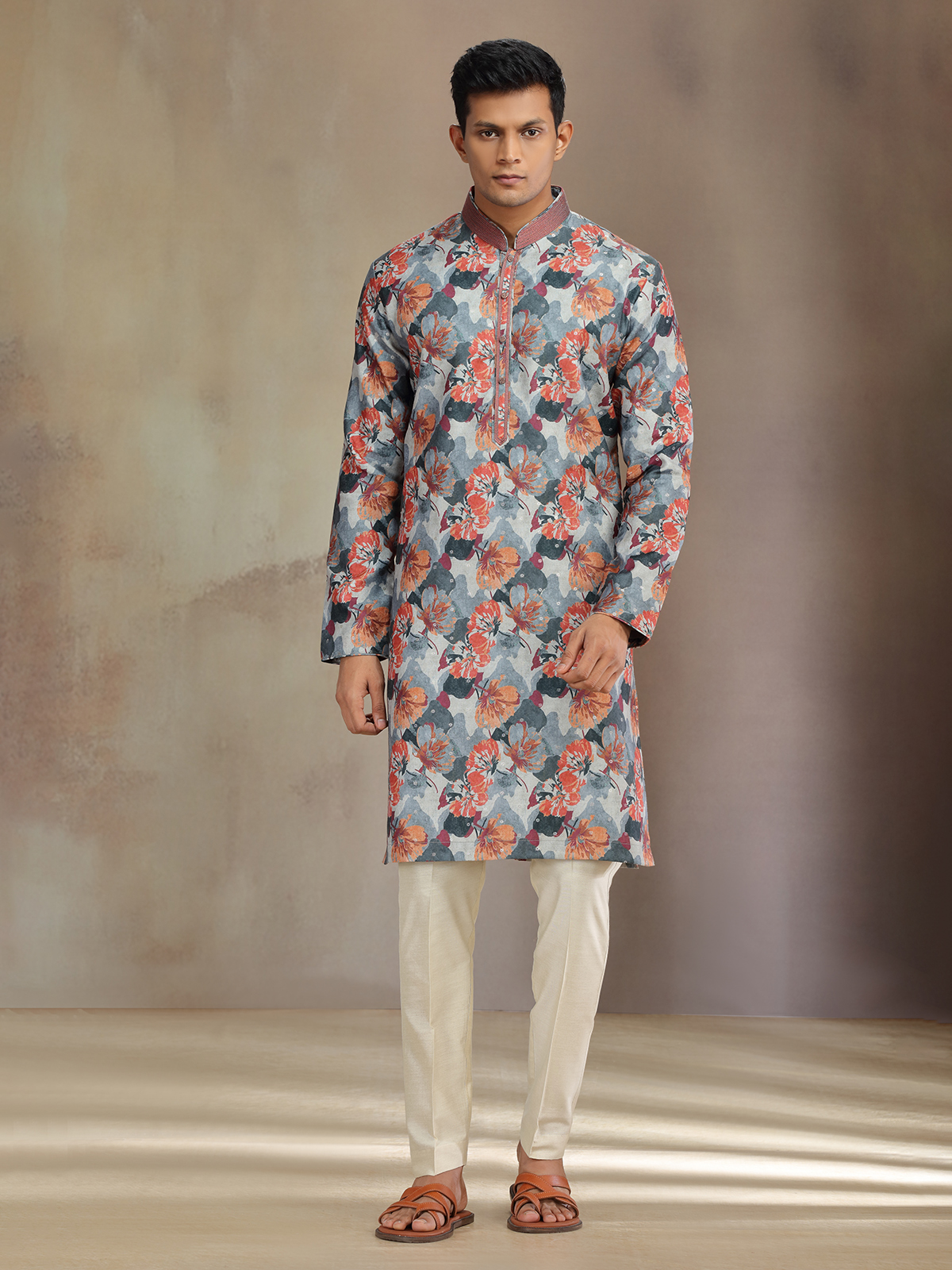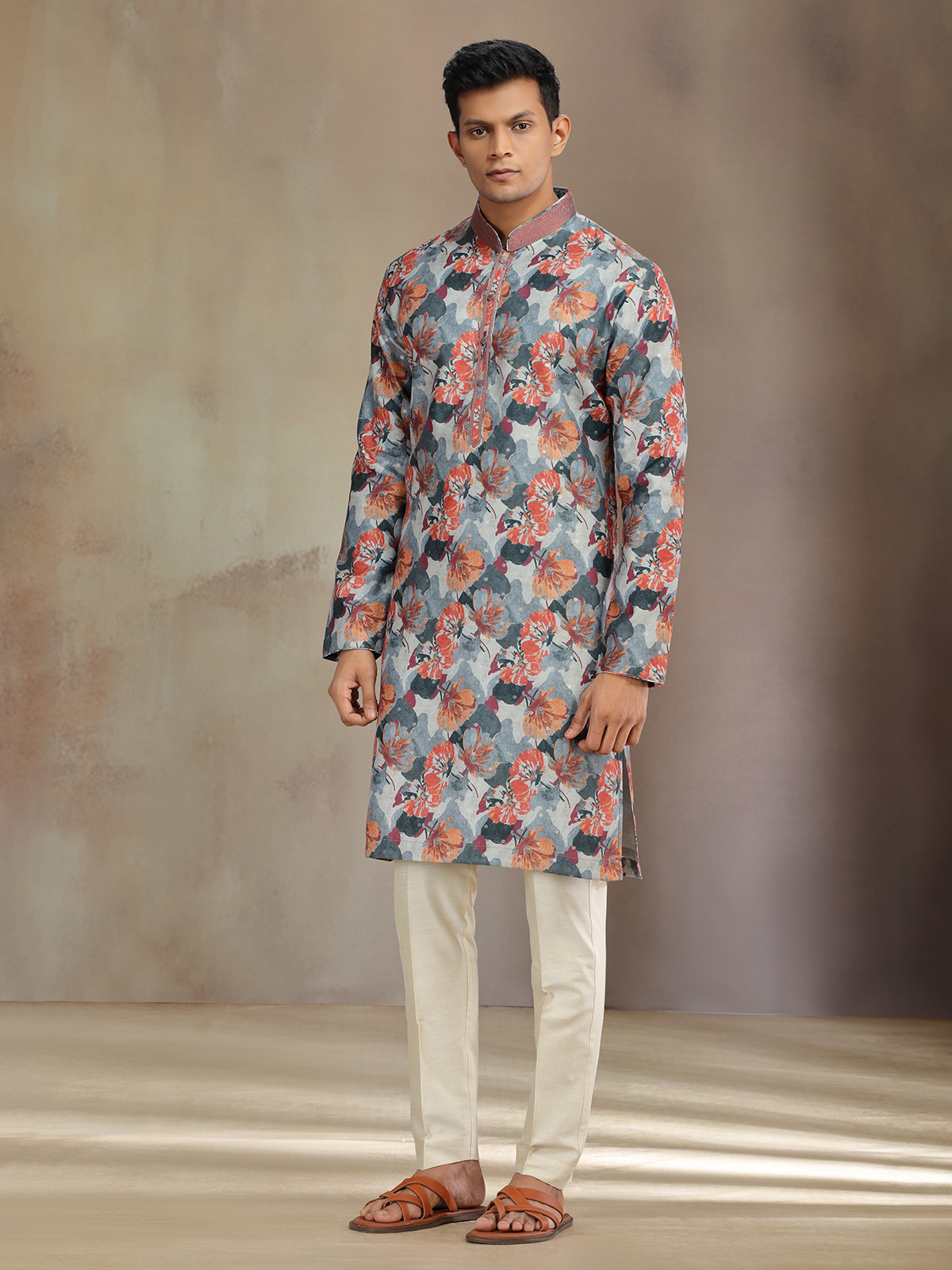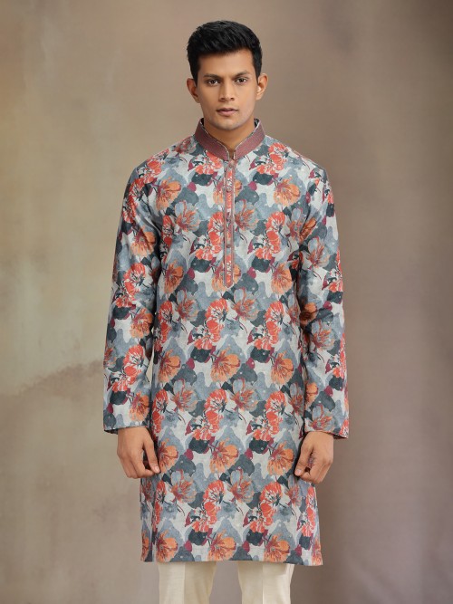 Grey Printed Jaquard Silk Festive Wear Kurta Pajama For Men