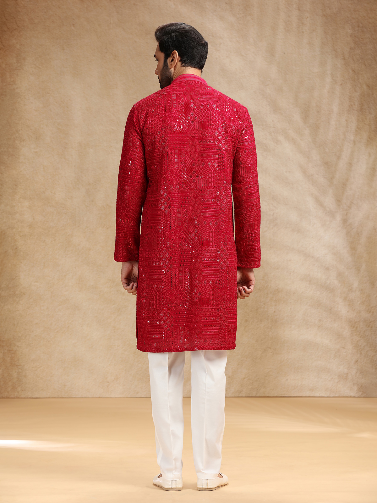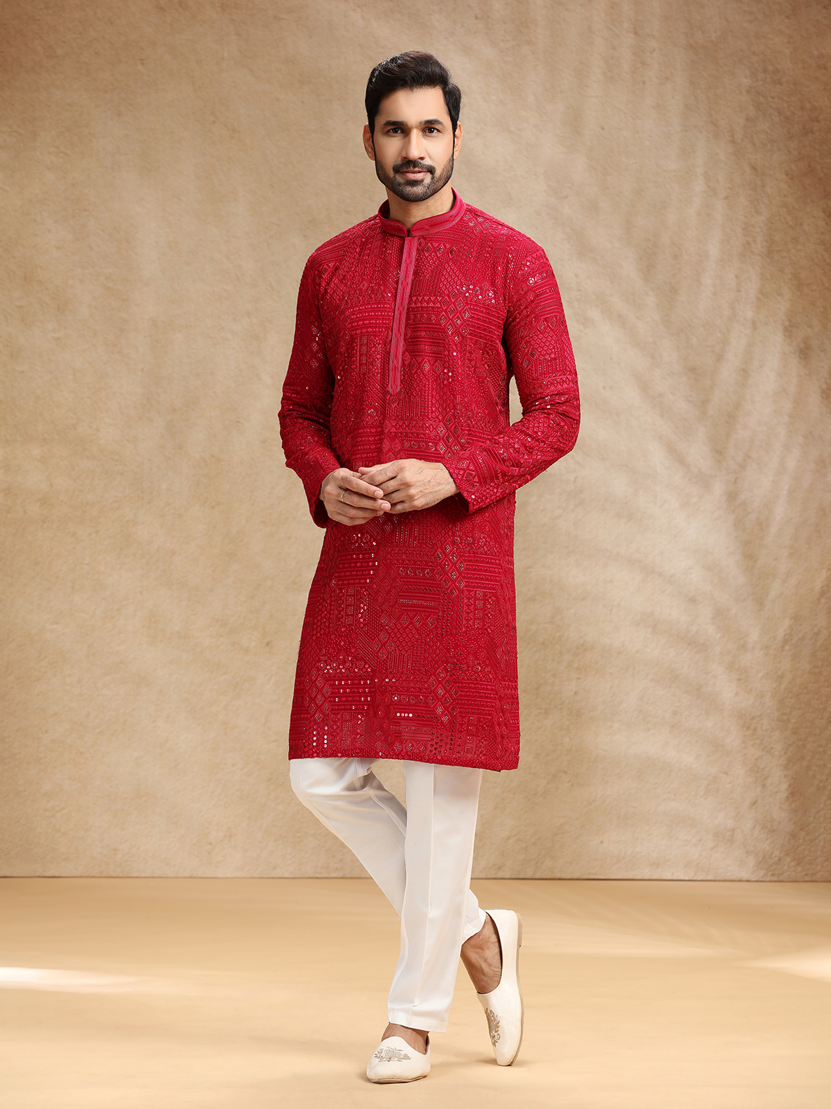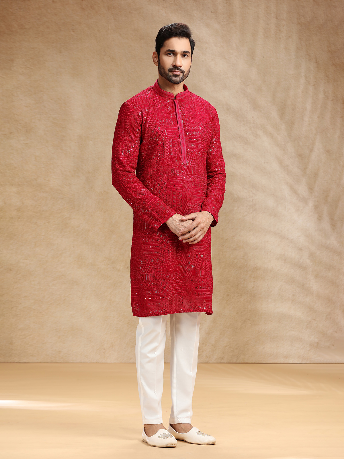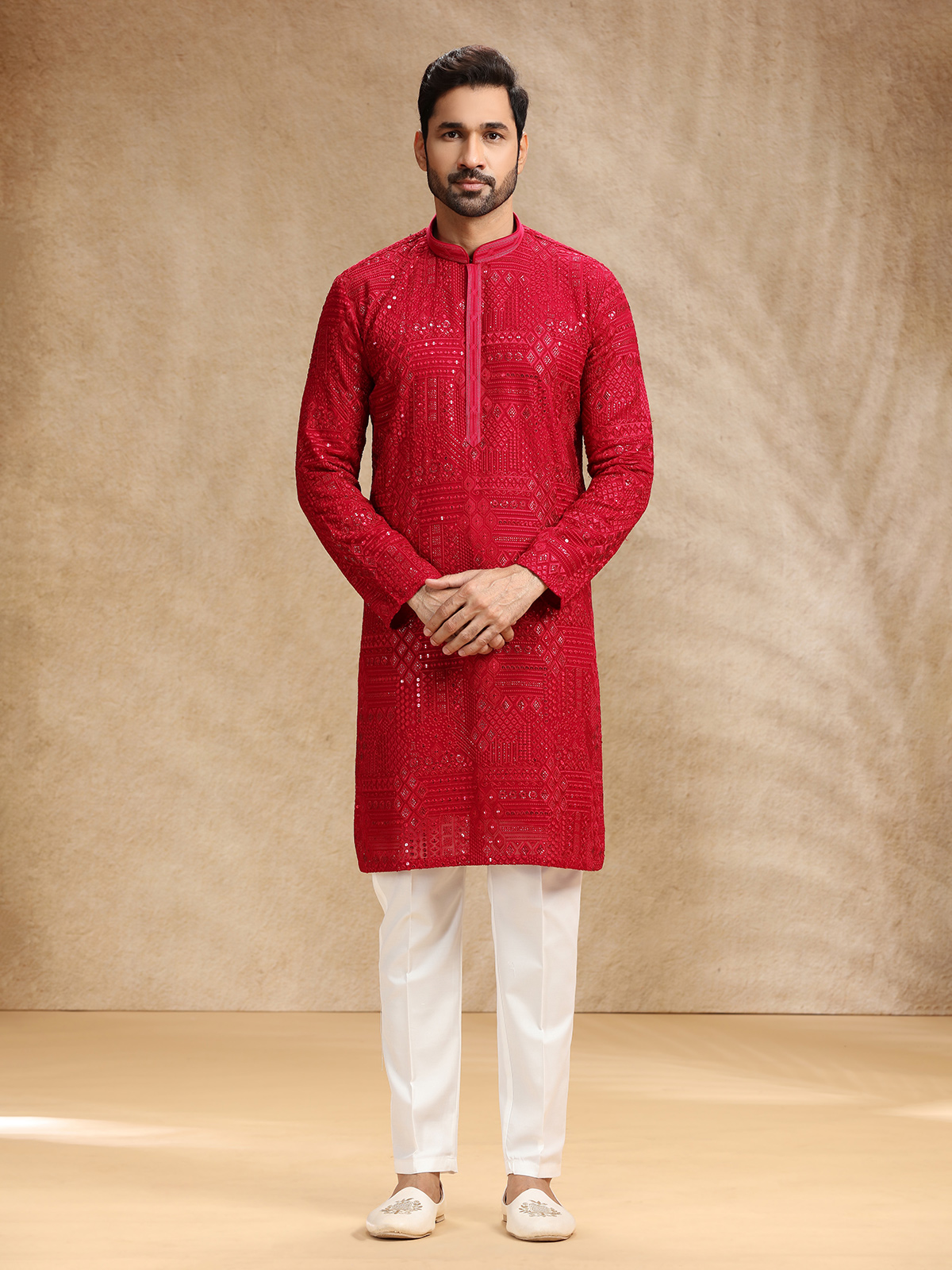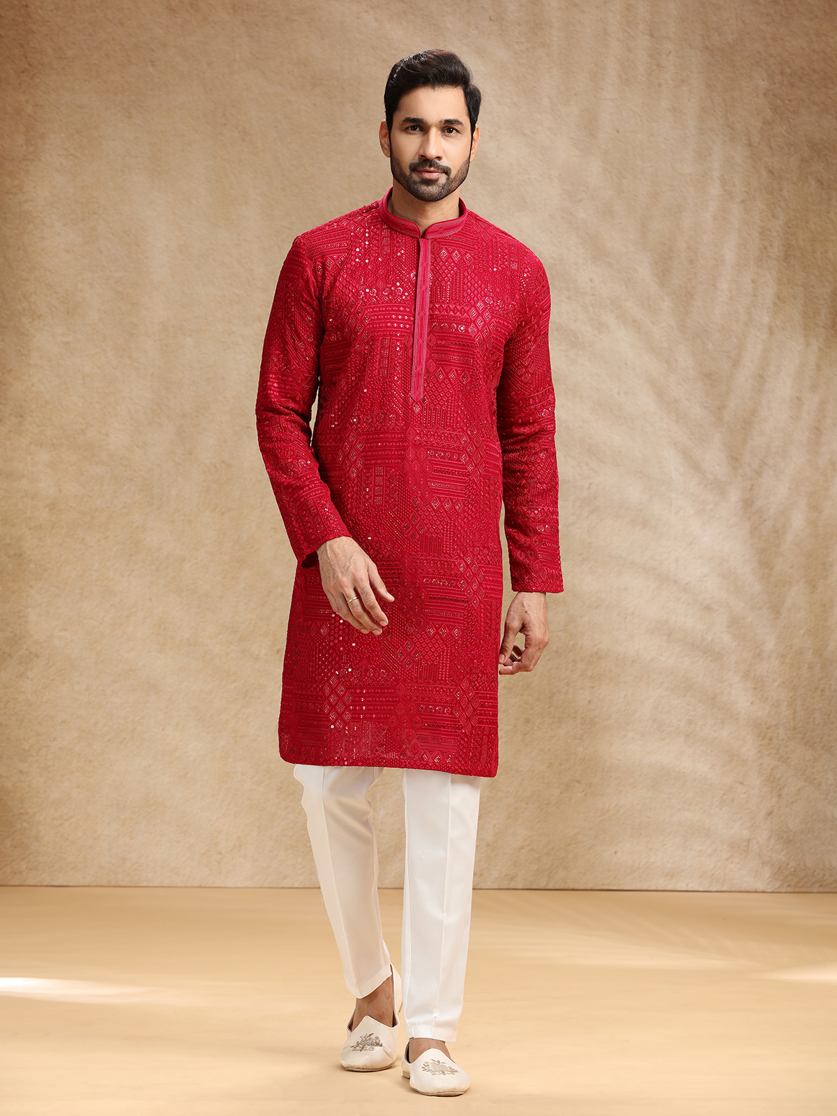 A vision of festive delight, this hot pink georgette kurta suit glows with resham and sequins work. A dignified stand collar with full sleeves lends elegance, while matching pants offer sleek charm. The lively pink hue radiates joyful sophistication, creating attire that balances purity and vibrancy—perfect for family functions and celebratory gatherings.