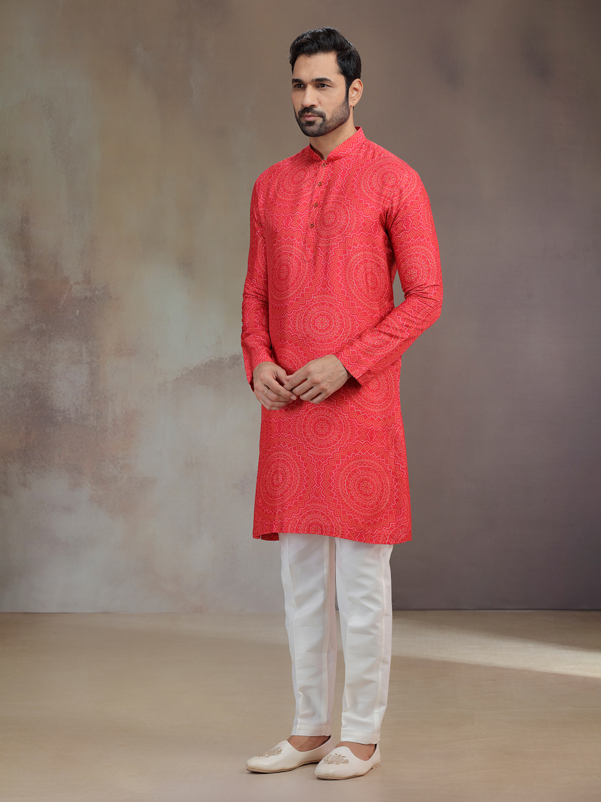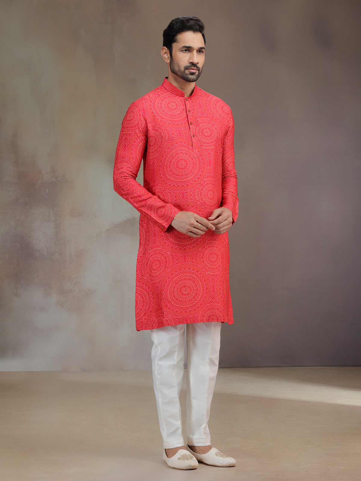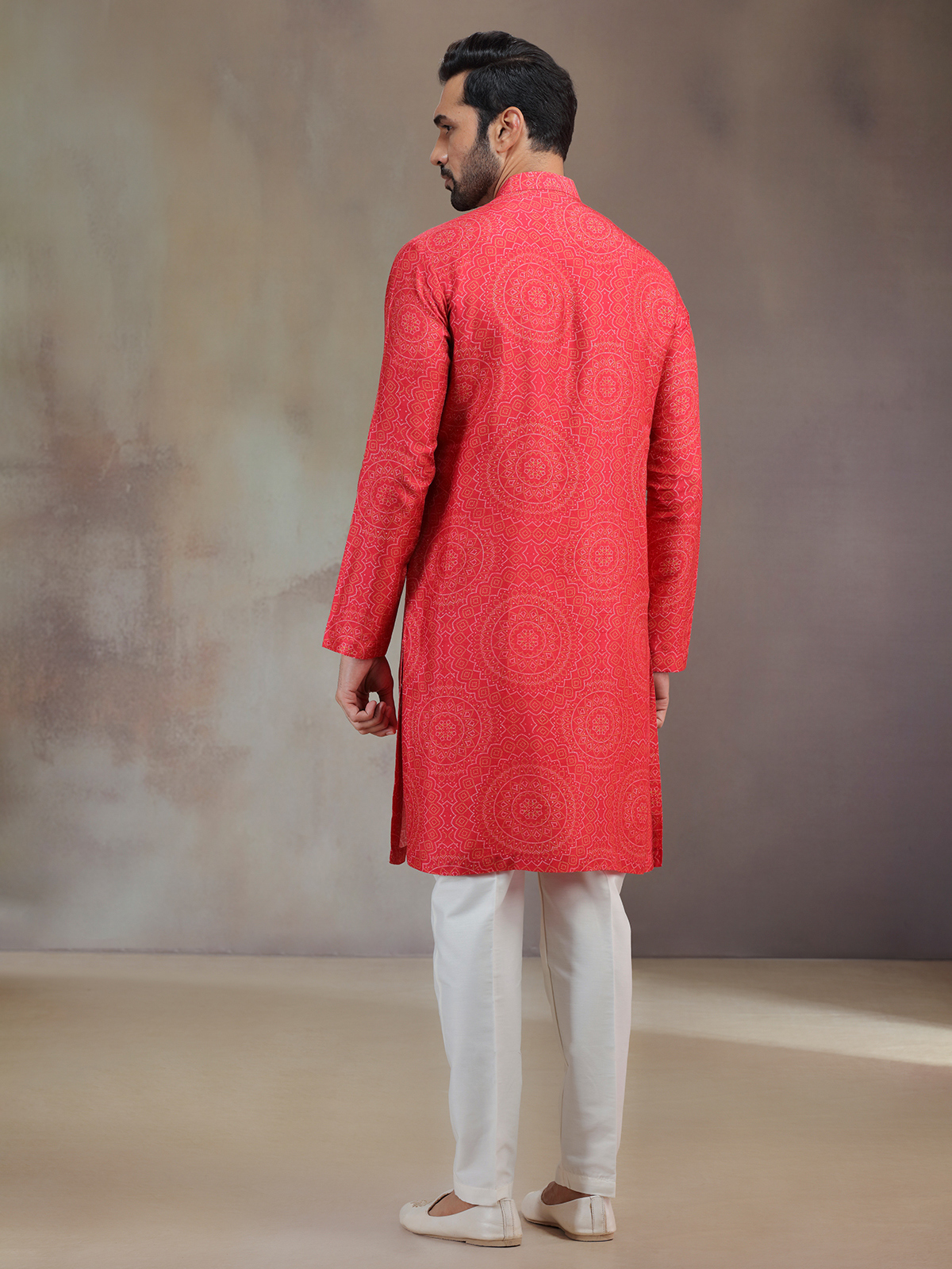 A striking hue meets artistic detail in this hot pink silk printed kurta pajama. The subtle work frames the mandarin collar and full sleeves, elevating the festive charm. Paired with pants, it creates a captivating outfit that resonates with traditional celebration.