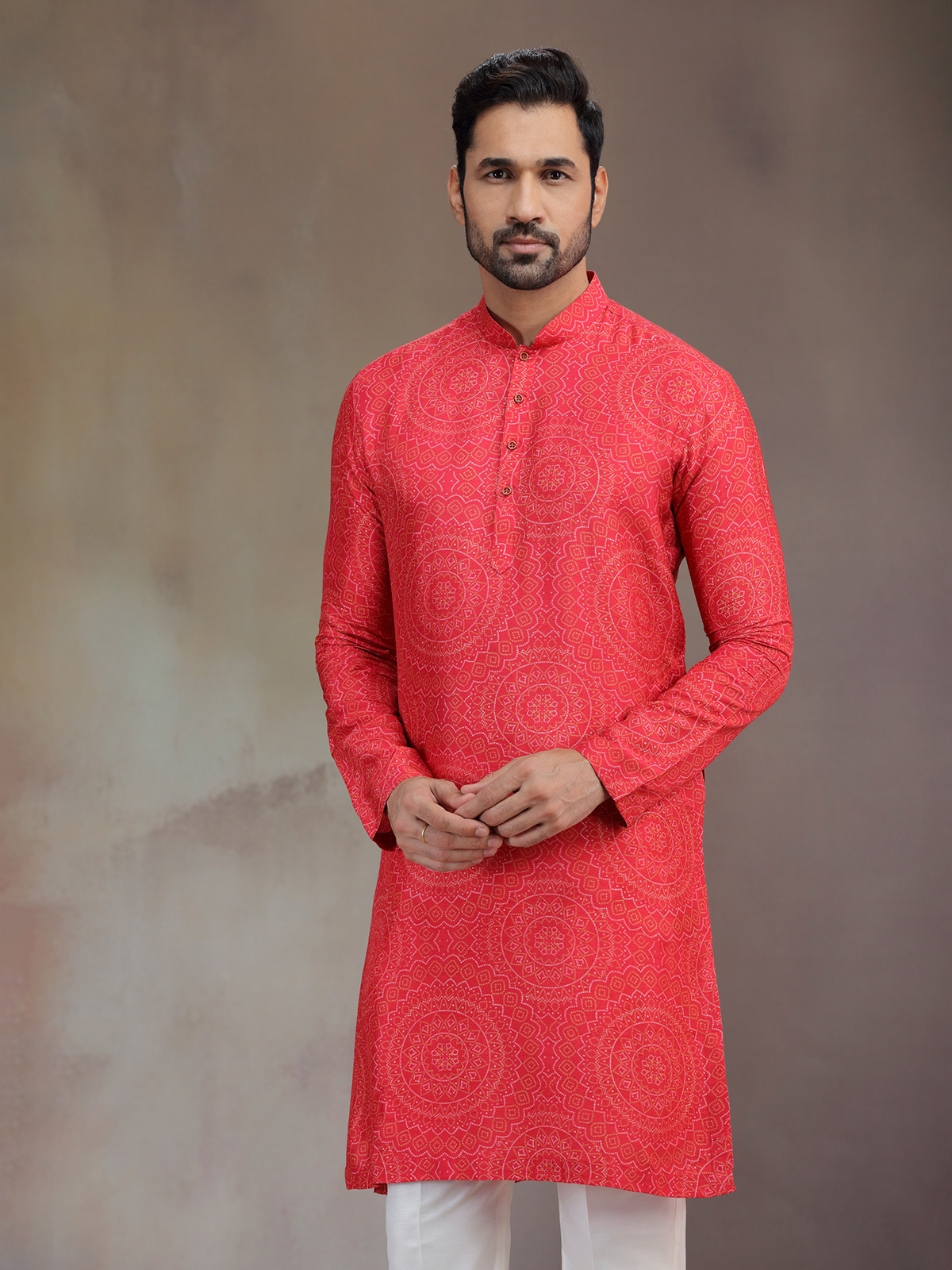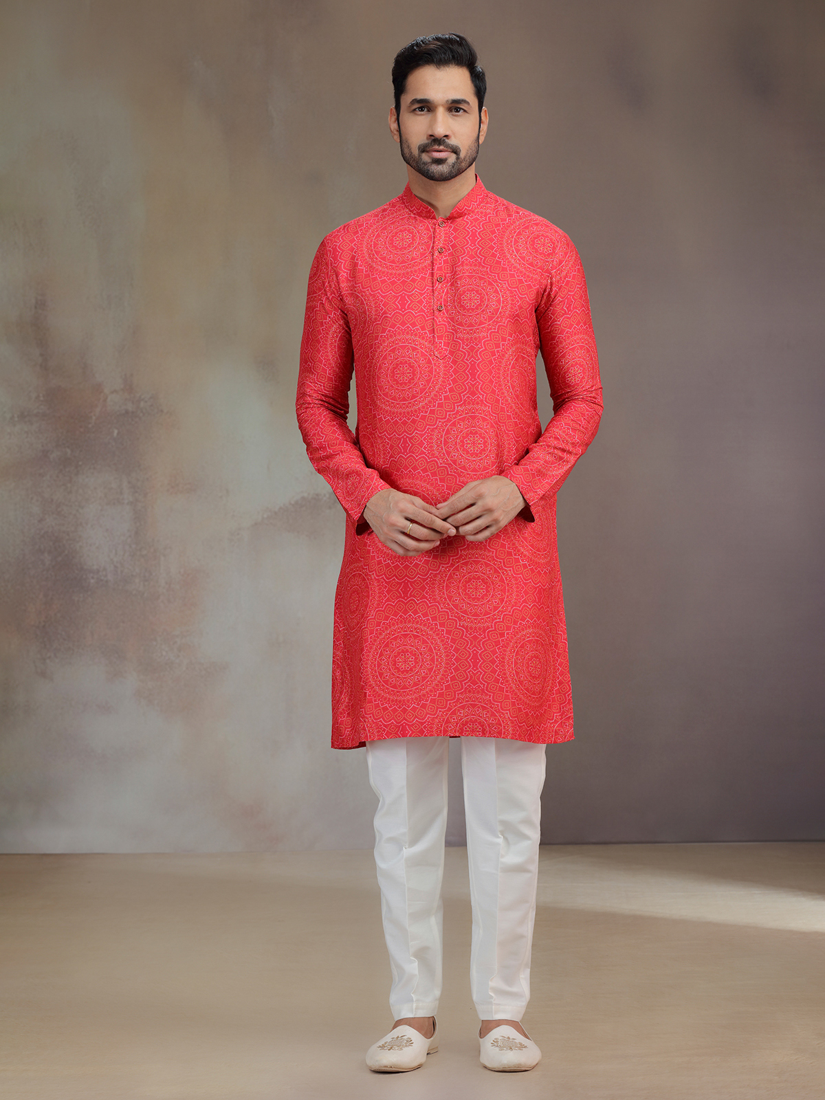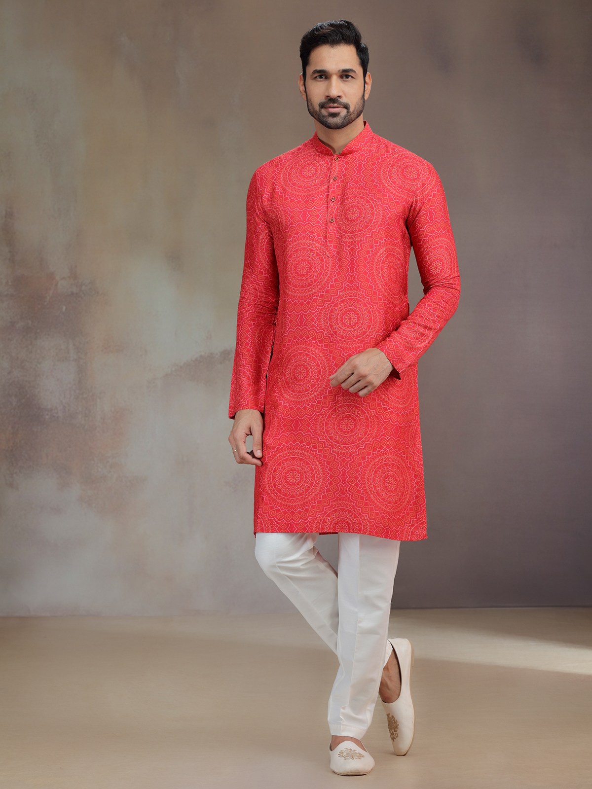 A striking hue meets artistic detail in this hot pink silk printed kurta pajama. The subtle work frames the mandarin collar and full sleeves, elevating the festive charm. Paired with pants, it creates a captivating outfit that resonates with traditional celebration.