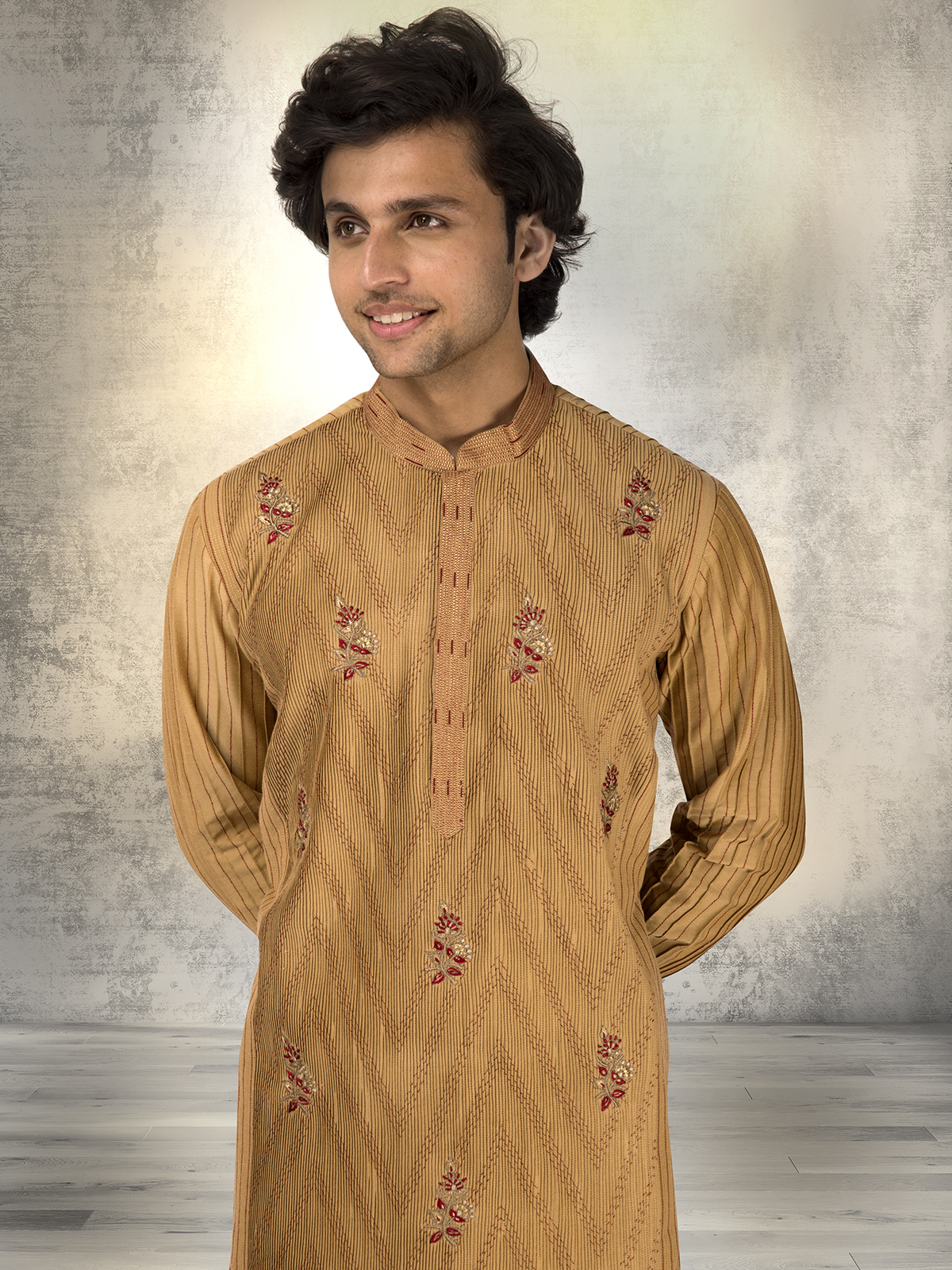 In regal khaki silk, this kurta suit gleams with intricate embroidery and resham detailing. The mandarin collar elevates its structured grace, paired with pants for a poised silhouette. Designed for weddings and receptions, it exudes calm grandeur.