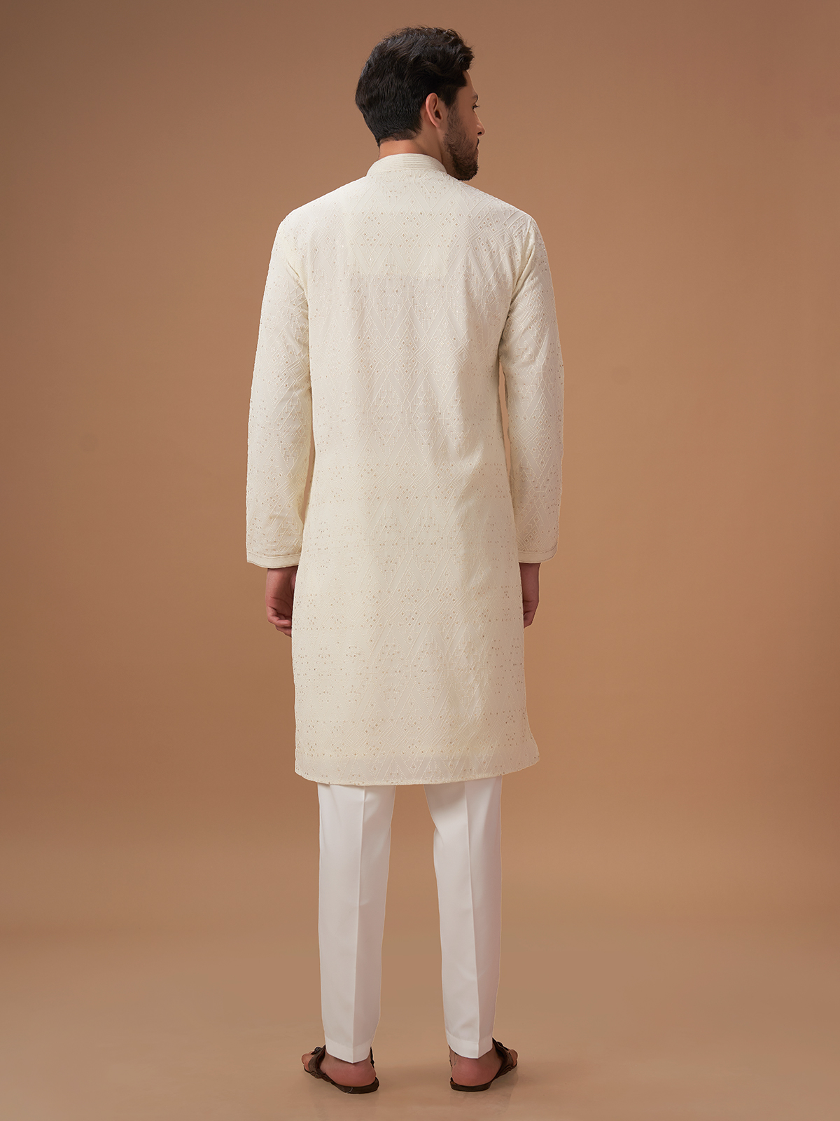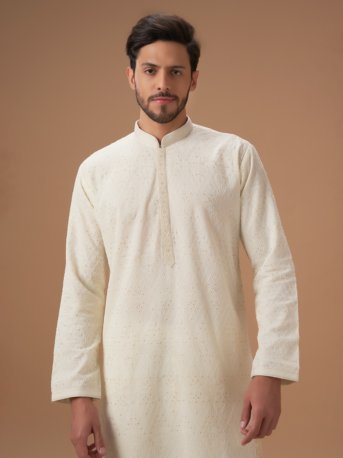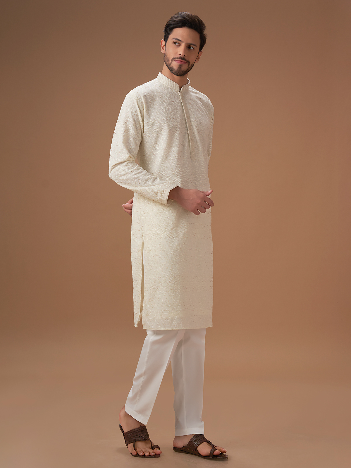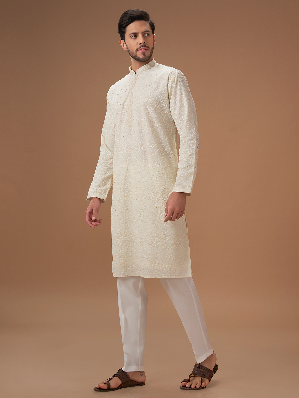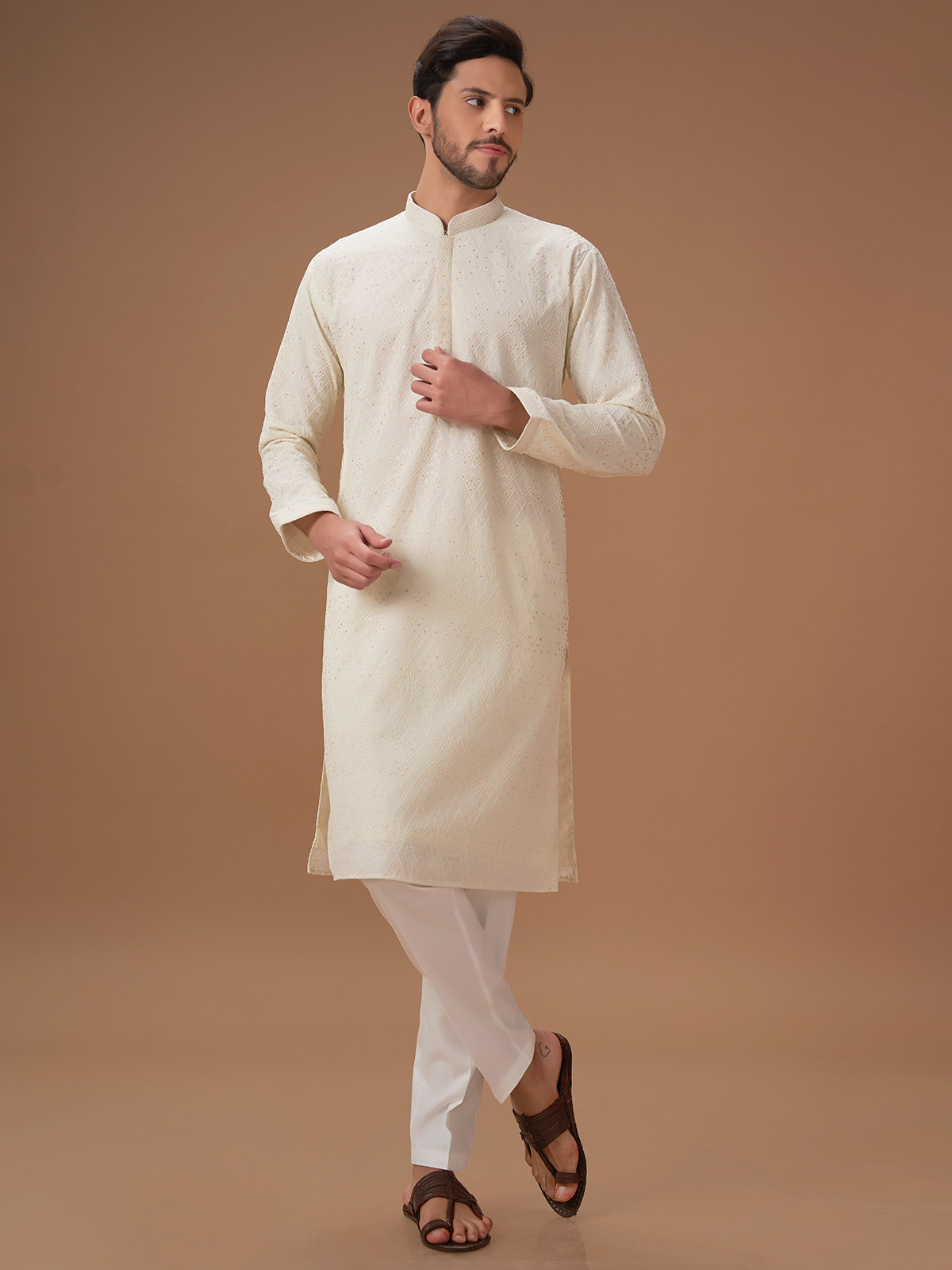 Cream Embroidery Kurta Pajama For Men