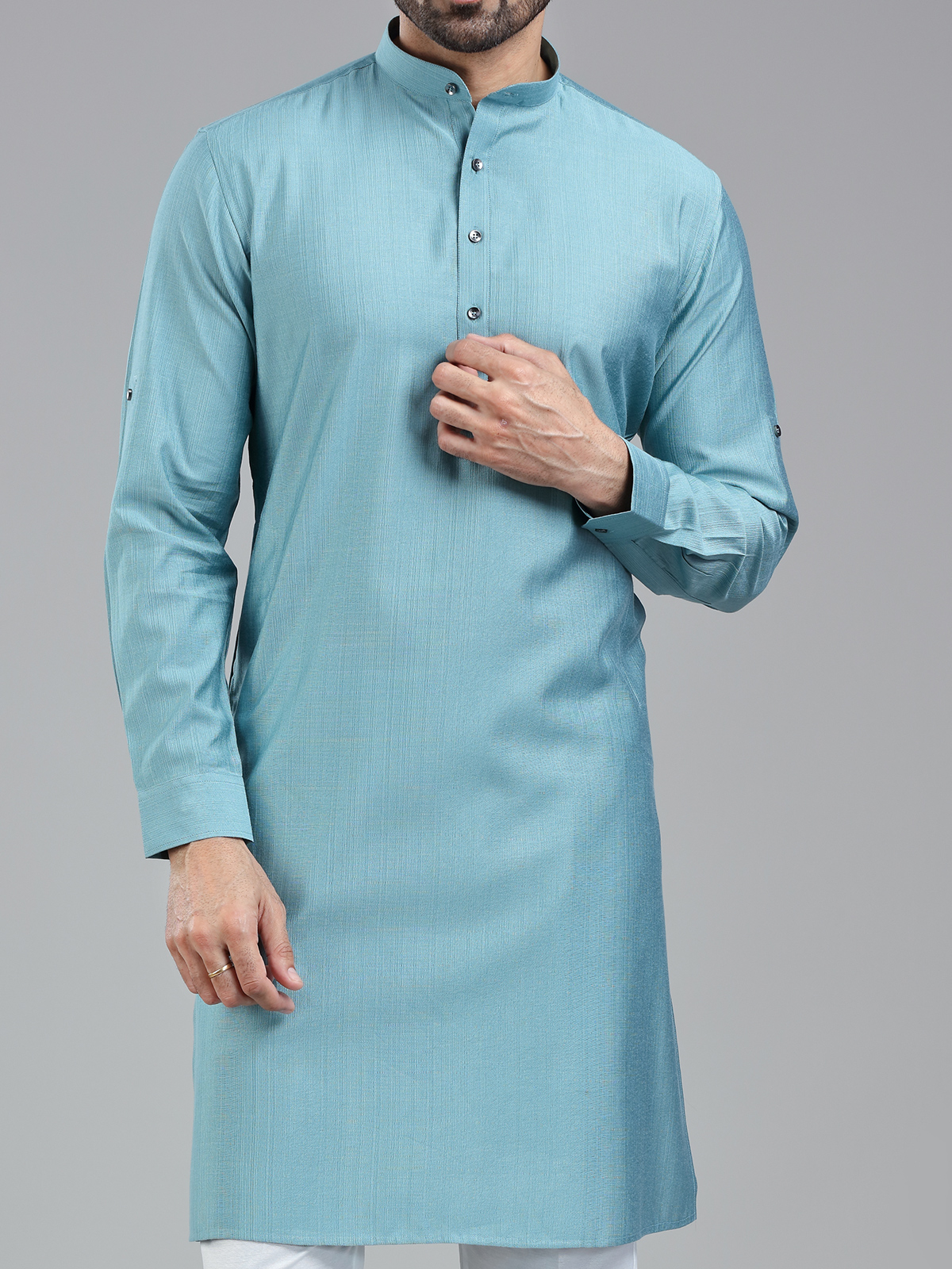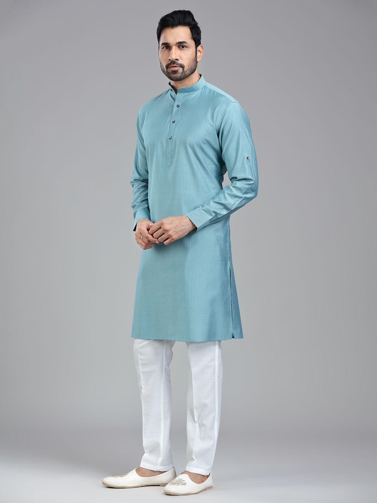 This vibrant firozi blue kurta suit adds a burst of color to any festive occasion. Made from rayon cotton fabric, its simple yet elegant design features a mandarin collar for added comfort. The white bottom completes the ensemble.