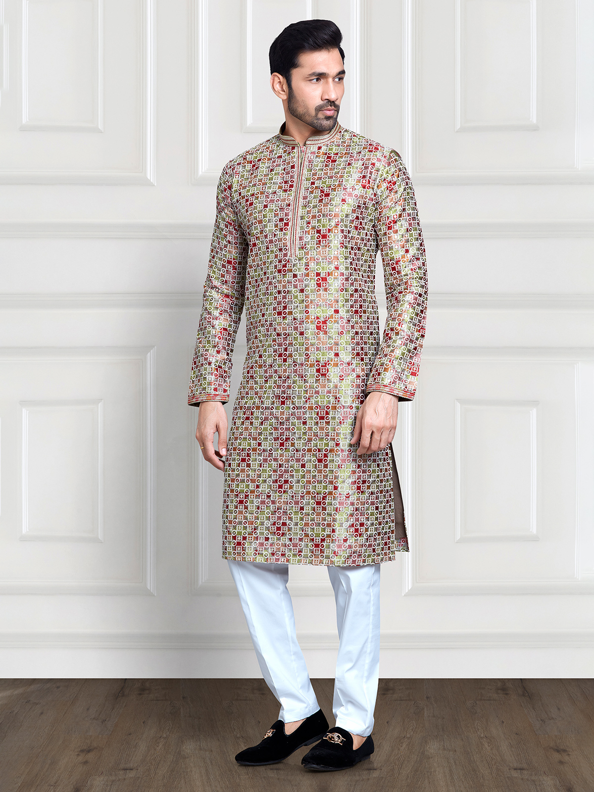 Make a lasting fashion statement with this grey printed kurta suit. Adorned with exquisite embroidery and sequins work, the ensemble showcases a mandarin collar and full sleeves, adding a festive and stylish touch to your overall look.