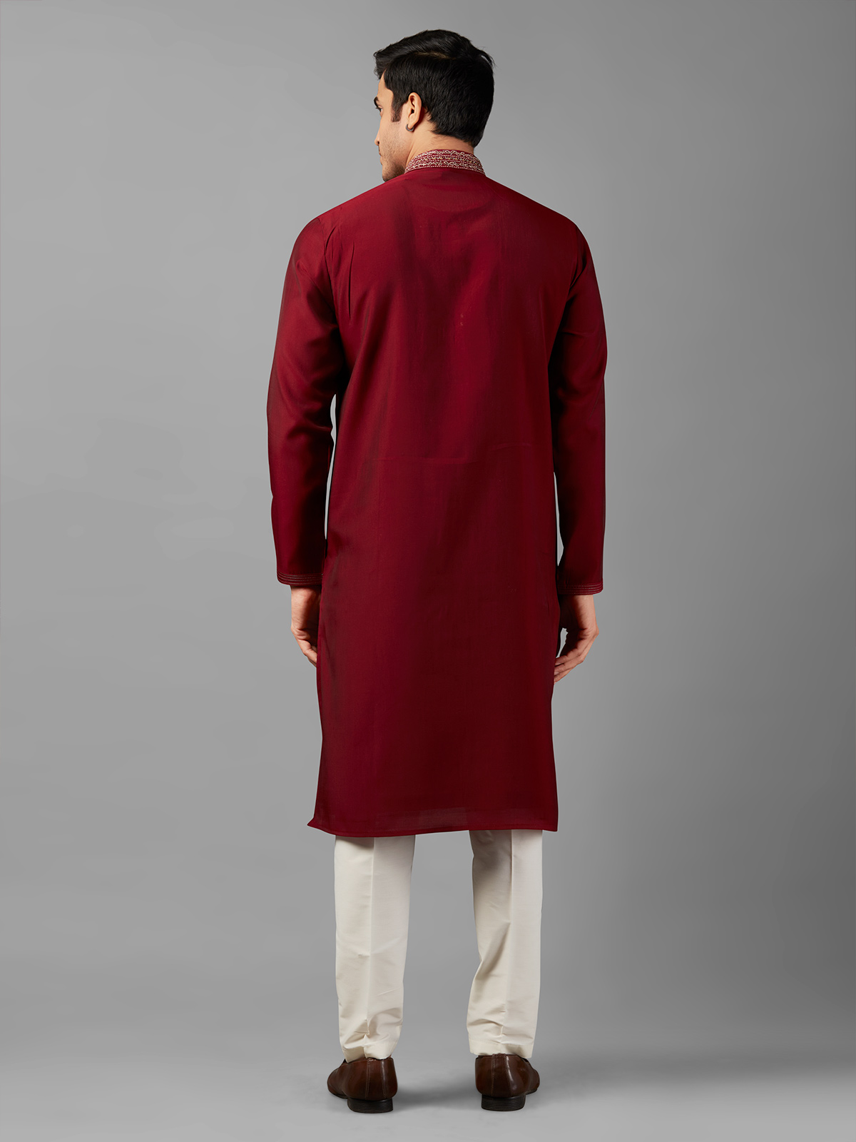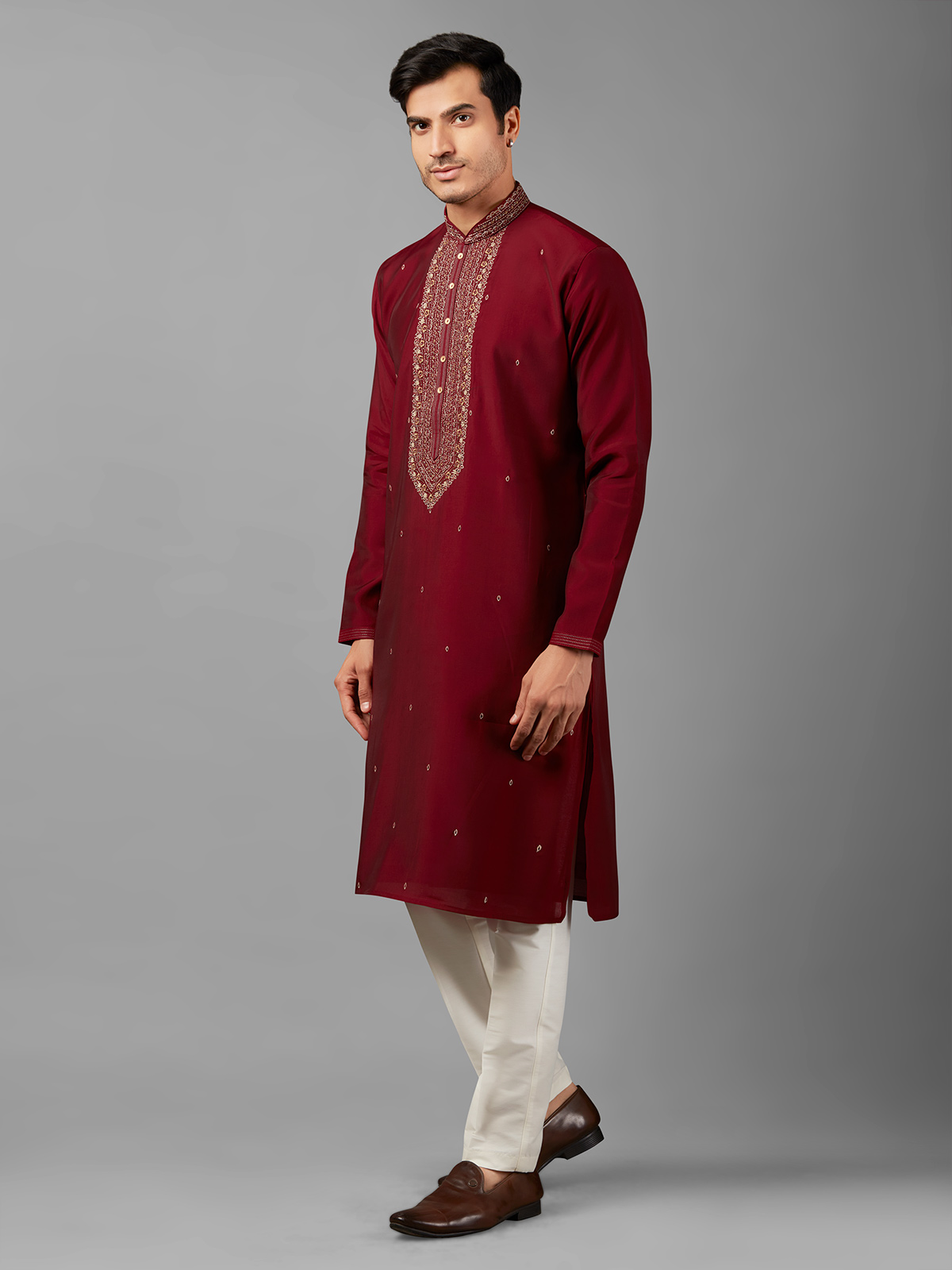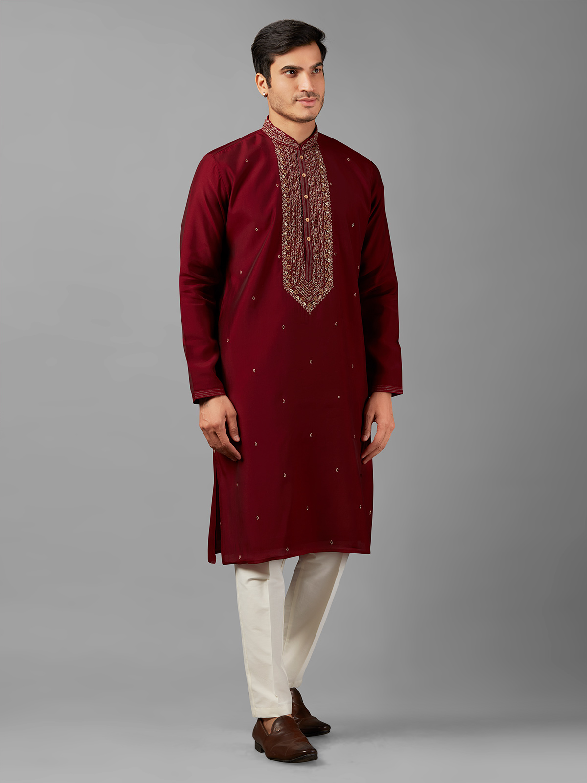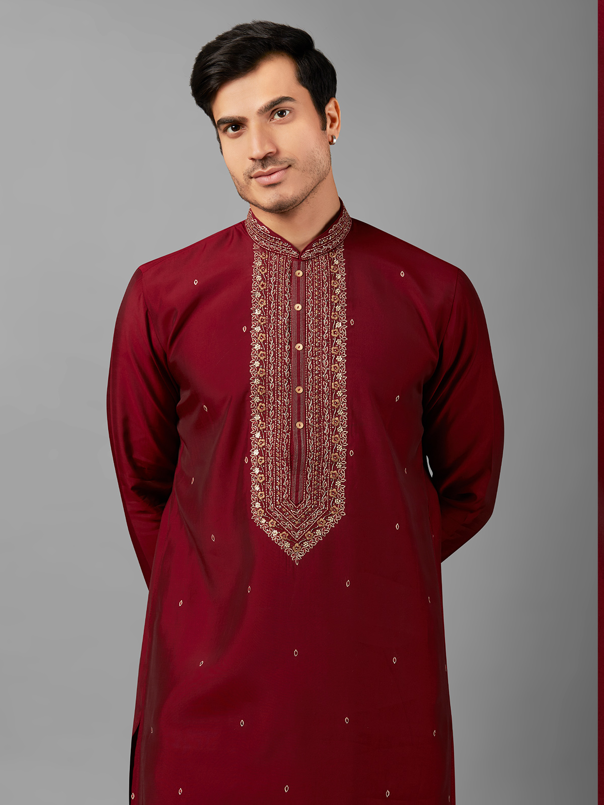 Achieve a classic festive look with the maroon silk kurta suit, featuring resham, sequins, and cutdana work. Its mandarin collar and full sleeves offer timeless elegance, paired with a bottom for a complete outfit.