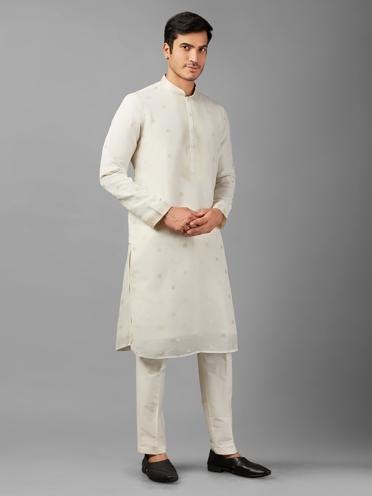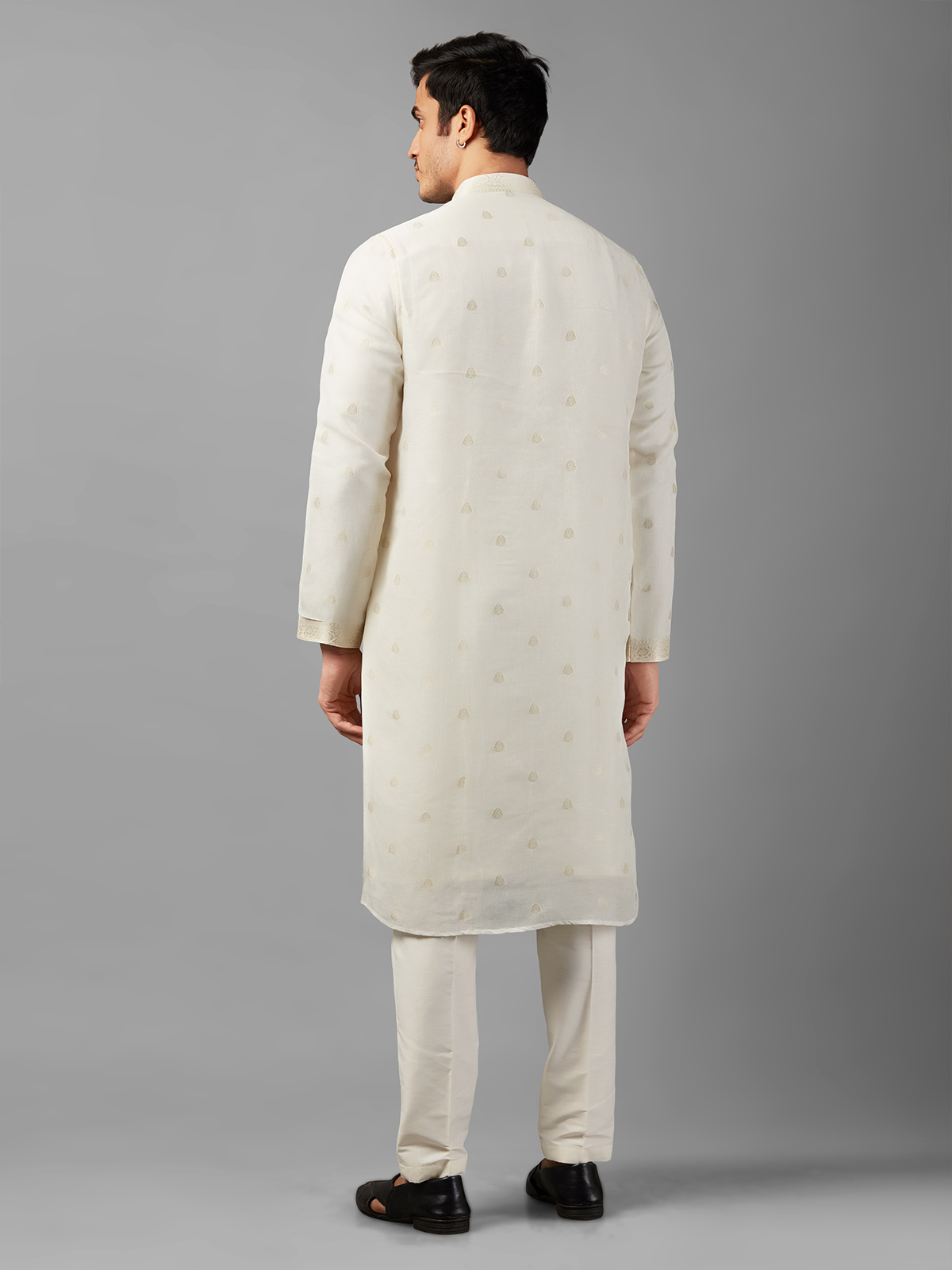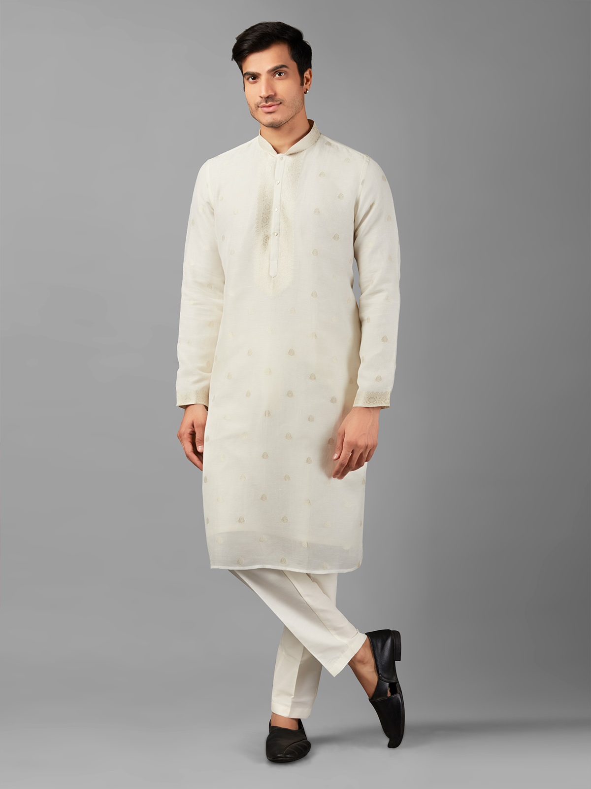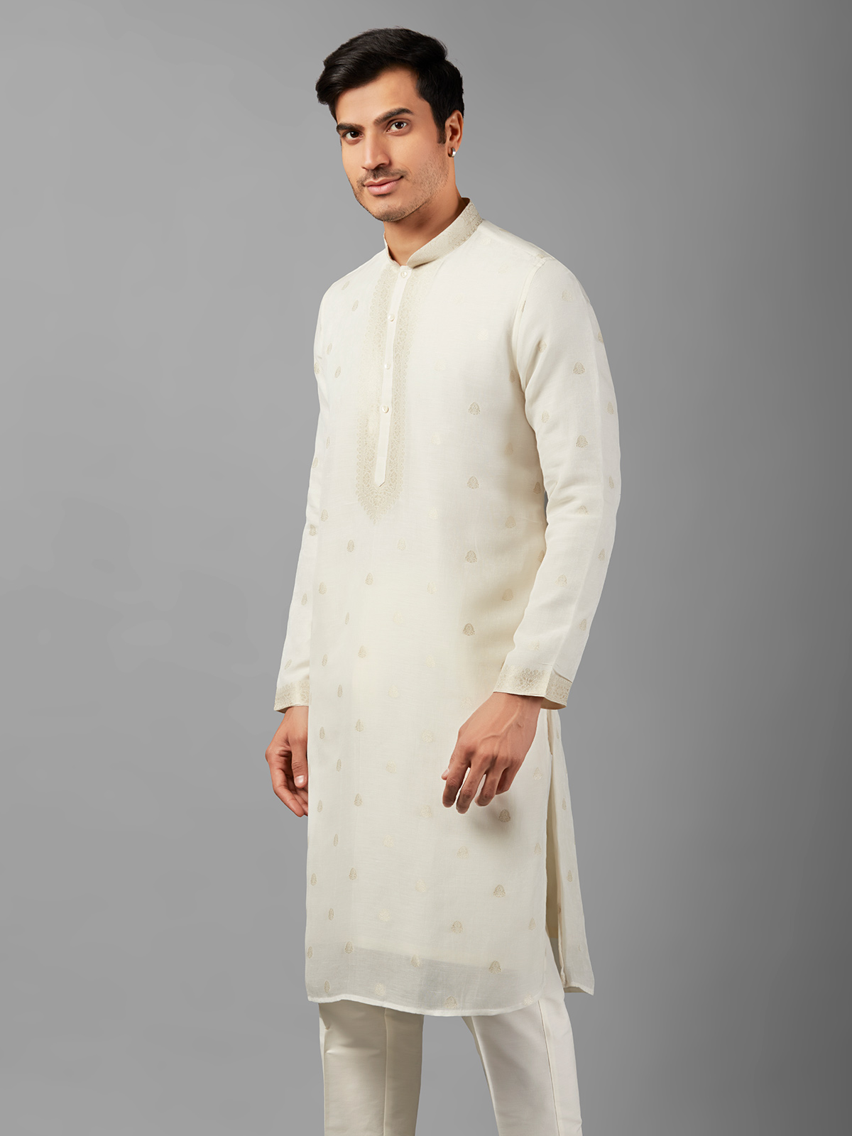 Embrace elegance in our off-white linen festive kurta suit from the newest collection. Enjoy ultimate comfort with its mandarin collar and full sleeves, while the festive zari weaving design adds a touch of traditional charm. Comes with a bottom.