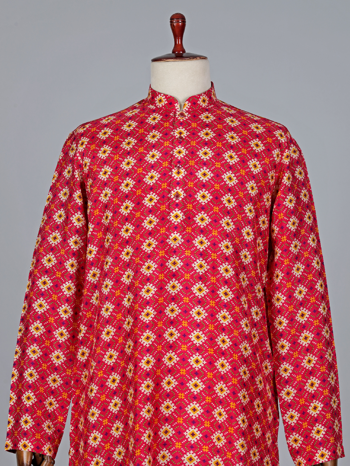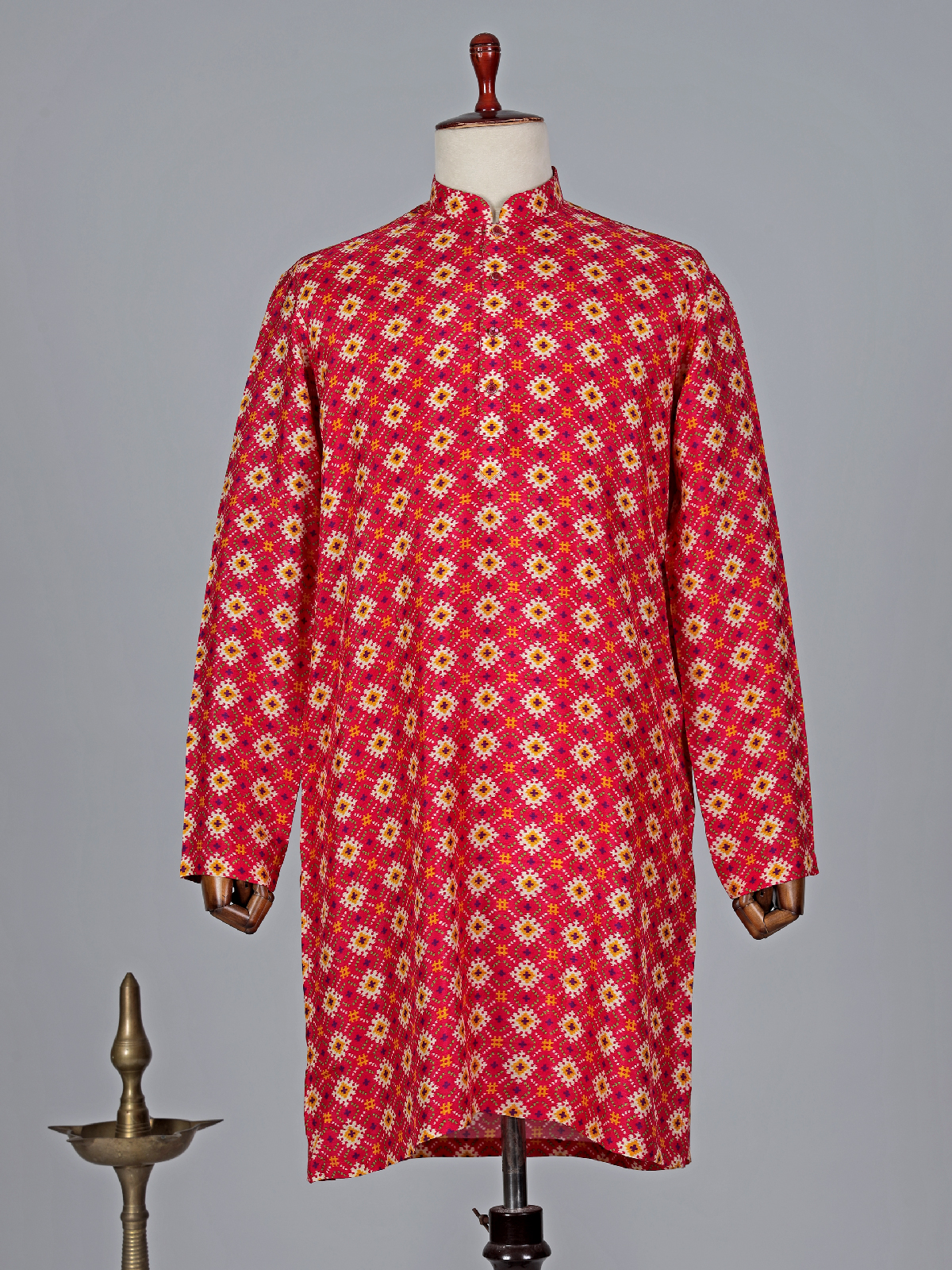 This red cotton printed kurta suit will give you a unique and eye catching look. It has a mandarin collar and full sleeves. Paired with a white bottom.