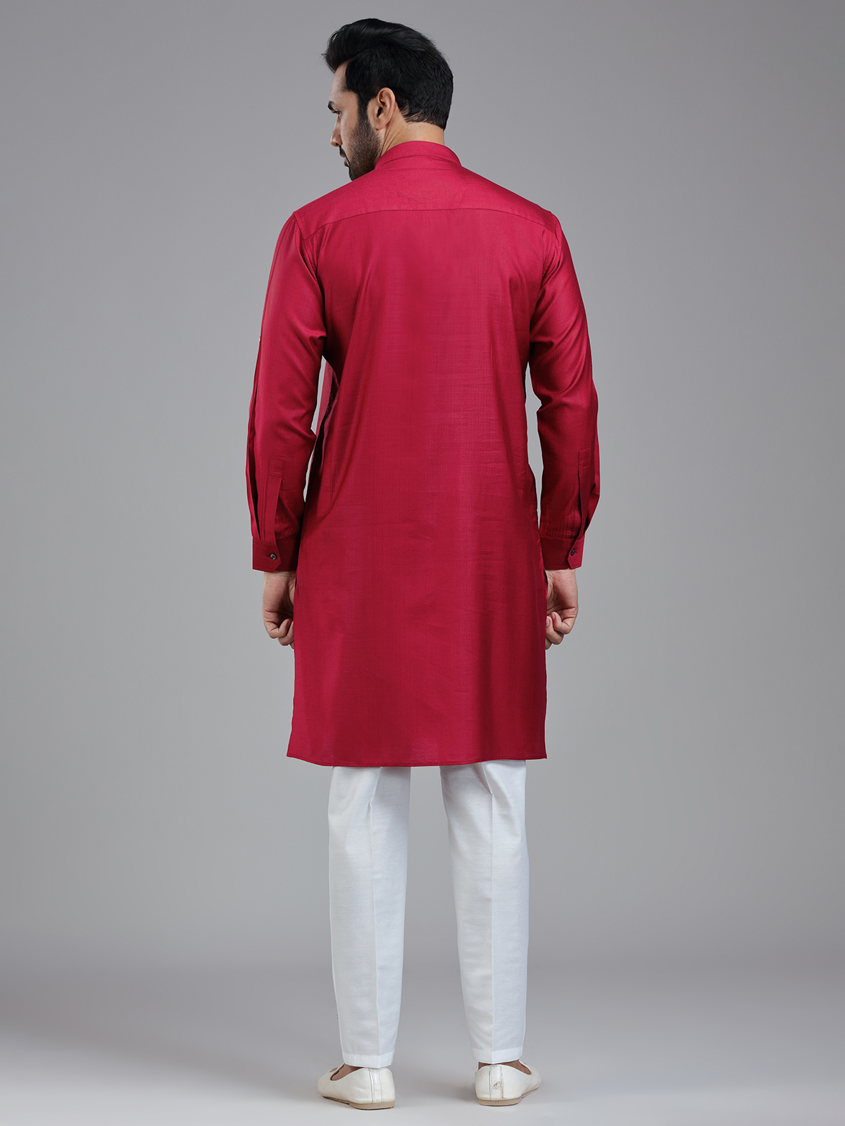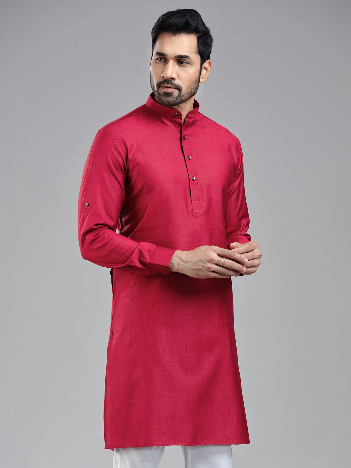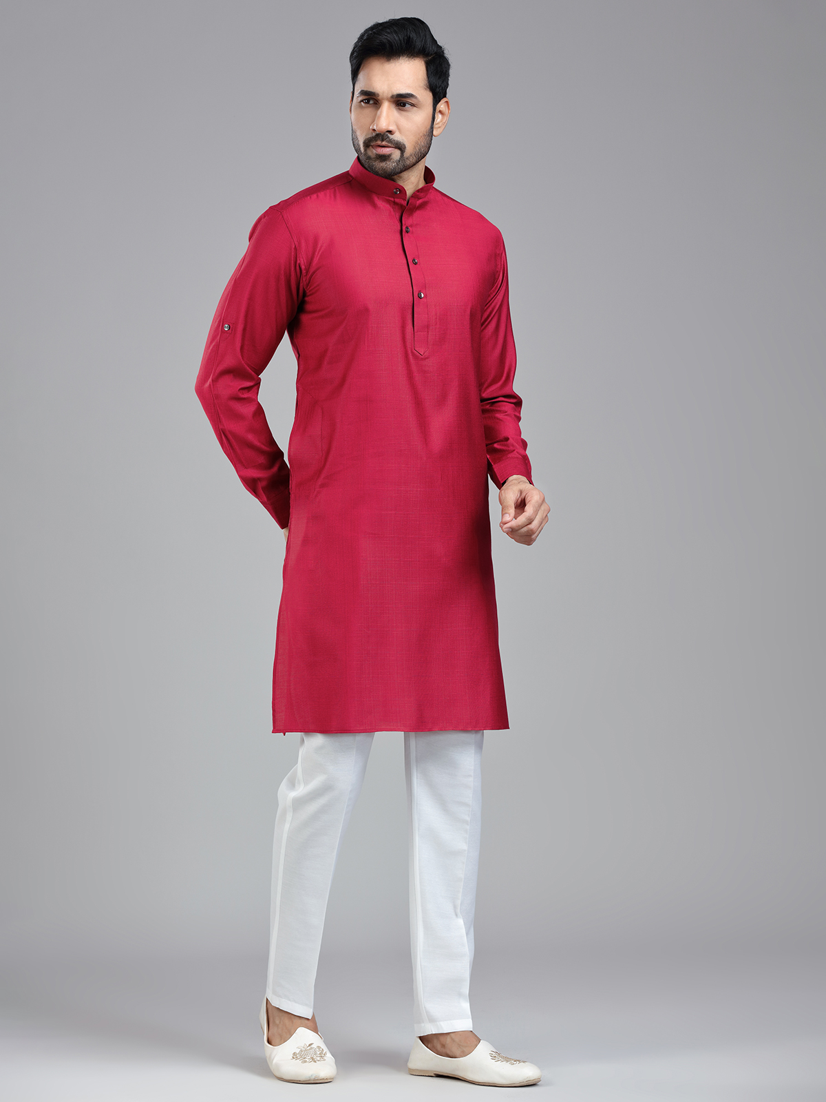 Defined by its classic red hue, this kurta suit is the epitome of elegance. Made from rayon cotton fabric, the sober design makes it perfect for festive occasions, while the mandarin collar and white bottom create a coordinated ensemble.
