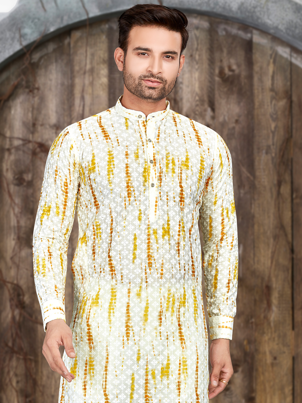 Radiate ethnic charm in our yellow cotton printed kurta suit, perfect for every festive affair. The exquisite embroidery, mandarin collar, and full sleeves make it a standout piece in your collection. Complete with a bottom.