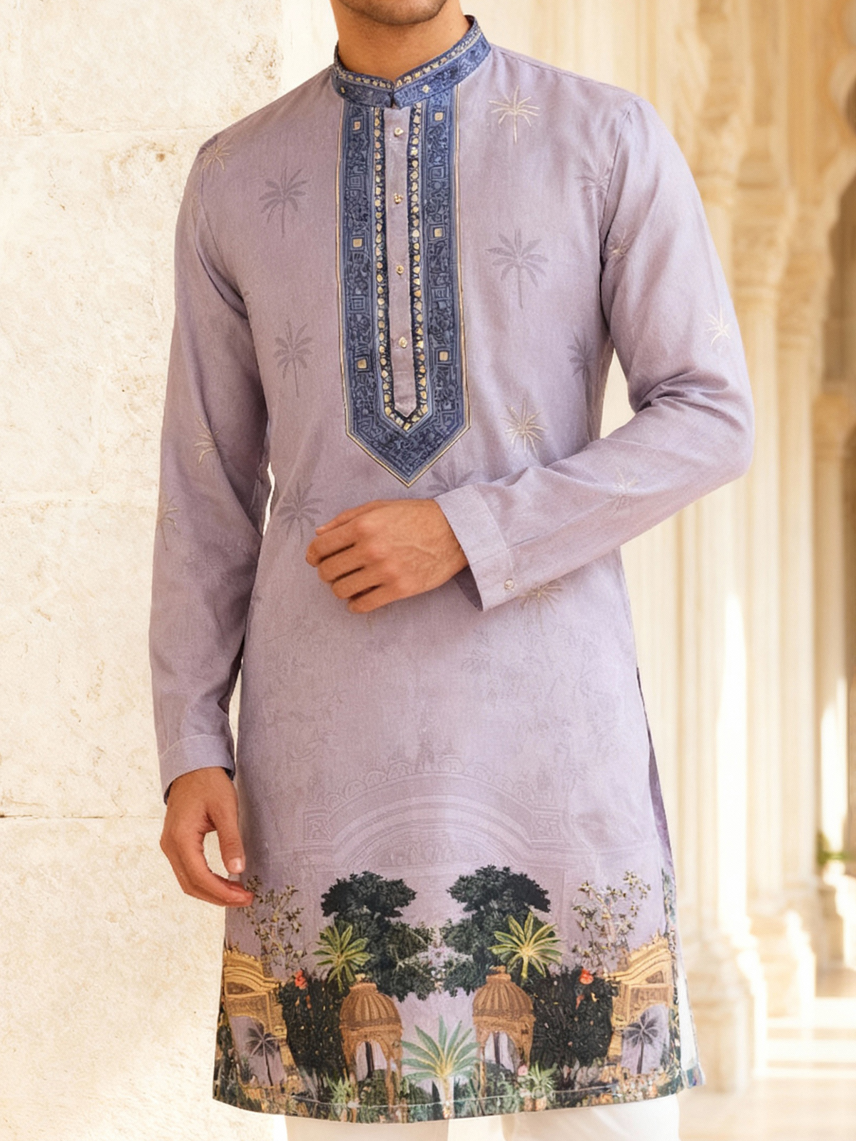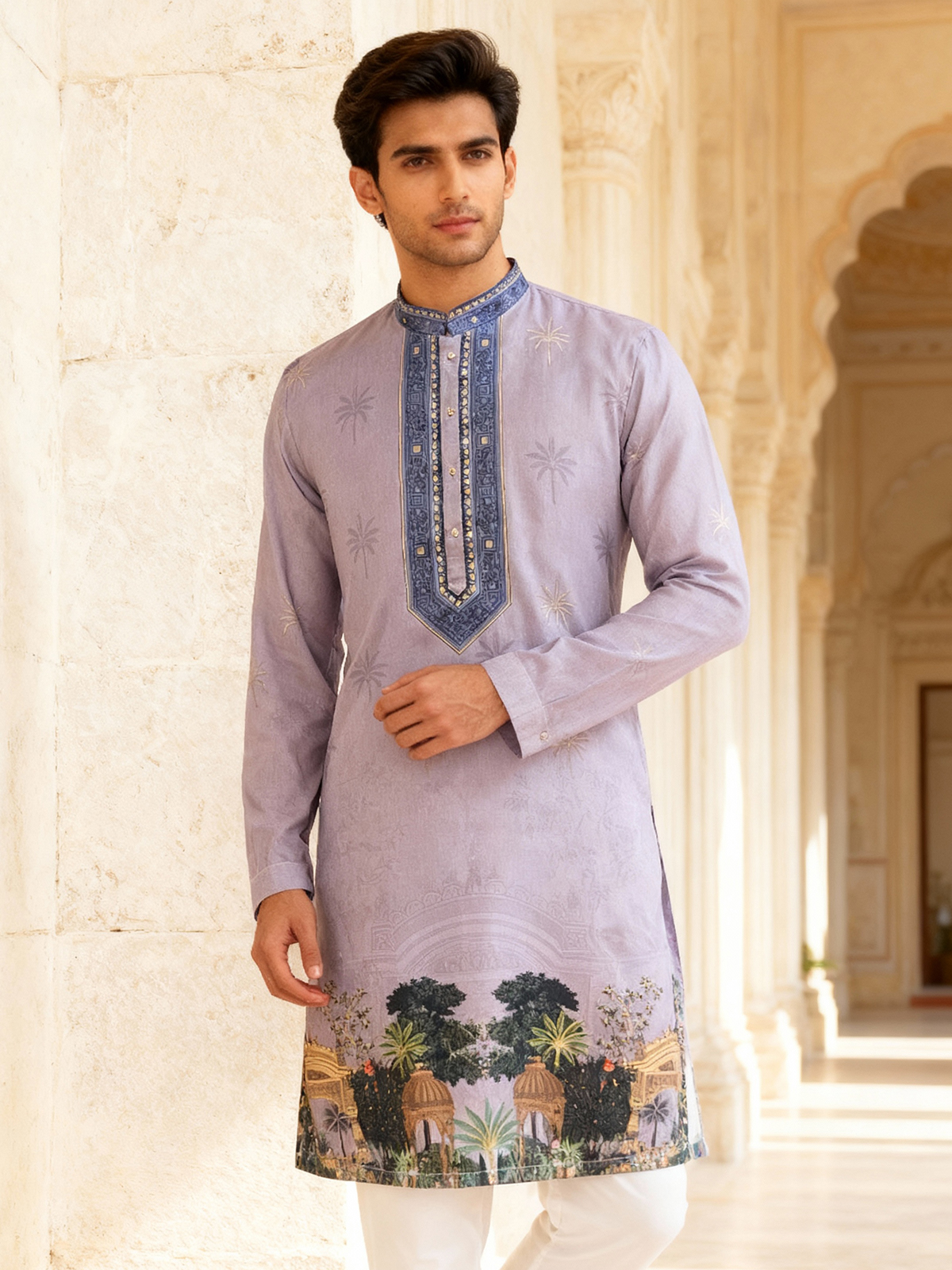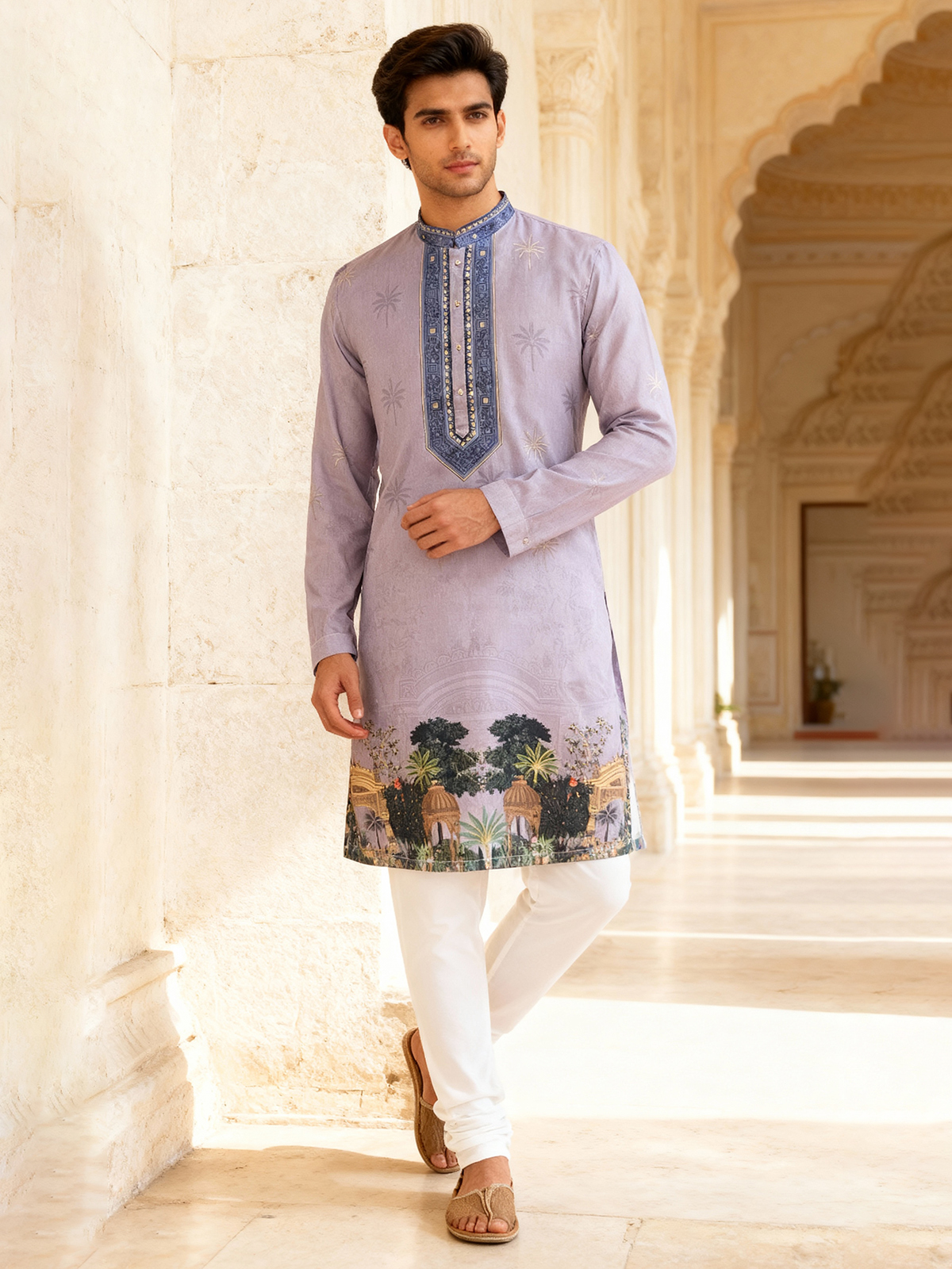 Exuding soft elegance, this lavender purple cotton silk kurta features intricate daman prints. The Chinese collar and full sleeves enhance its refined silhouette, while coordinated pants complete the festive look.