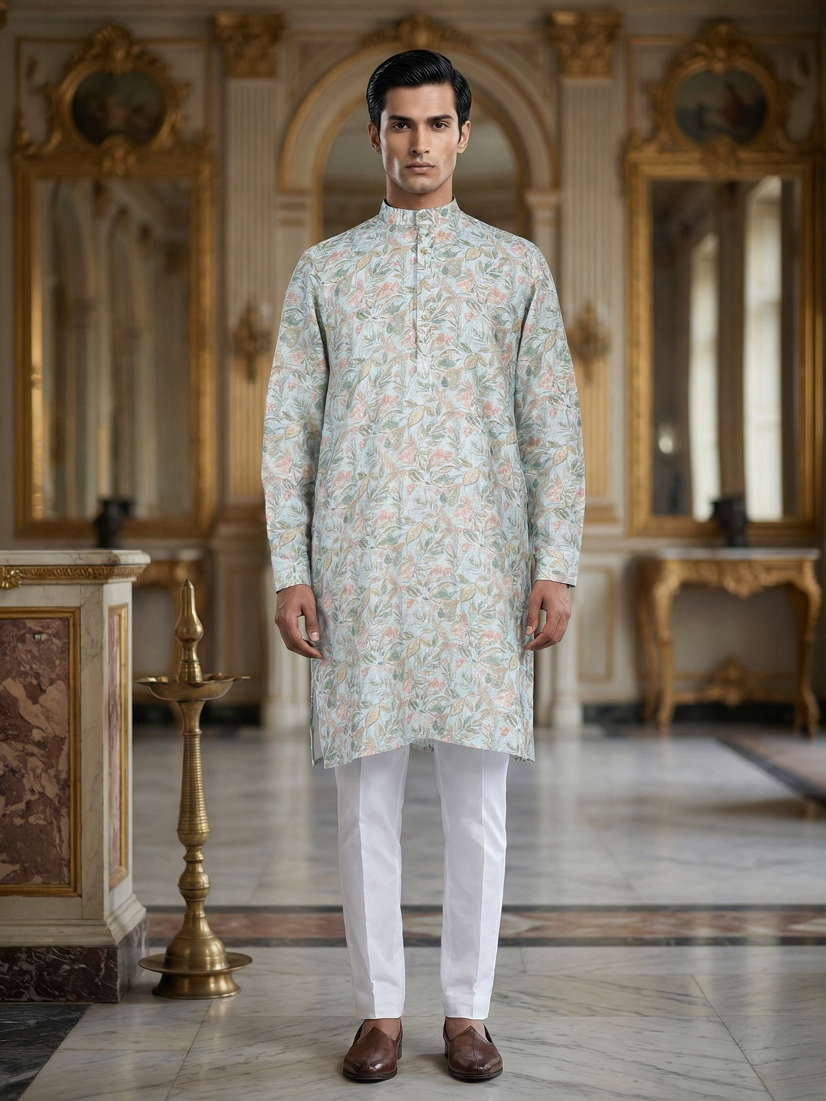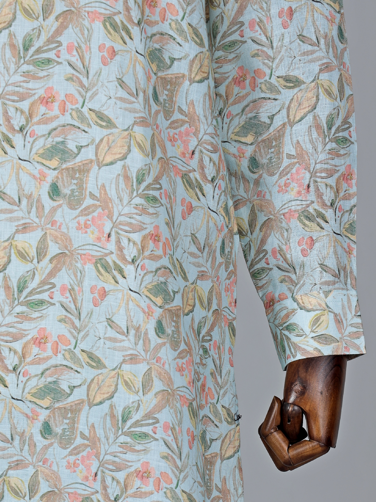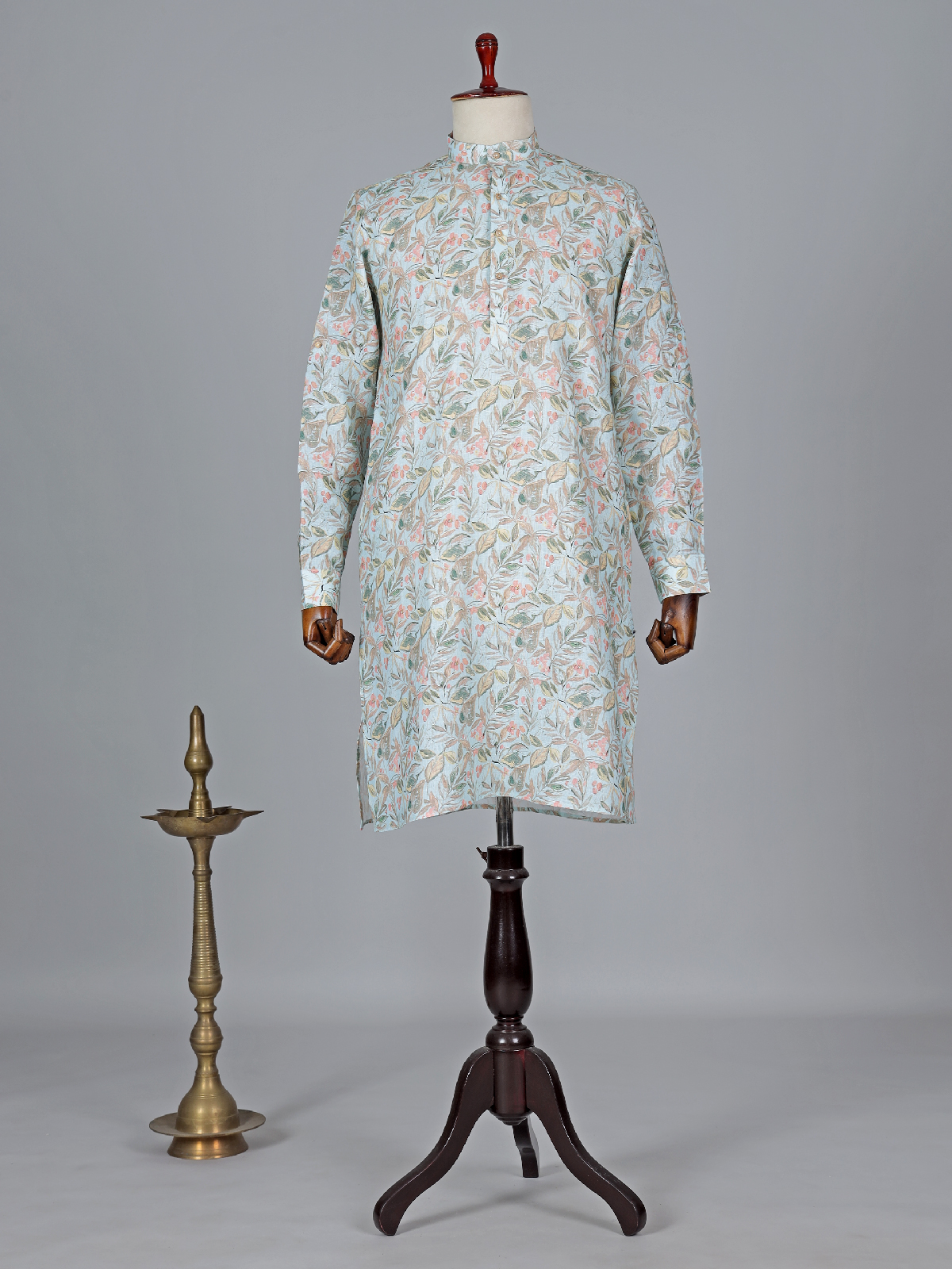 State your ethnic look with this sky blue cotton kurta suit. The leaf print gives it a modern look at any festive occasion. It has the Mandarin and full sleeves. A bottom complete the entire look.
