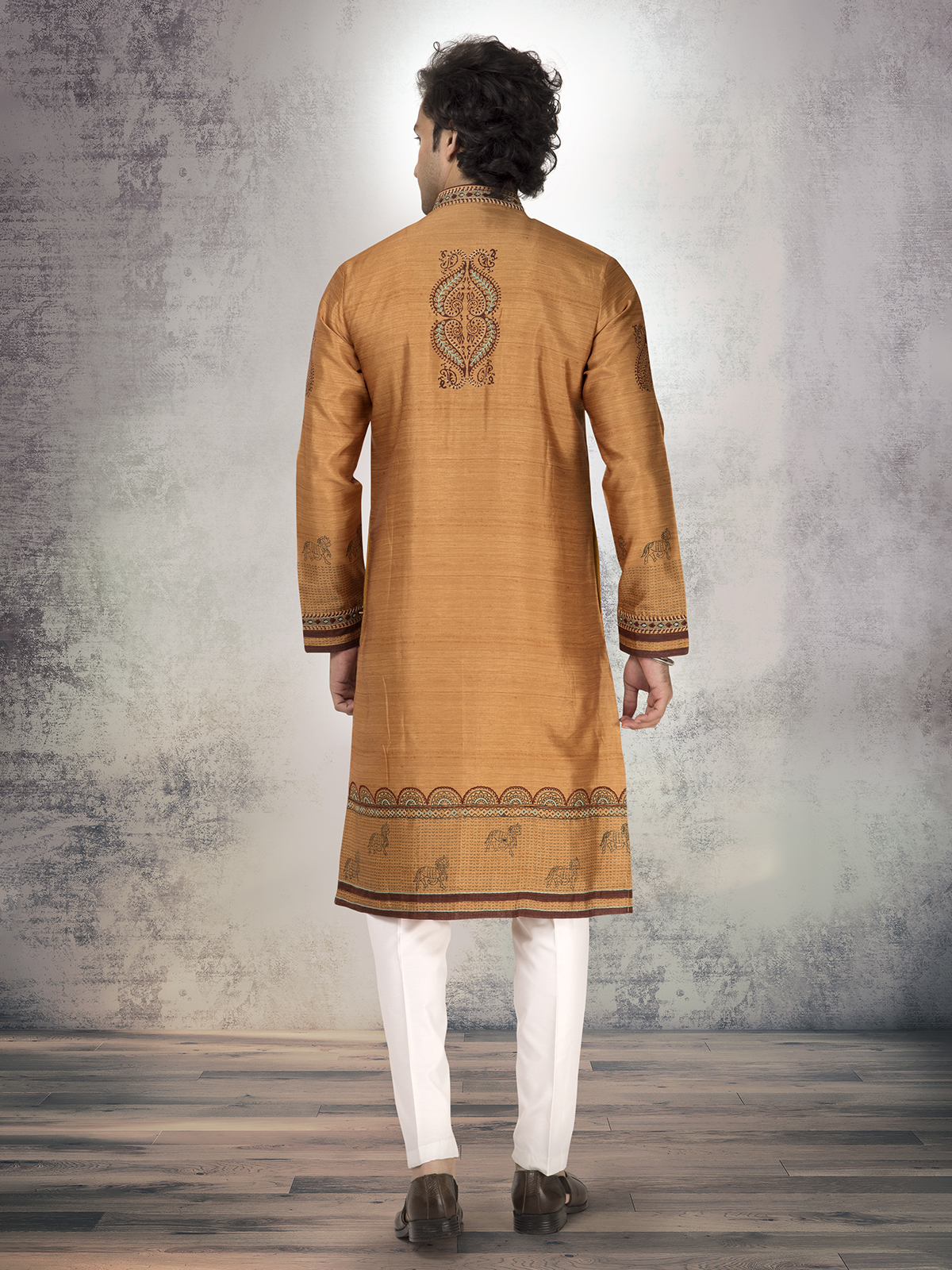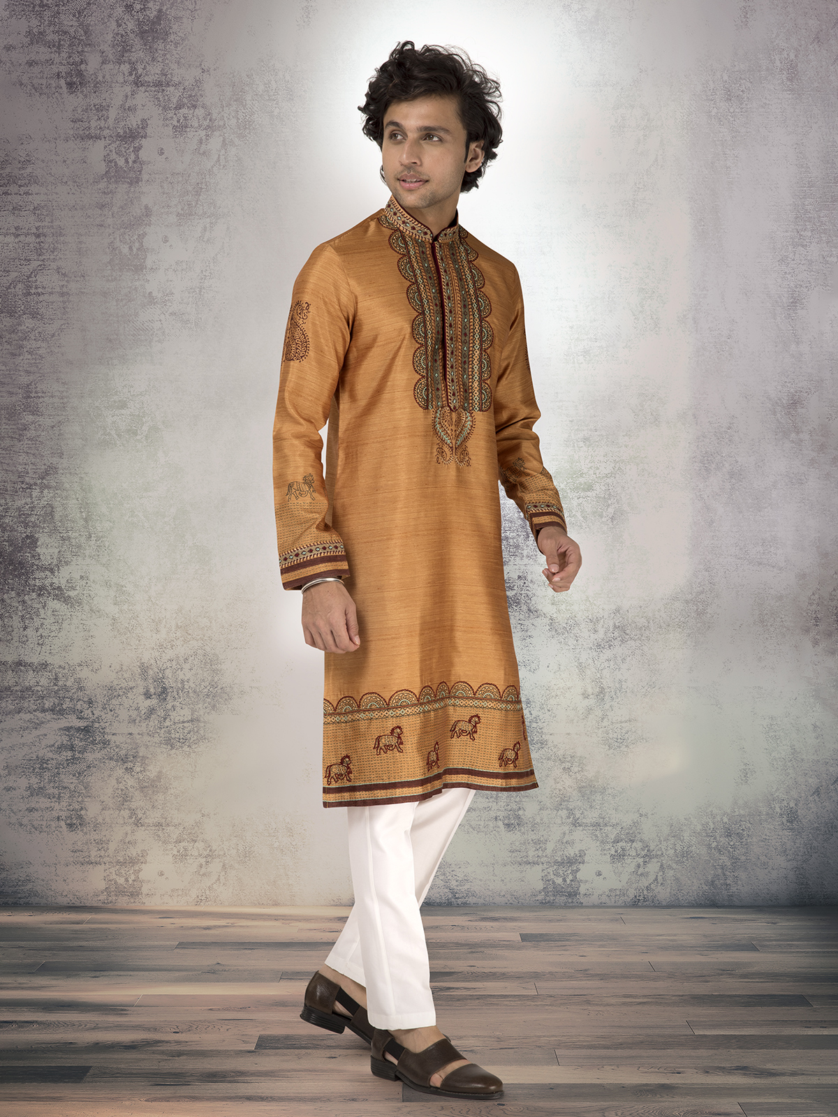 Rendered in smooth light brown silk, this kurta suit glows with refined thread and resham embellishment. The mandarin collar defines its stately elegance, while paired pants complete the look. Perfect for weddings, receptions, or festive evenings graced with timeless charm.