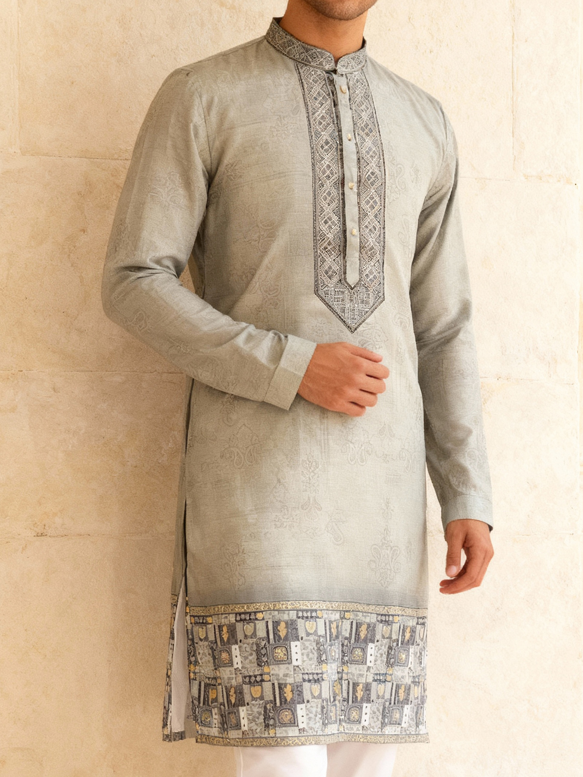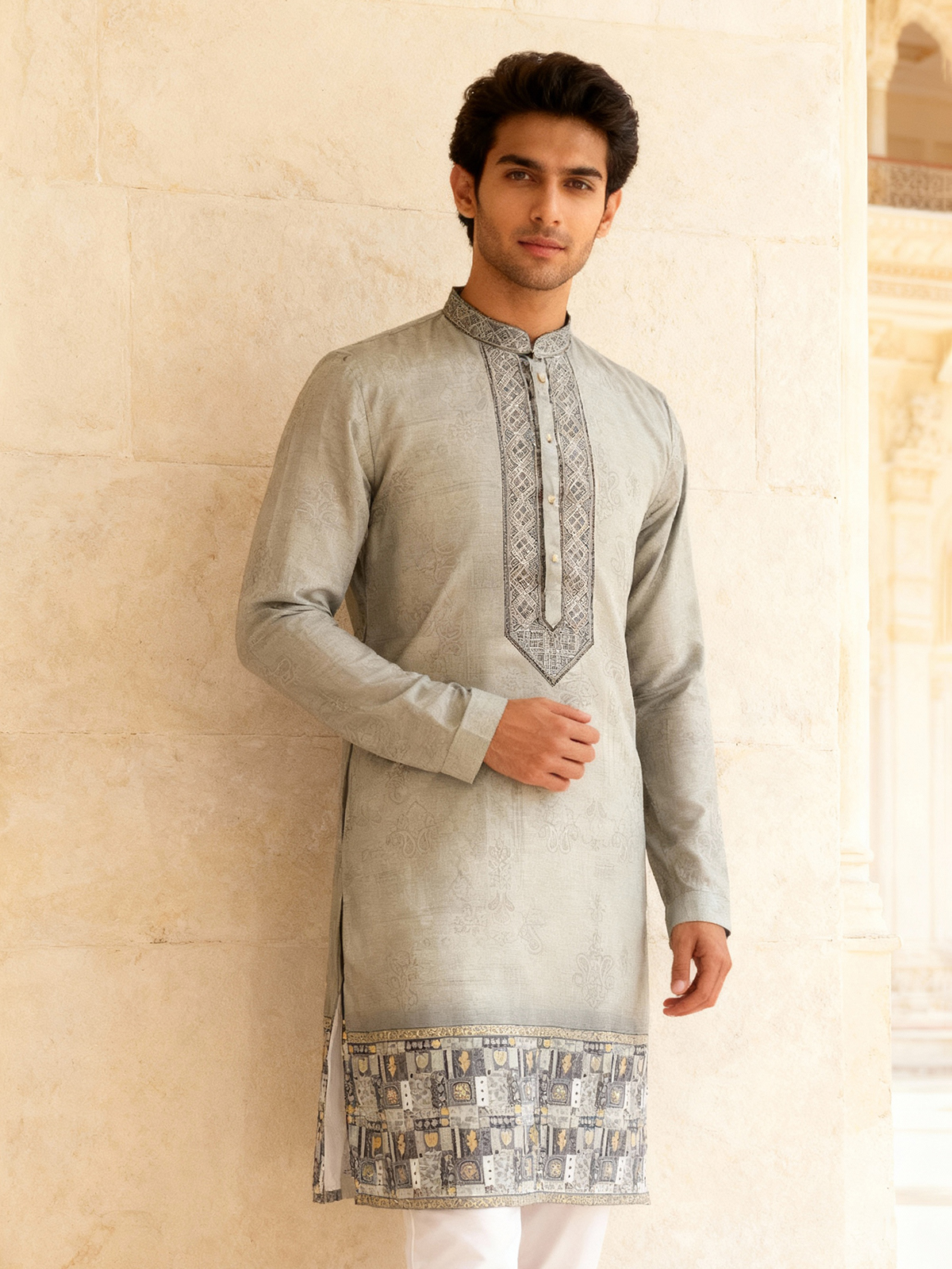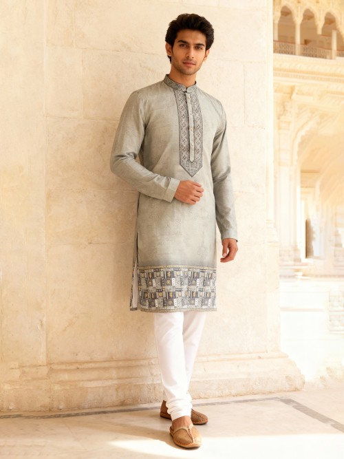 Stylish in its simplicity, this light grey cotton silk kurta features intricate daman prints. With a Chinese collar and full sleeves, it pairs with matching pants—ideal for festive evenings and family celebrations.