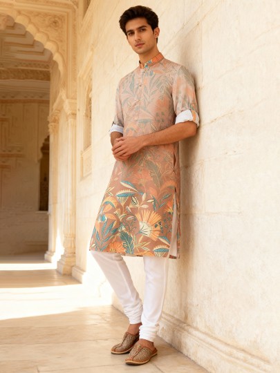 Crafted from premium cotton silk in a soothing light peach hue, this kurta is adorned with tasteful printed patterns for understated festive charm. Designed with a chinese collar and full sleeves, it offers a graceful traditional look. Paired with a classic white pyjama, it is ideal for weddings and elegant sangeet celebrations.