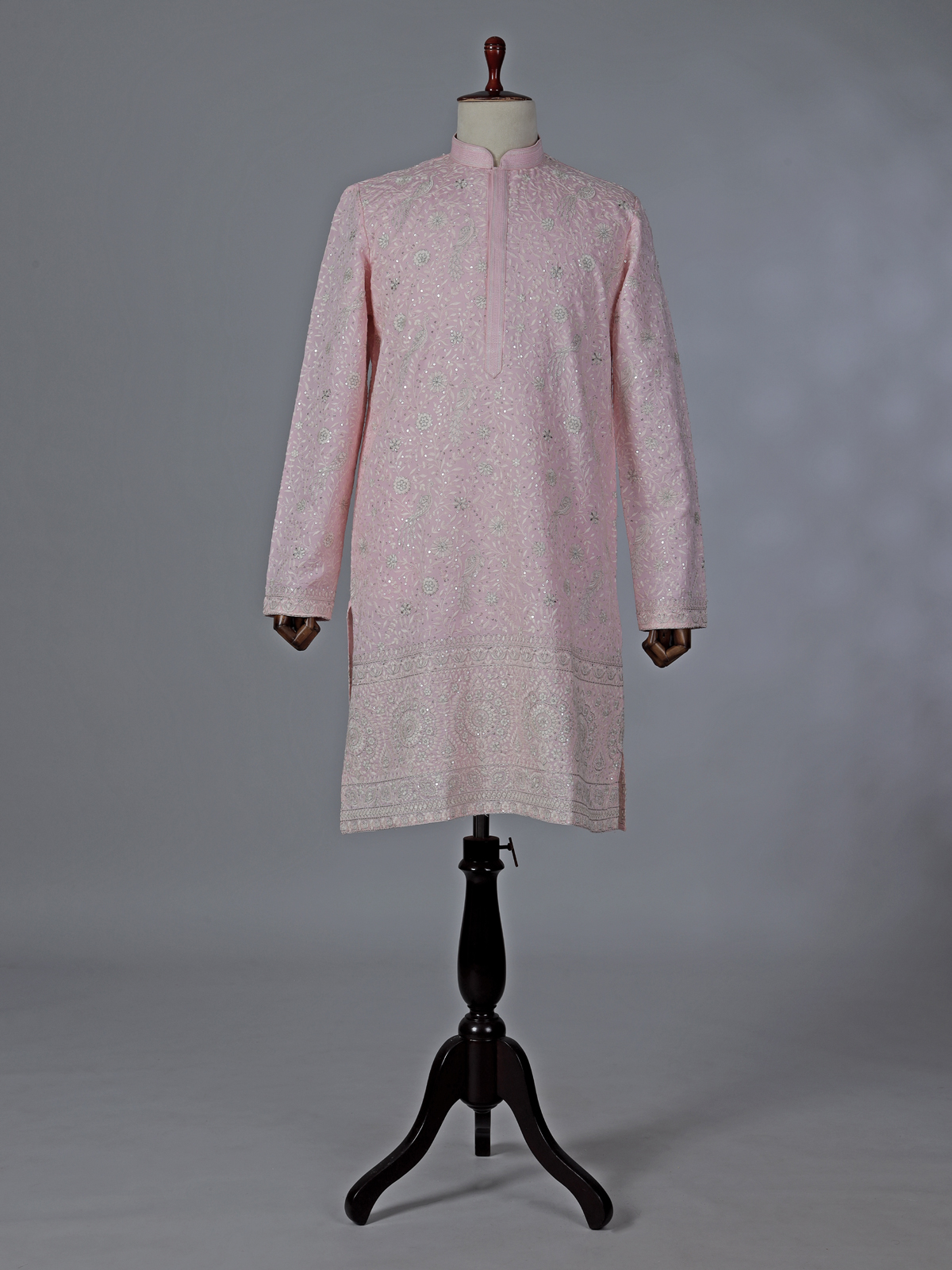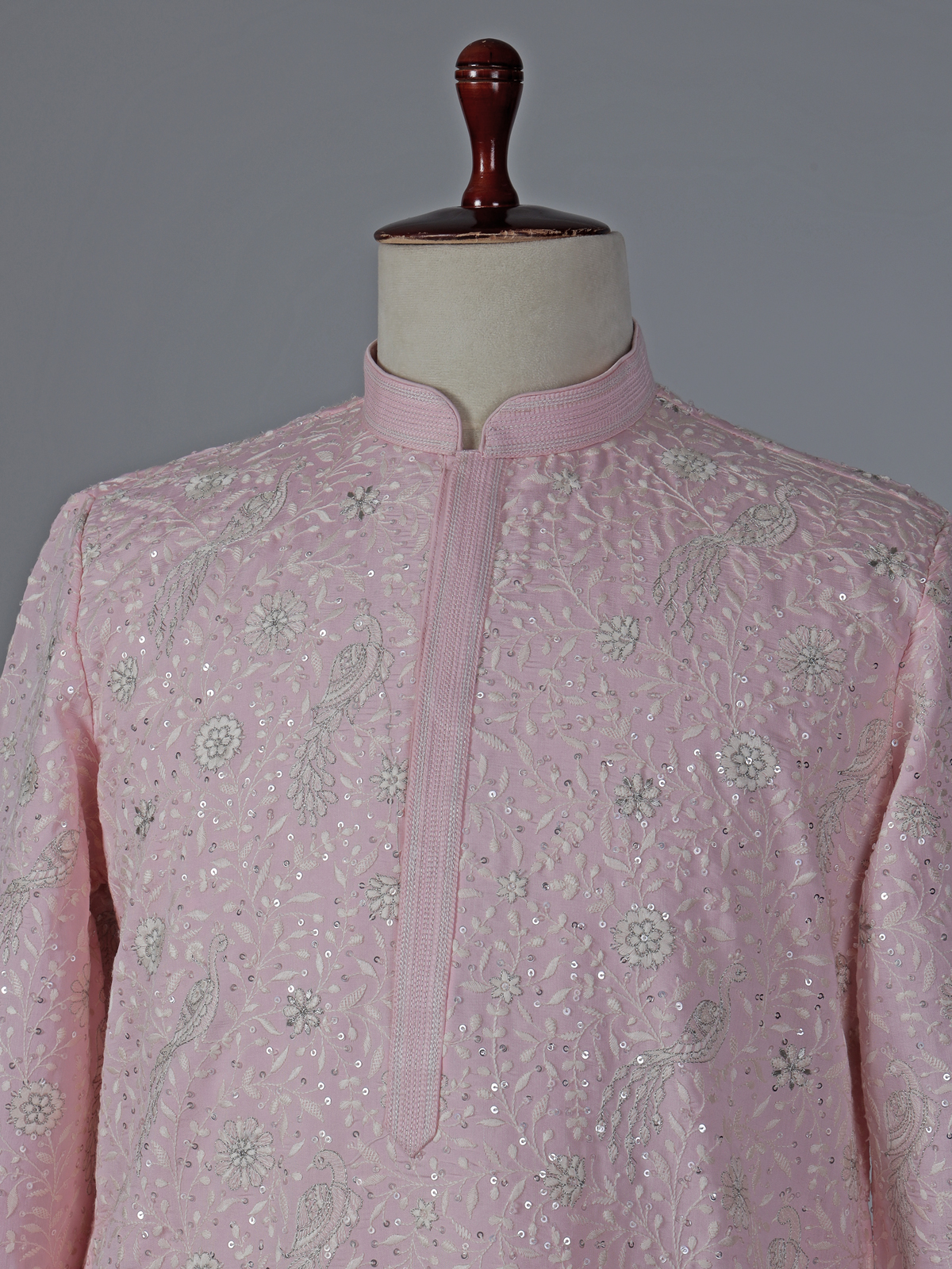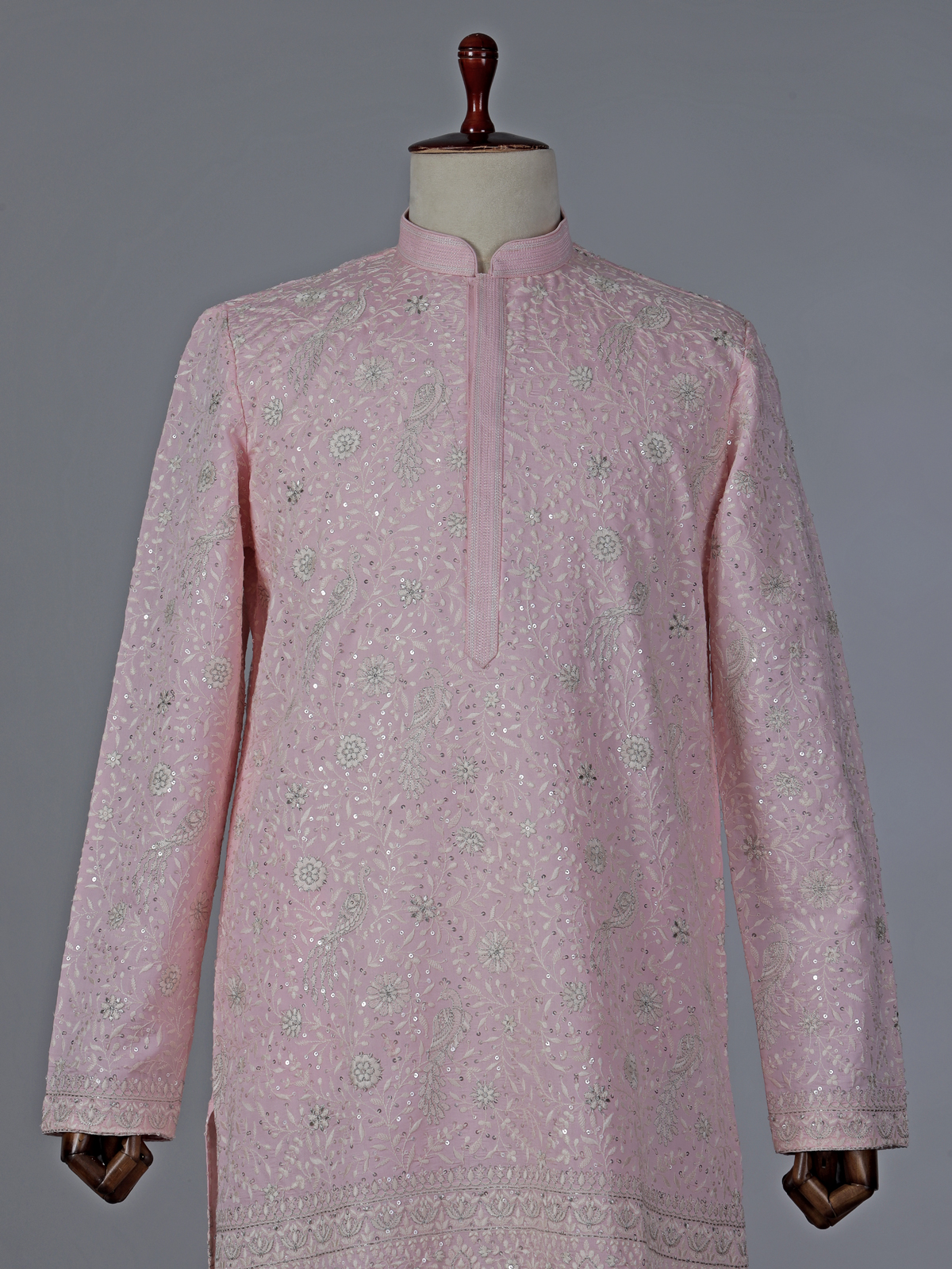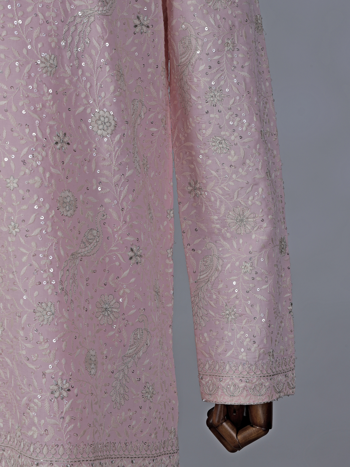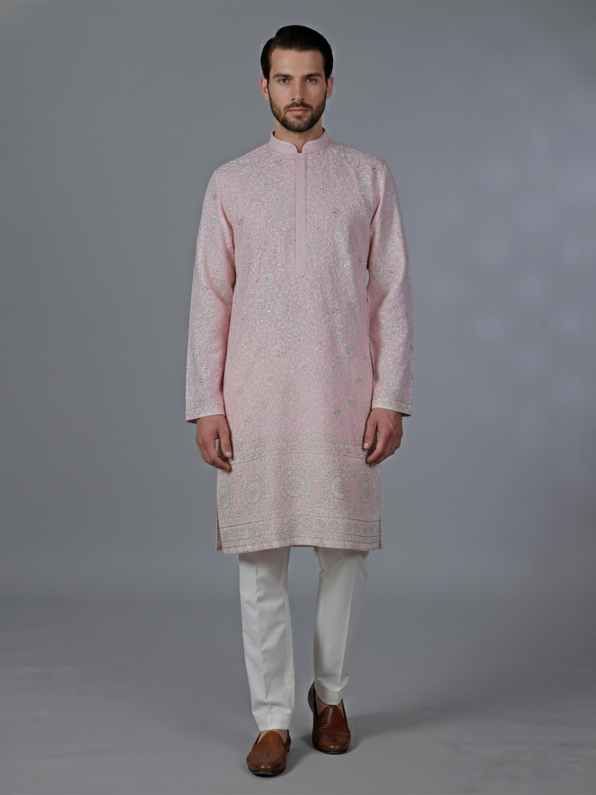 Soft tones meet festive artistry in this light pink cotton silk kurta suit. Adorned with thread, resham, and sequins work, the kurta offers graceful detailing without excess shine. The chinese collar with half button placket and full sleeves adds structure, while pant ensure a clean finish. Suitable for festival and Eid celebrations, this ensemble delivers elegance with a gentle festive statement.