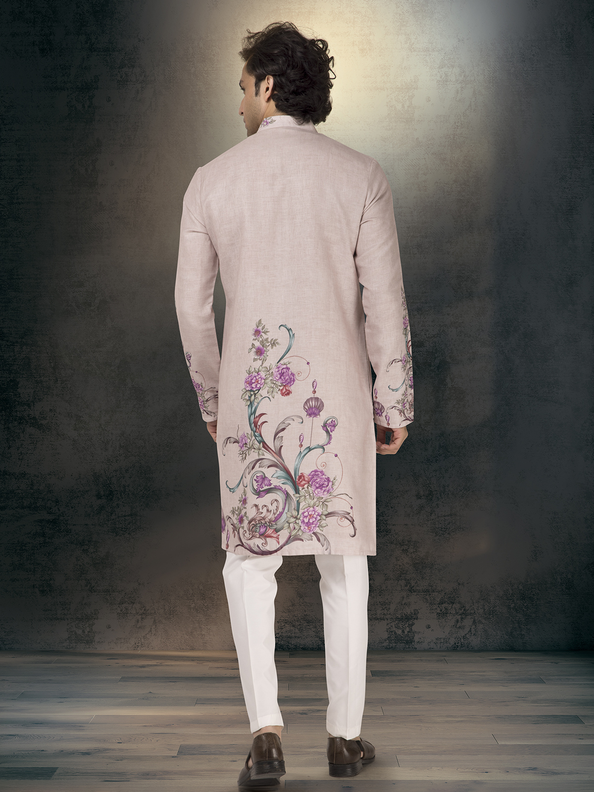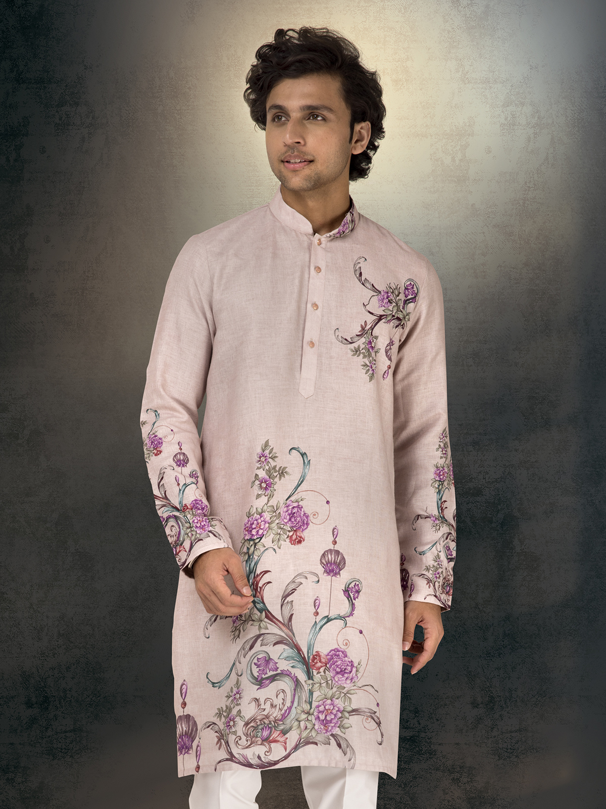 In soothing light pink linen cotton, this floral printed kurta suit is touched with fine cutdana accents. The mandarin collar adds tailored elegance. Paired with pants, it reflects subtle festive beauty for cultural celebrations.