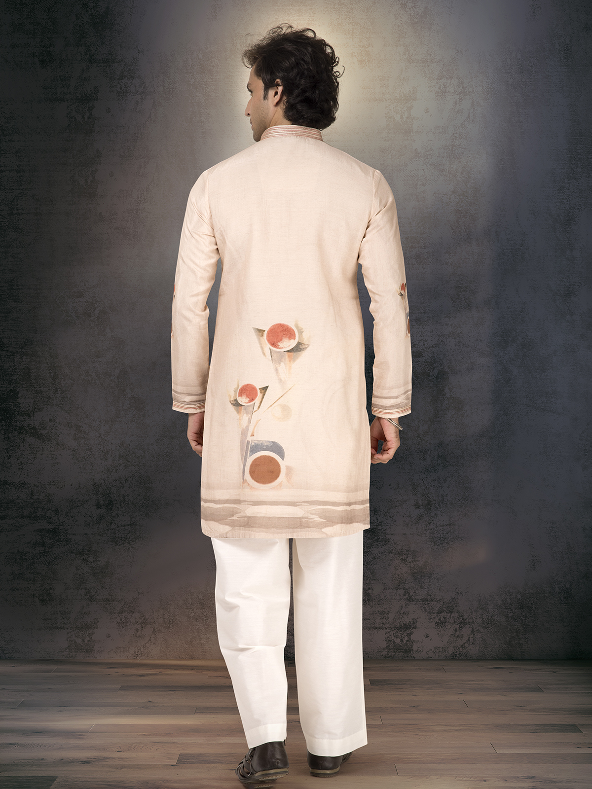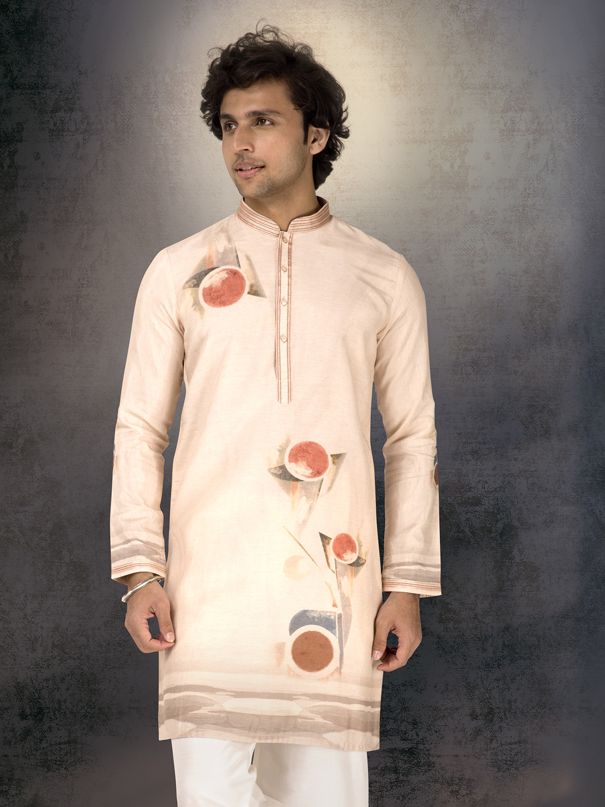 In gentle light pink linen cotton, this printed kurta suit captures the softness of celebration. The mandarin collar adds refined charm, making it a lovely choice for festive gatherings. Comes with a bottom.