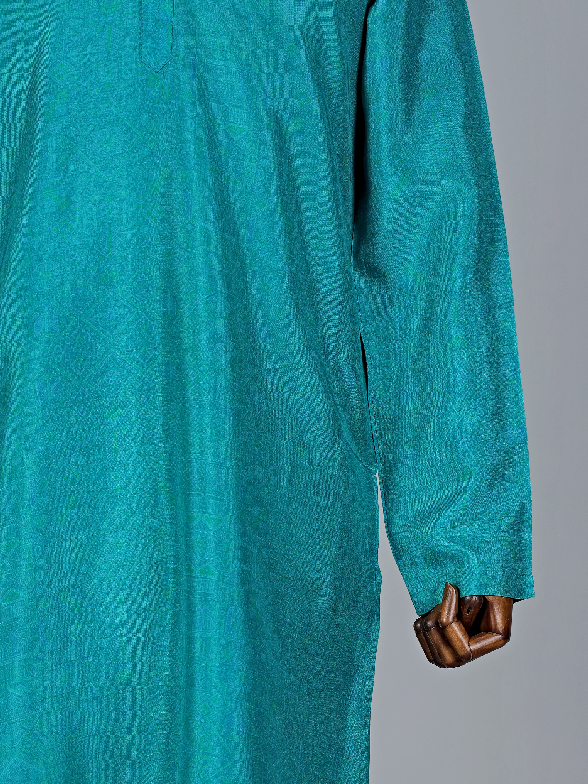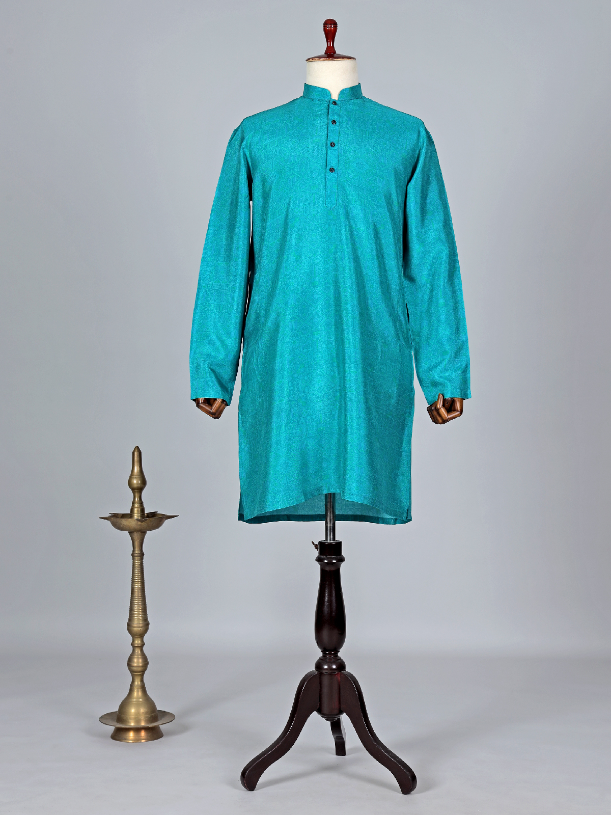Style this rama blue light printed silk kurta suit on your special occasion to add more in your elegance. It assures your comfort with a mandarin collar and full sleeves. Comes with white bottom.