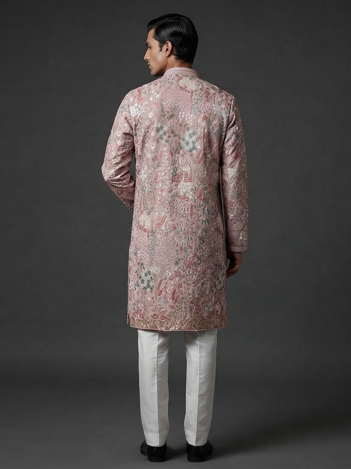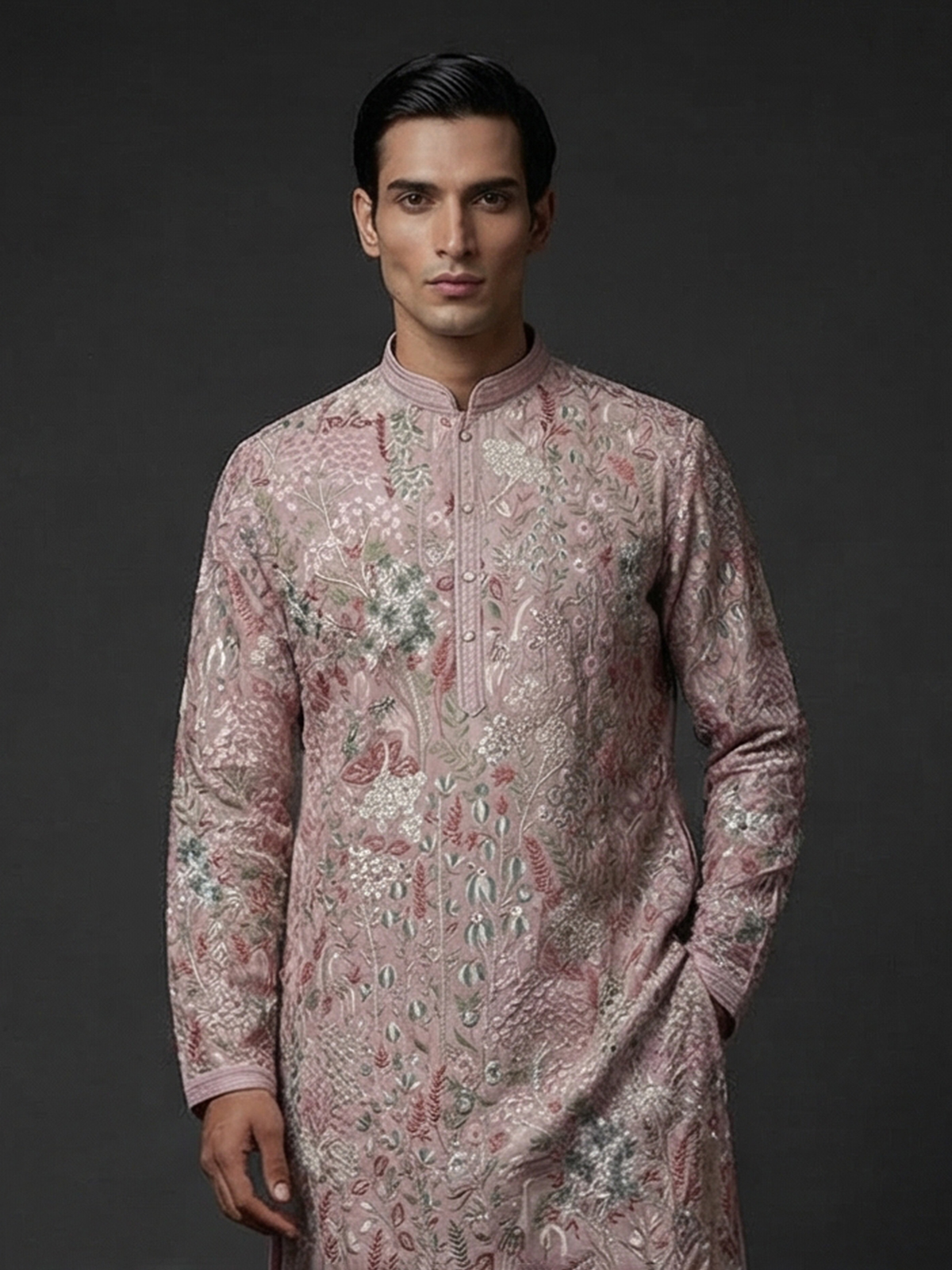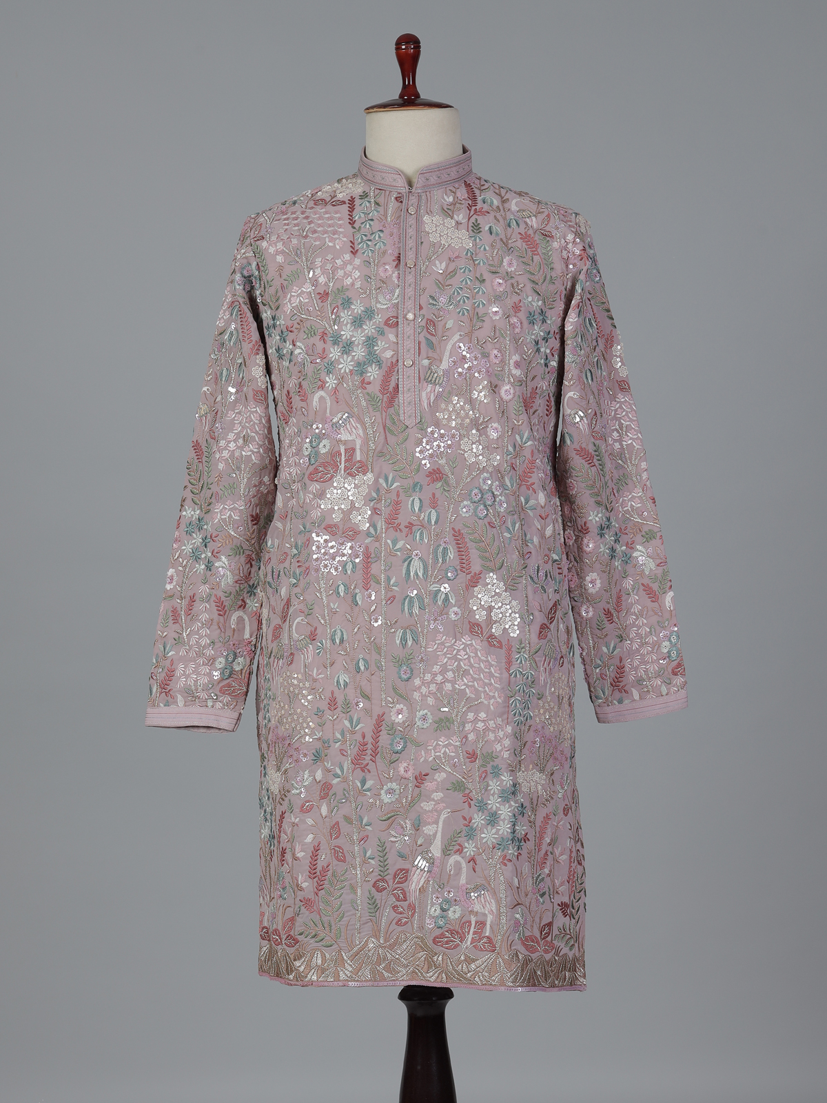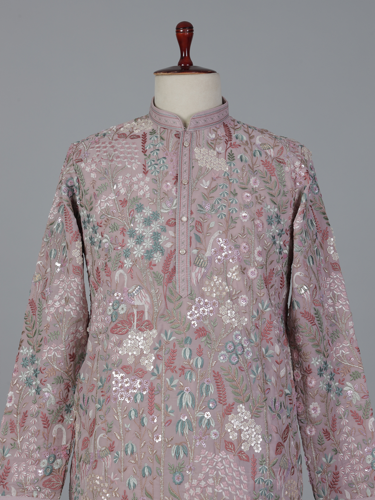 Graceful light purple hues highlight the elegance of this georgette kurta suit crafted for festive celebrations. Designed with a refined mandarin collar, the kurta is beautifully decorated with embroidery, resham and sequins that add subtle festive brilliance. Paired with tailored pants, the ensemble forms a charming ethnic look ideal for eid, weddings, sangeet functions and joyful gatherings.
