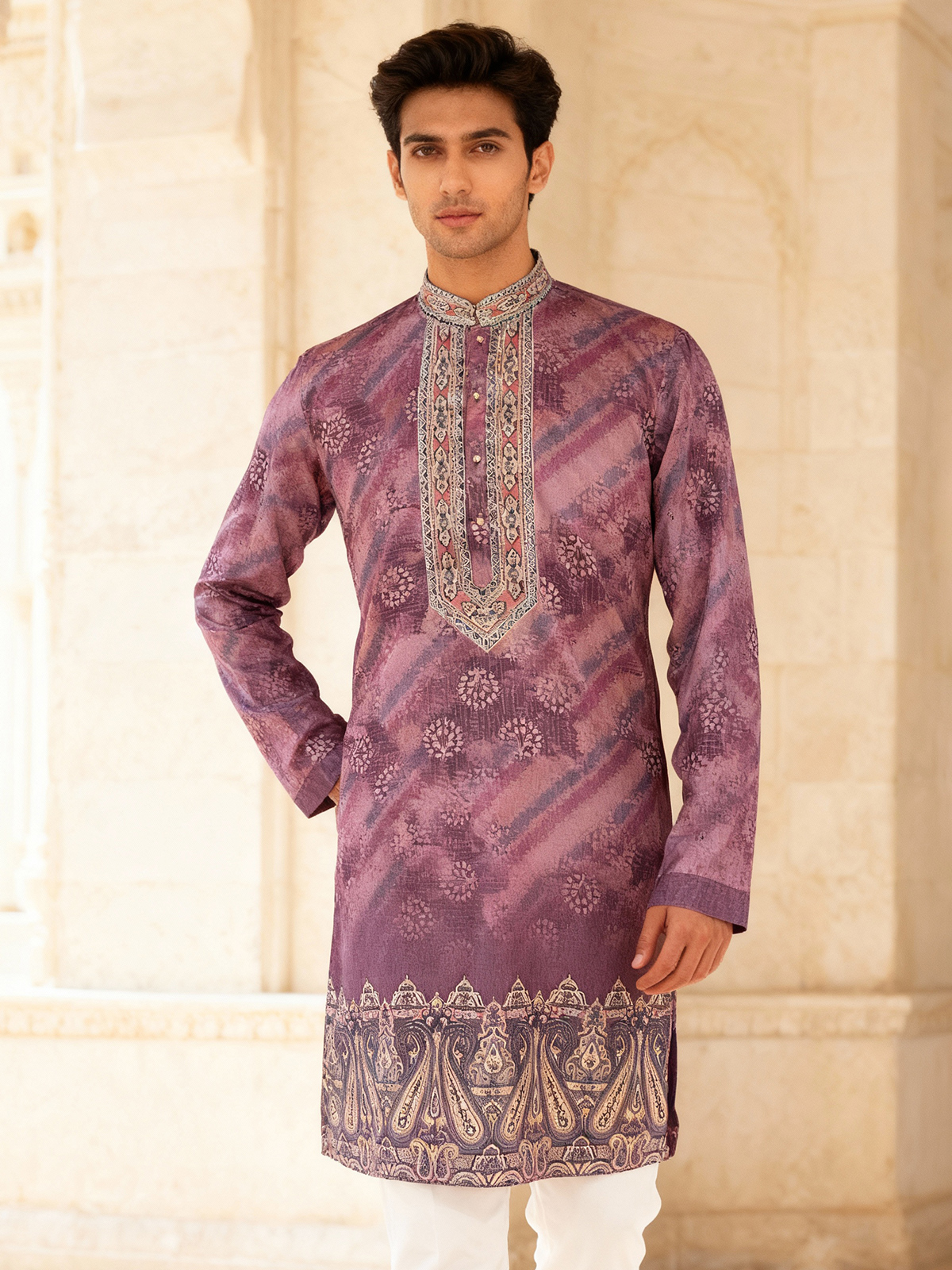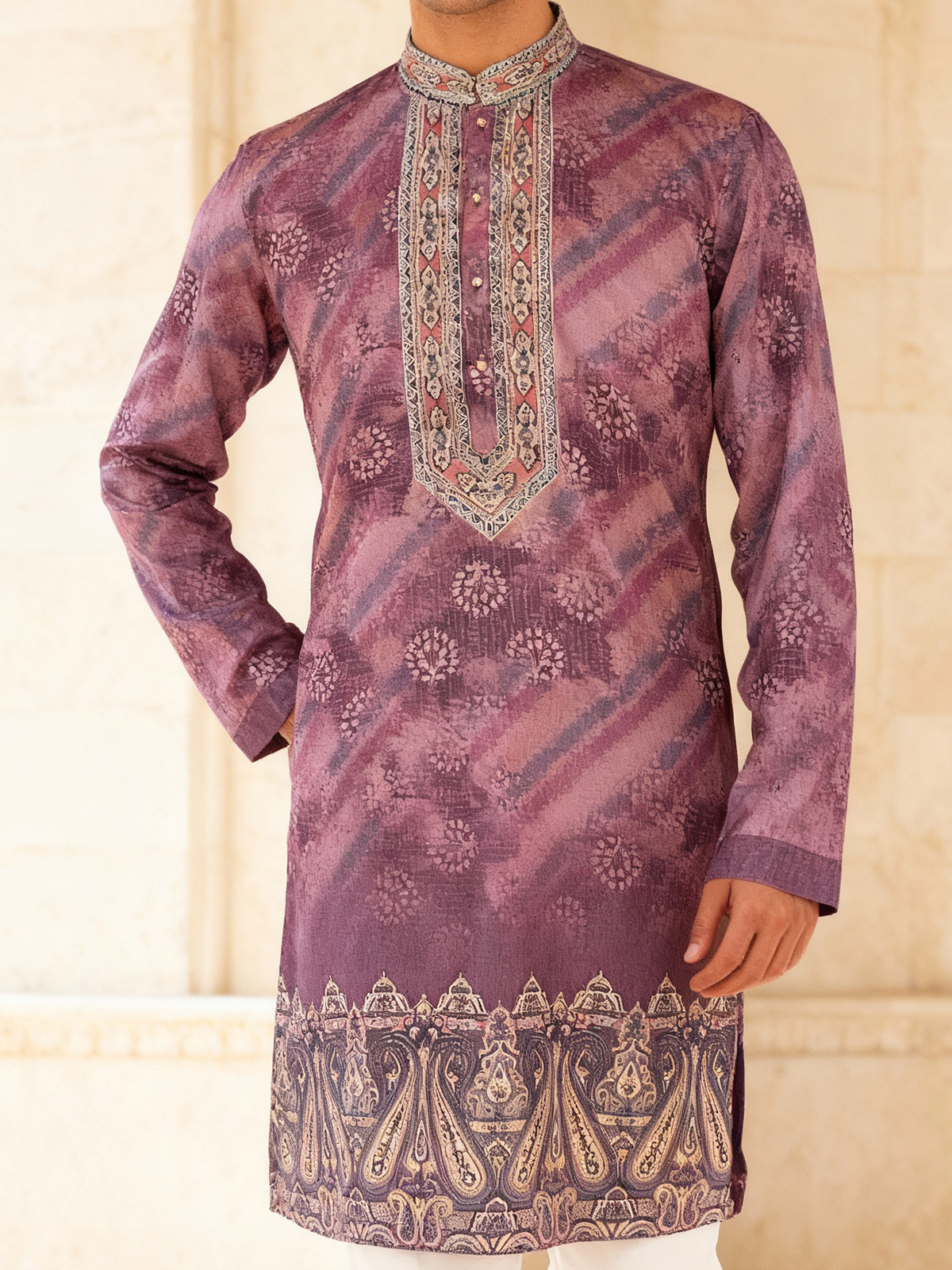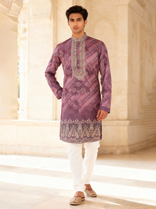 Sophisticated in light wine cotton silk, this daman printed kurta highlights classic elegance. With a Chinese collar and full sleeves, it comes with matching pants, perfect for festive evenings.