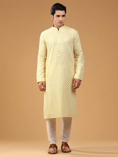 Get a fresh look this season with this light yellow georgette kurta suit, embroidered with resham and sequins work. Featuring a mandarin collar and full sleeves, it comes with a bottom to complete the look.