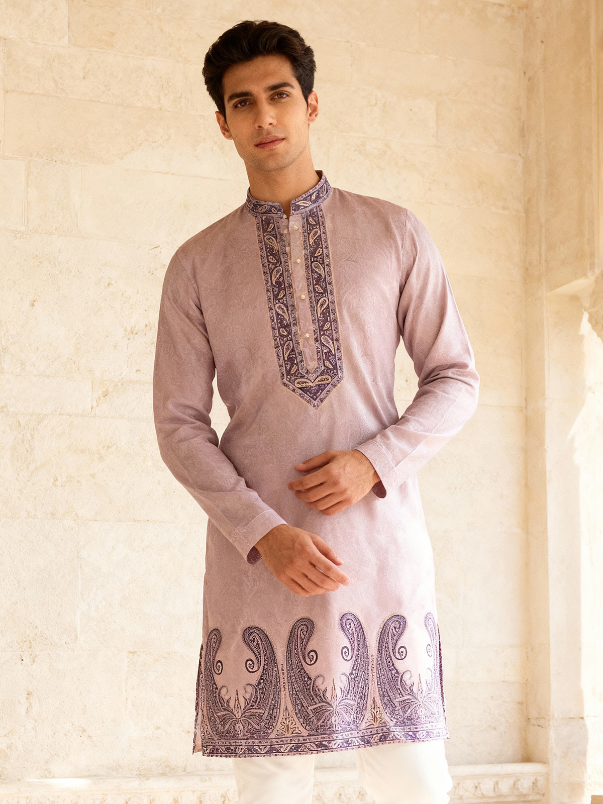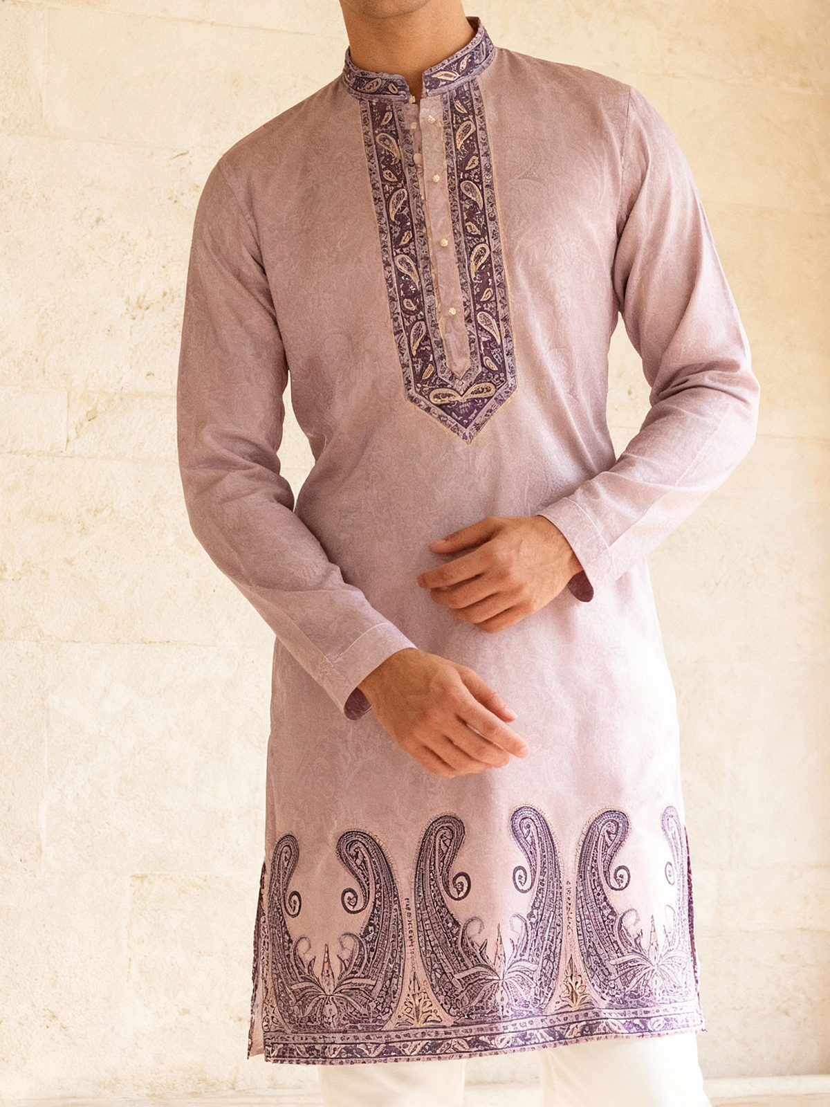 Graceful in lilac purple, this daman printed cotton silk kurta blends elegance with festivity. The Chinese collar and full sleeves lend sophistication, while the matching pants complete this refined ensemble.
