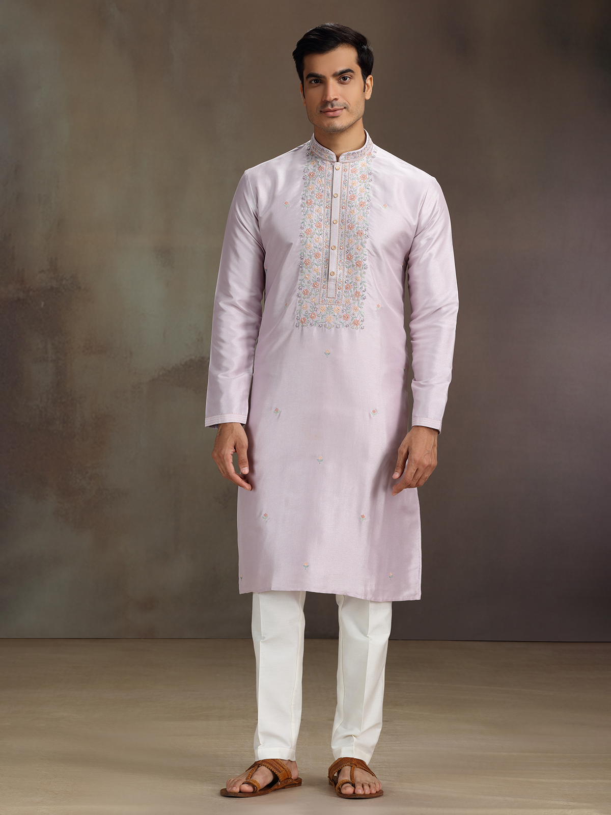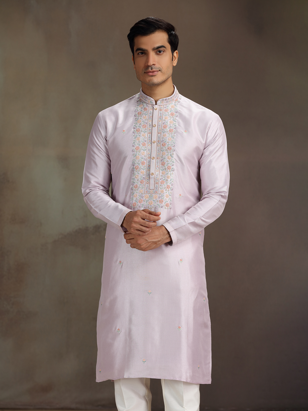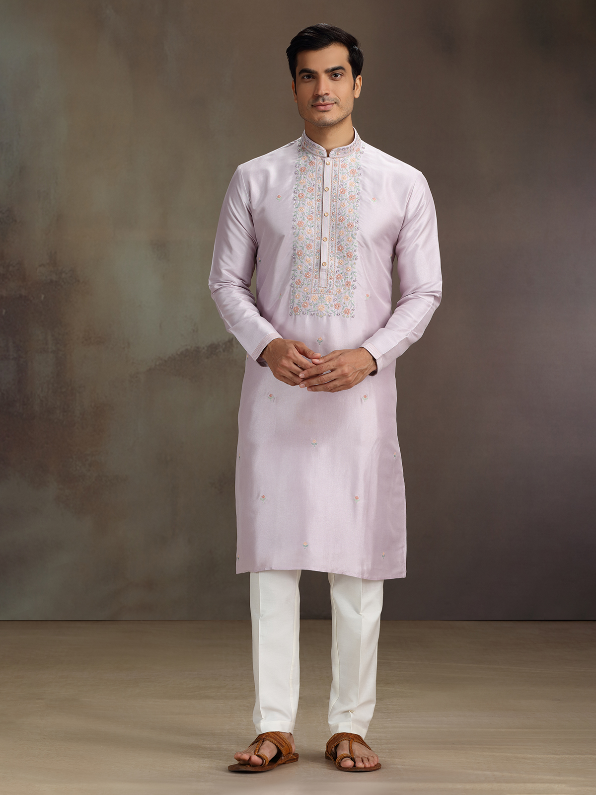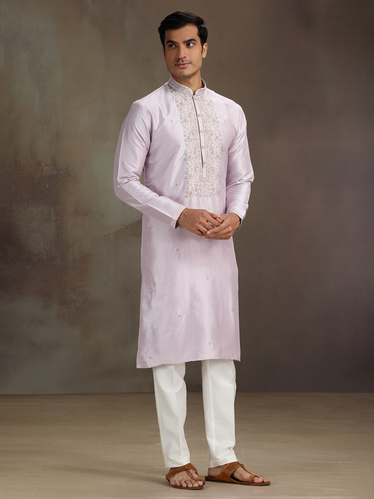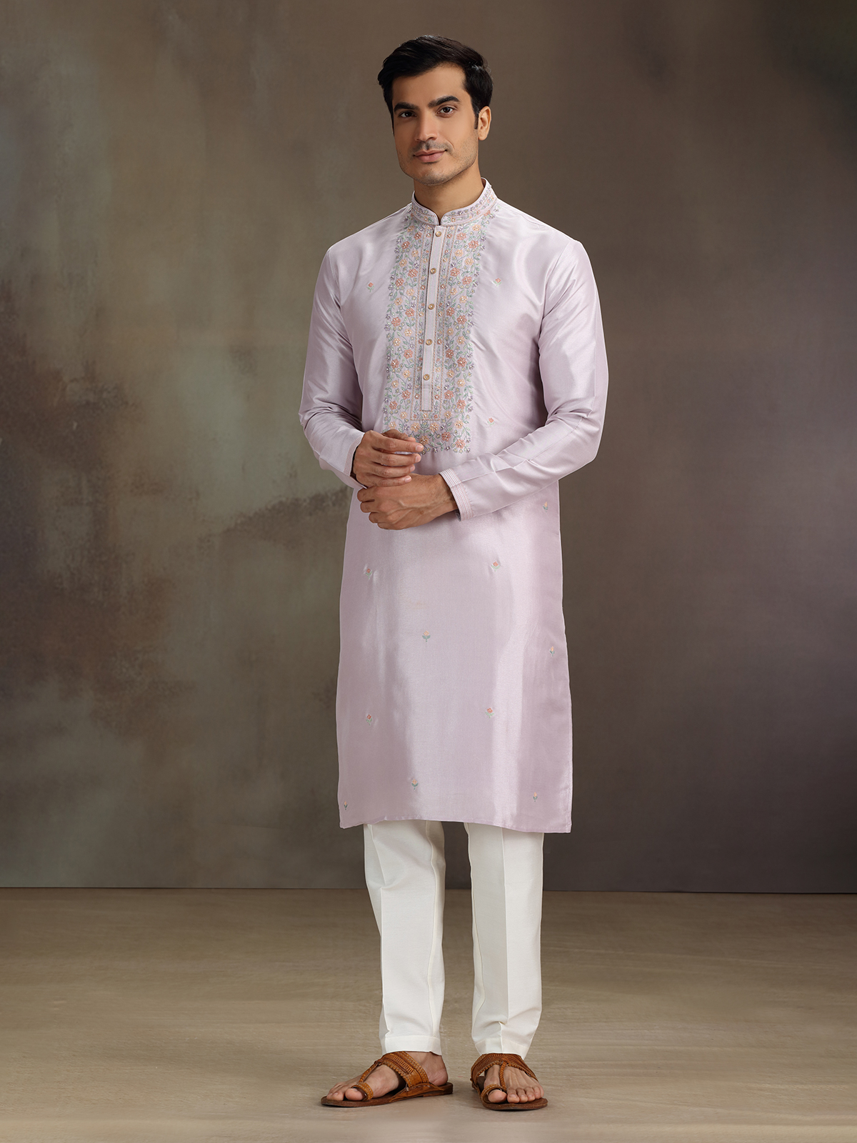 Subtle yet luxurious, this lilac purple silk kurta set glows with embroidery, cutdana, and sequins. Styled with a Chinese collar and matching pants, it’s perfect for receptions, sangeet, and festive evenings.