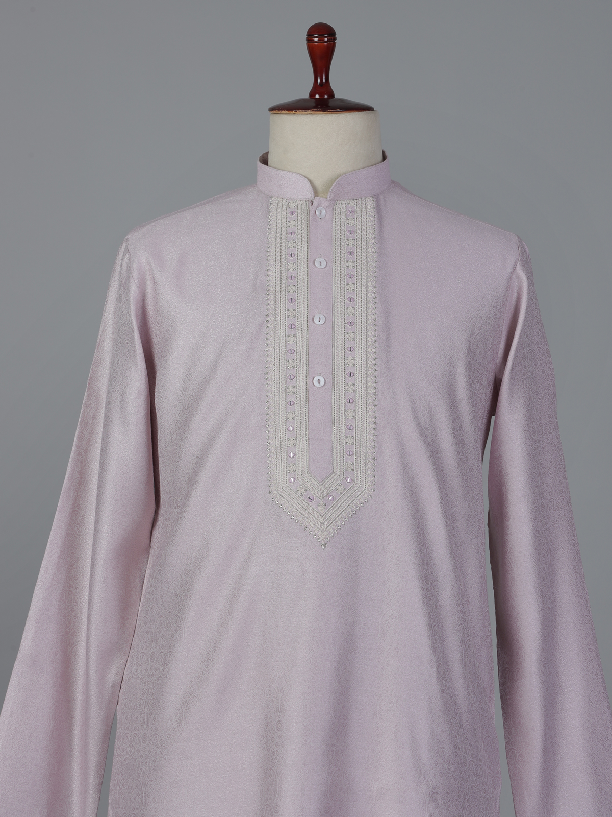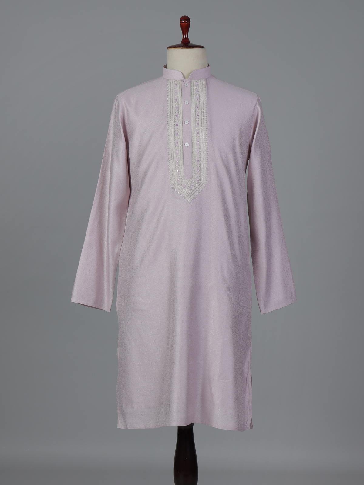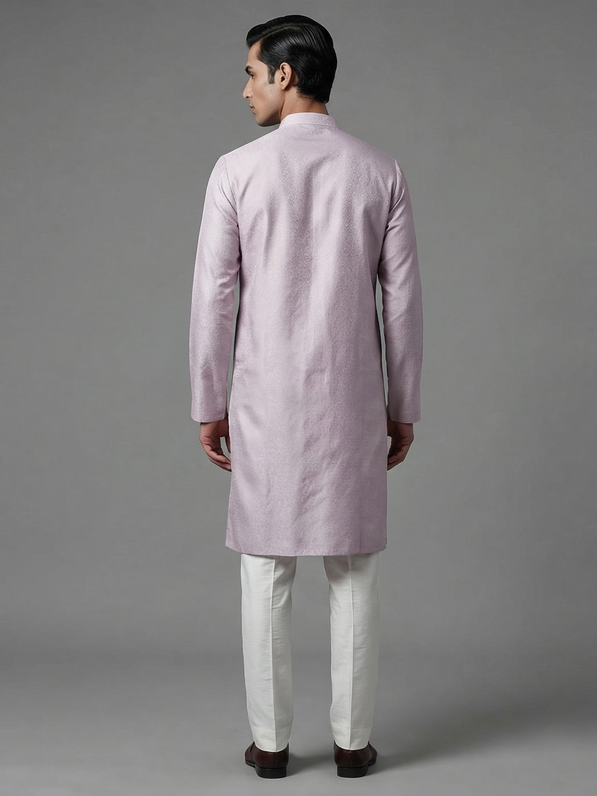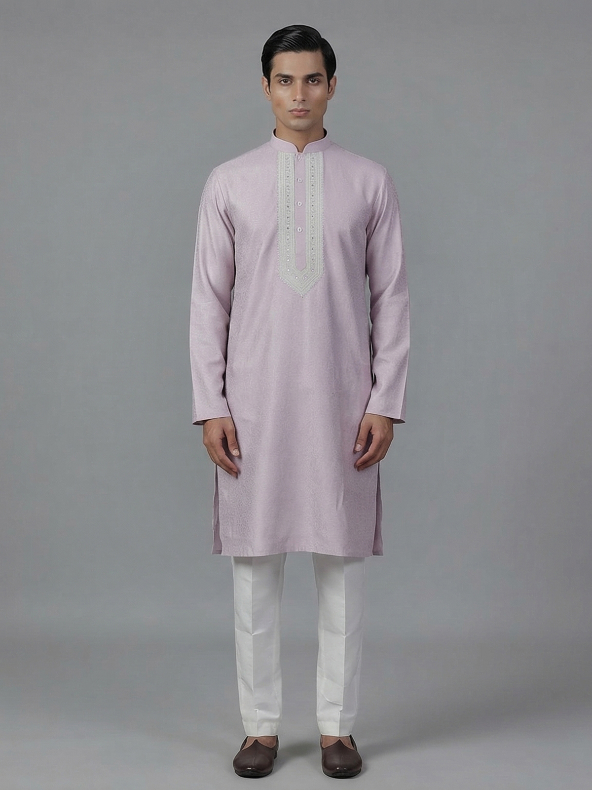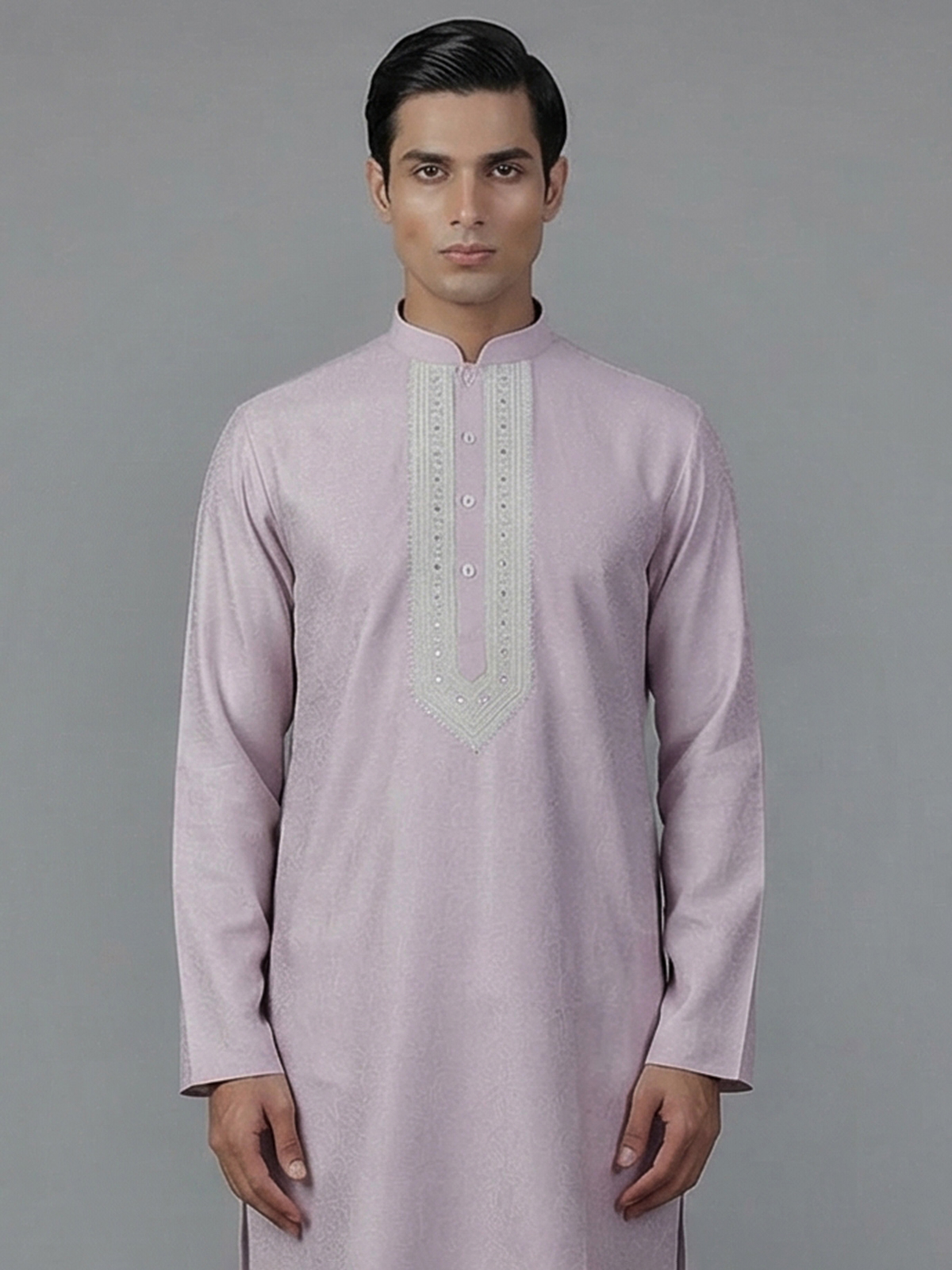 Royal lilac purple hues elevate the charm of this silk kurta suit designed for grand festive occasions. The kurta features a sophisticated mandarin collar and is richly adorned with thread, resham, aabla and zari embellishments that reflect traditional artistry. Paired with elegant pants, the ensemble creates a regal ethnic silhouette perfect for weddings, receptions, eid celebrations and festive gatherings.