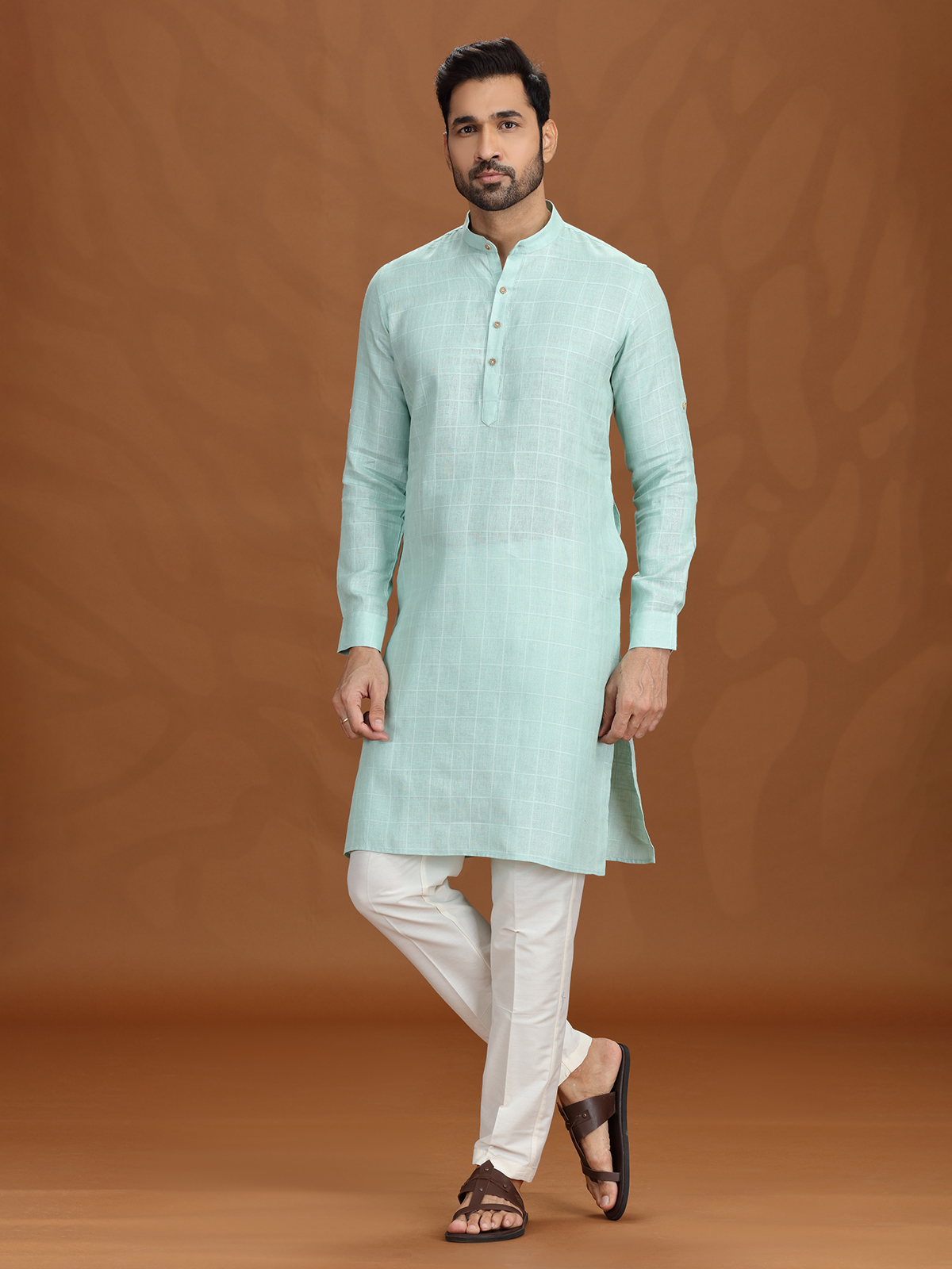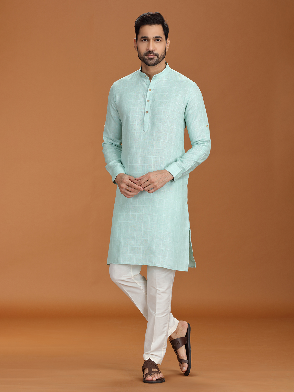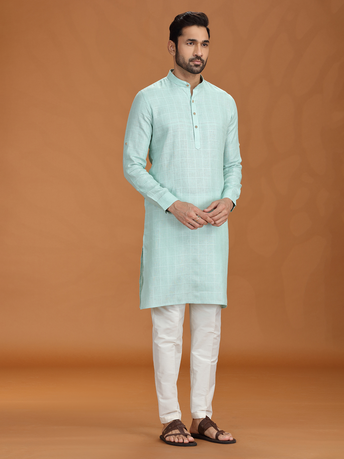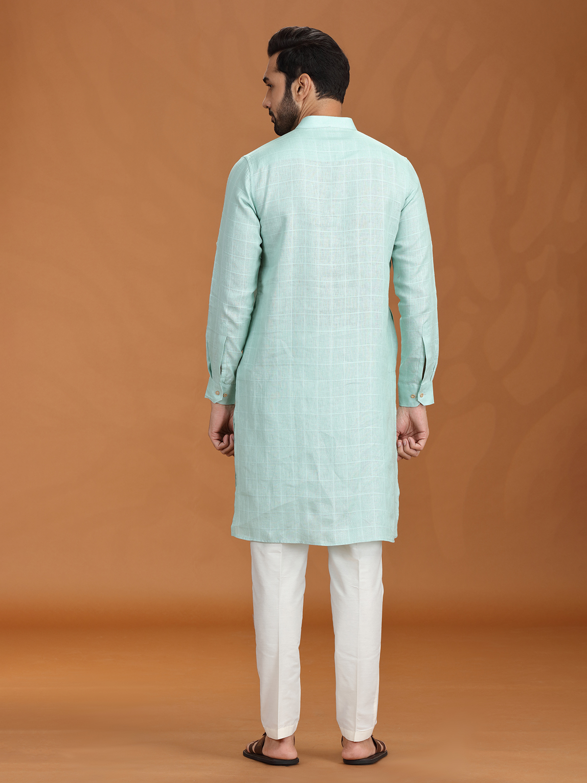 Infuse vibrance into your ethnic rotation with this lime green checked kurta set. Made from lightweight linen, it features a sharp Chinese collar and clean-cut sleeves. The coordinated pant completes a modern, festive look ideal for traditional gatherings, poojas, or contemporary cultural functions.
