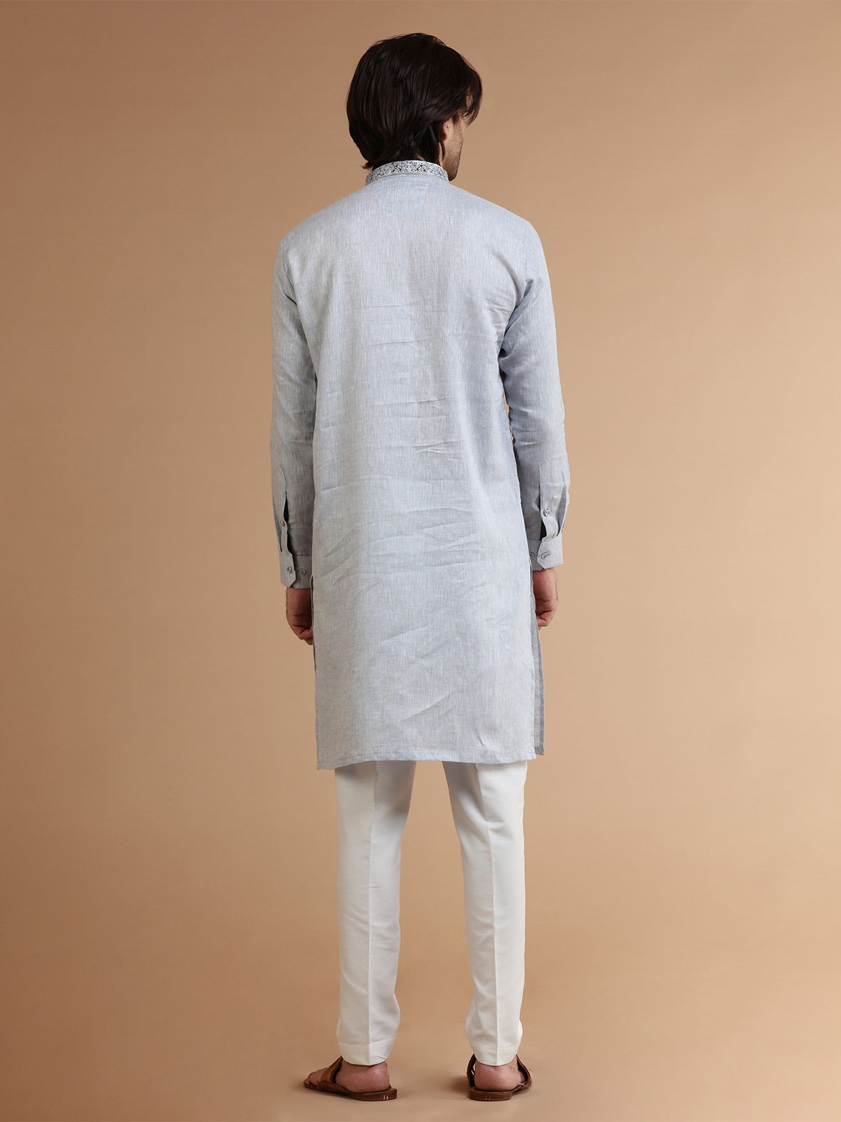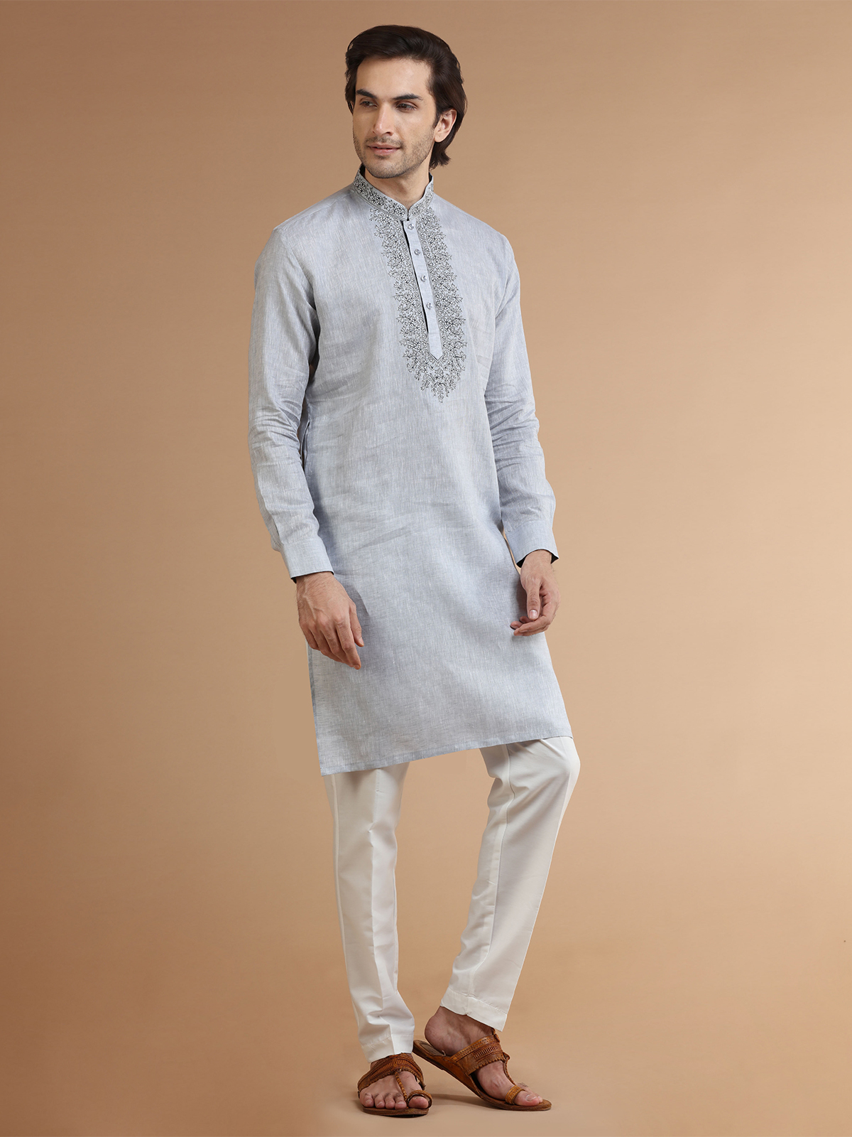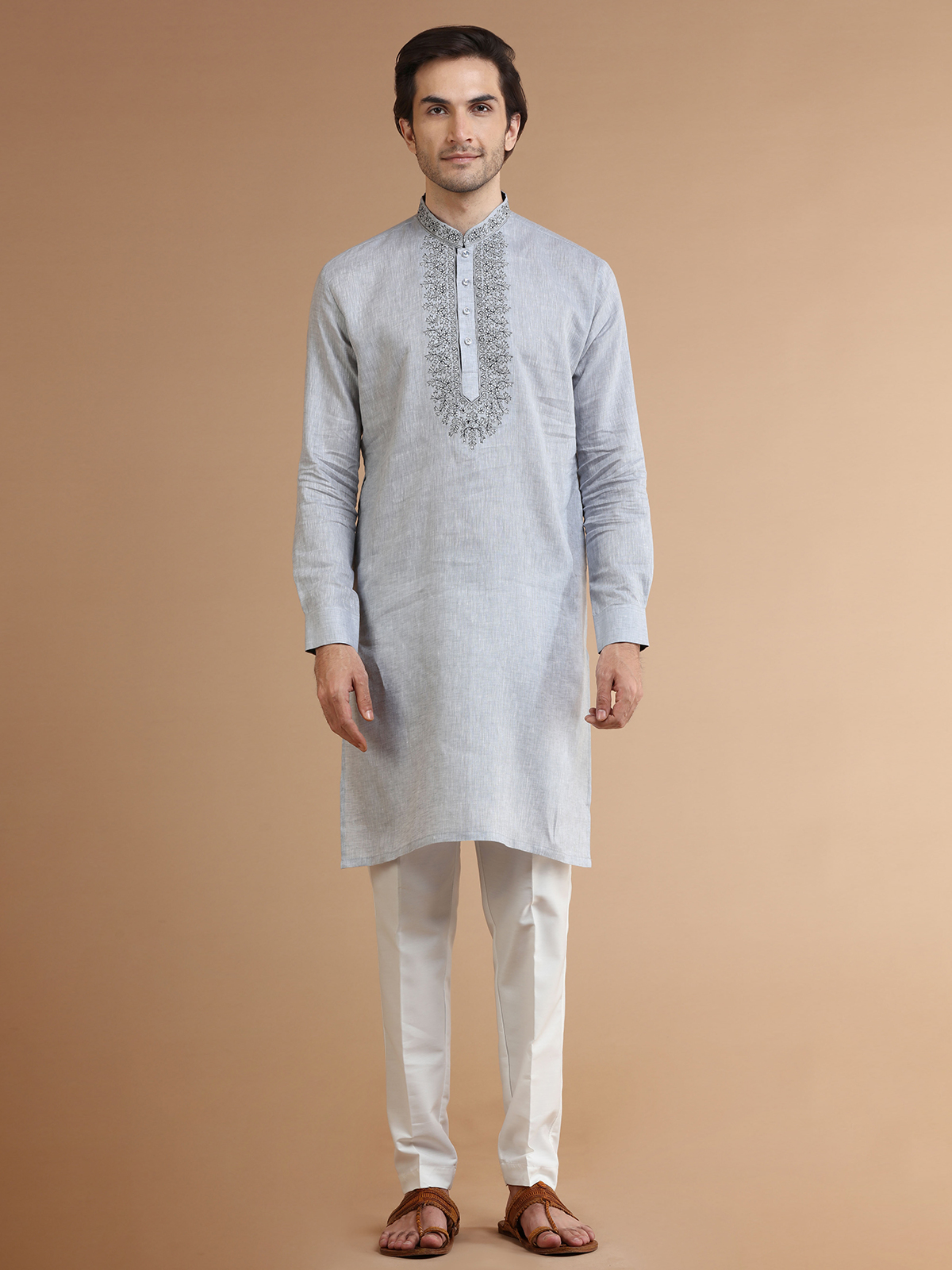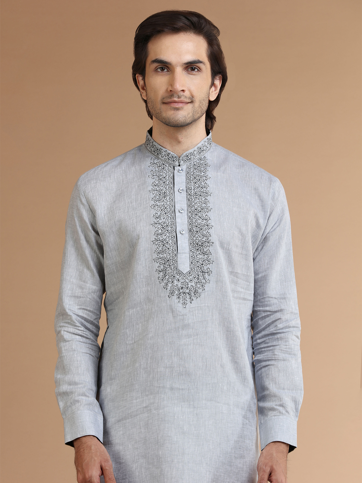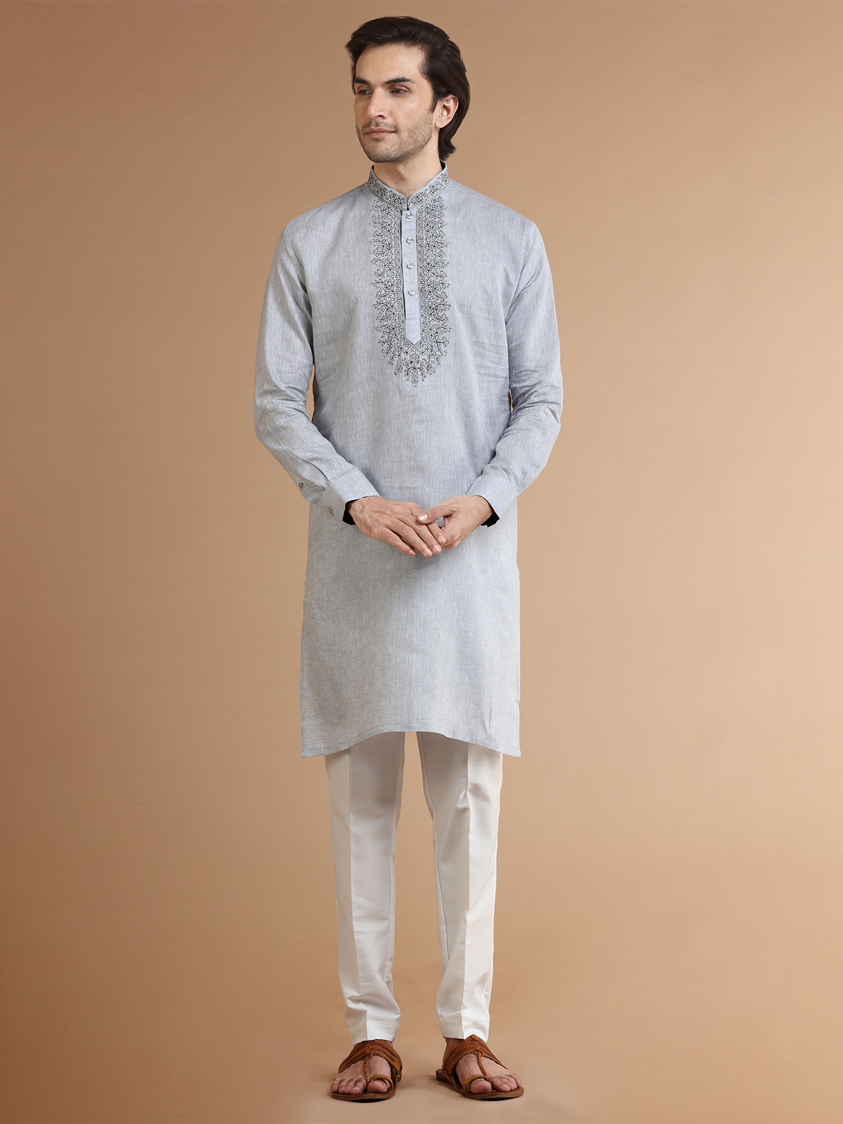 Add a touch of enchantment to your wardrobe with this grey linen kurta suit. The resham and thread work with a mandarin collar and full sleeves make it ideal for any festive event. Comes with a bottom.