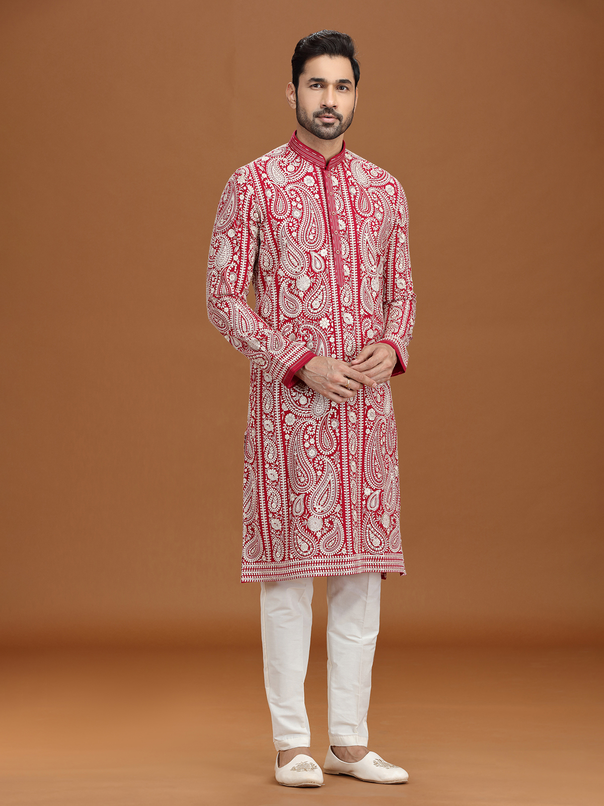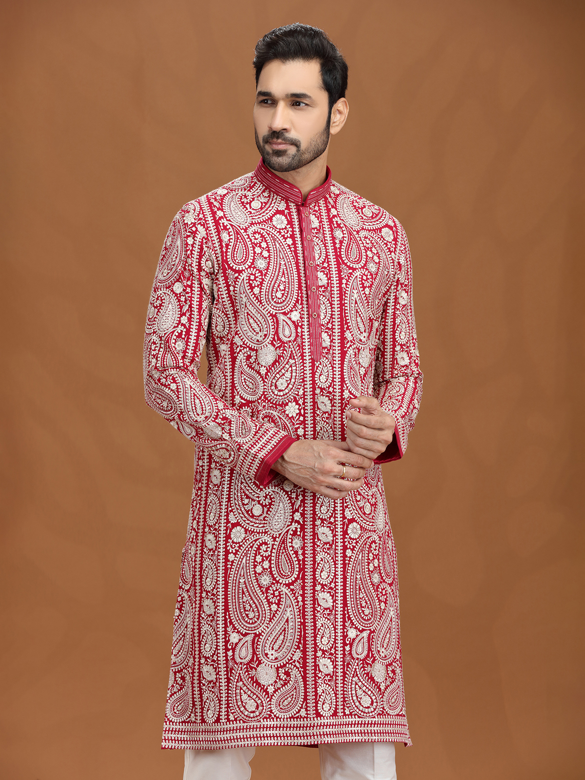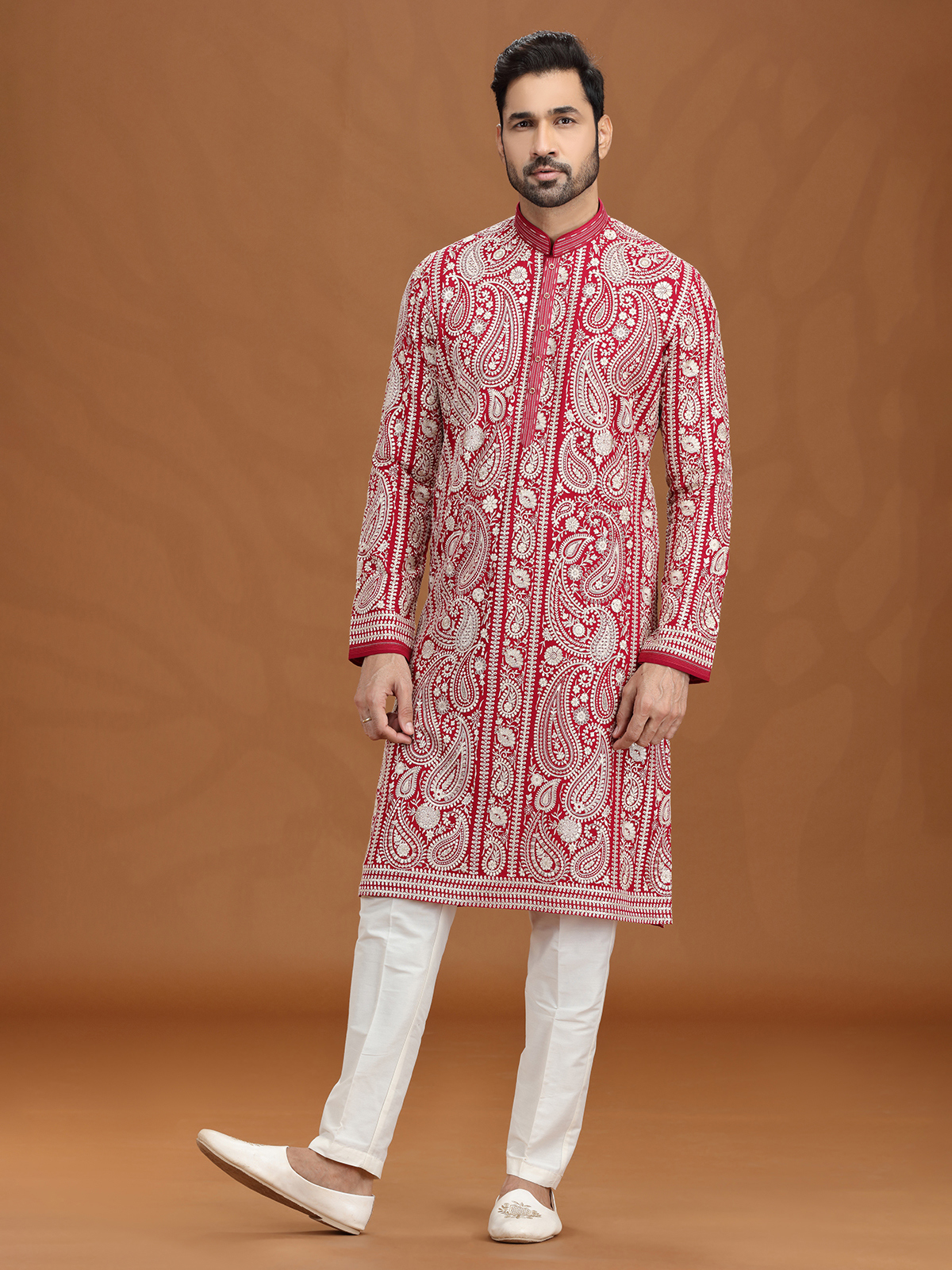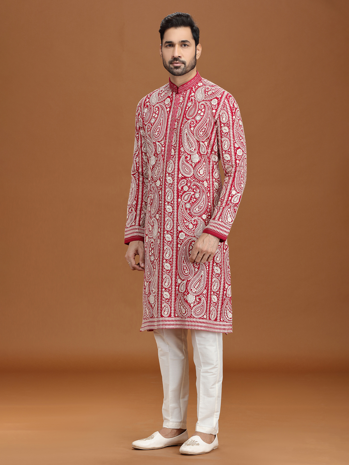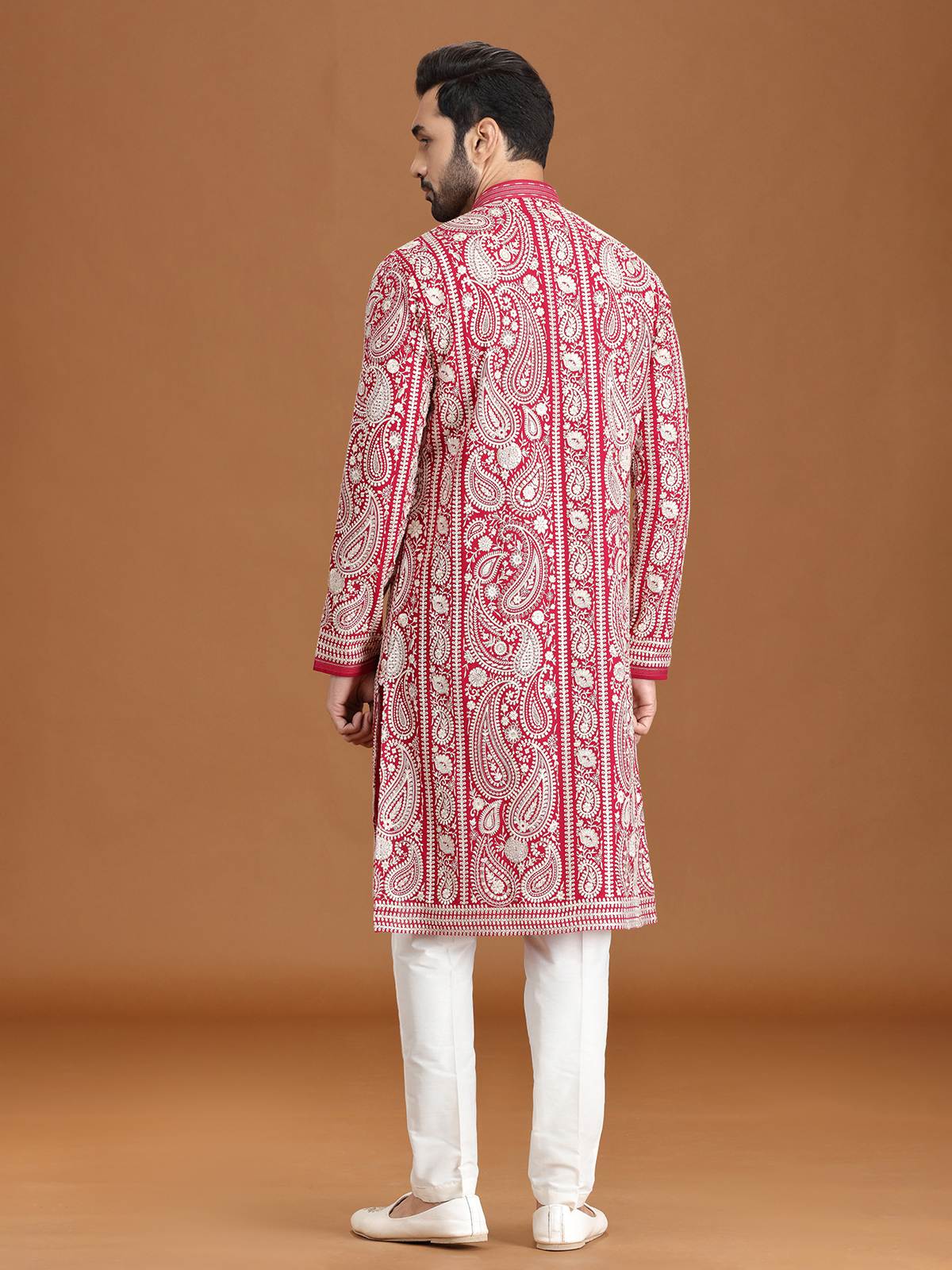 Vivid in magenta, this georgette kurta suit is enhanced with embroidery, resham, and sequins for wedding opulence. The regal stand collar and pant ensure a sharp finish. Celebratory and refined, this ensemble is crafted to exude elegance and cultural richness at traditional occasions.