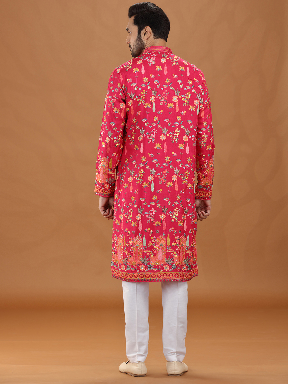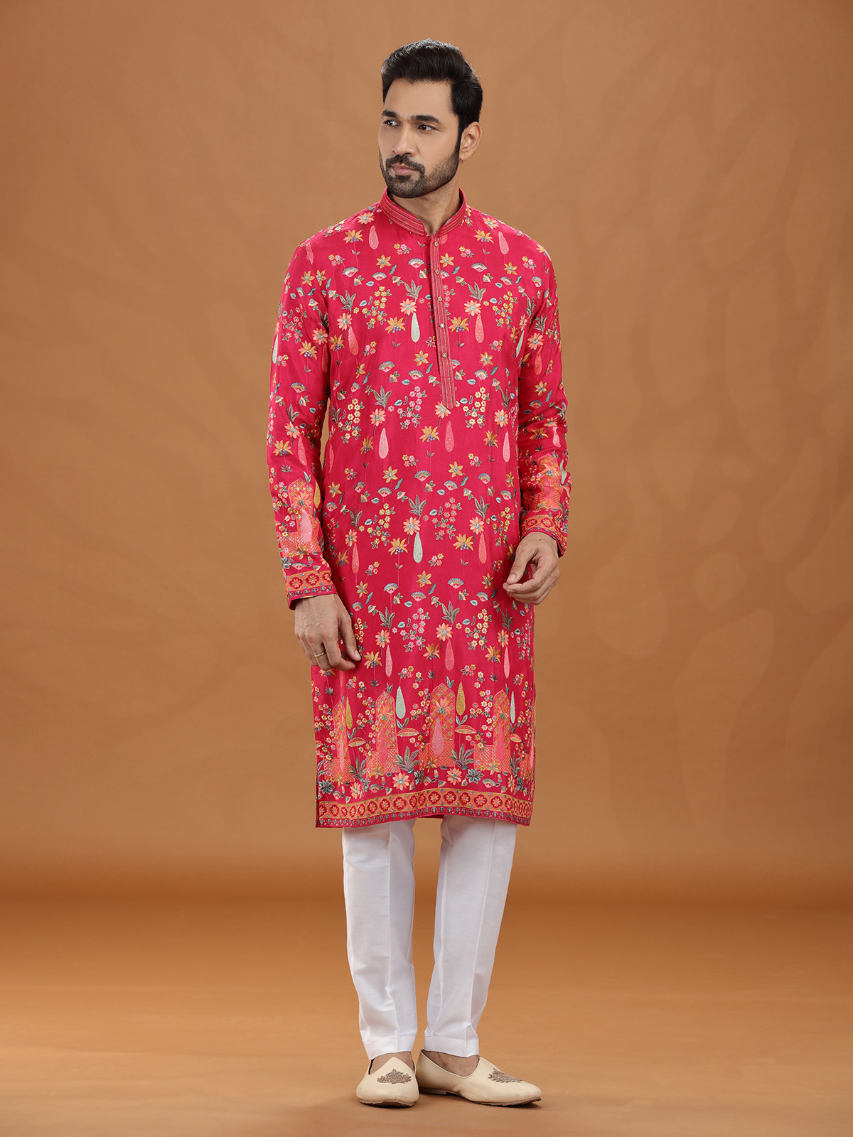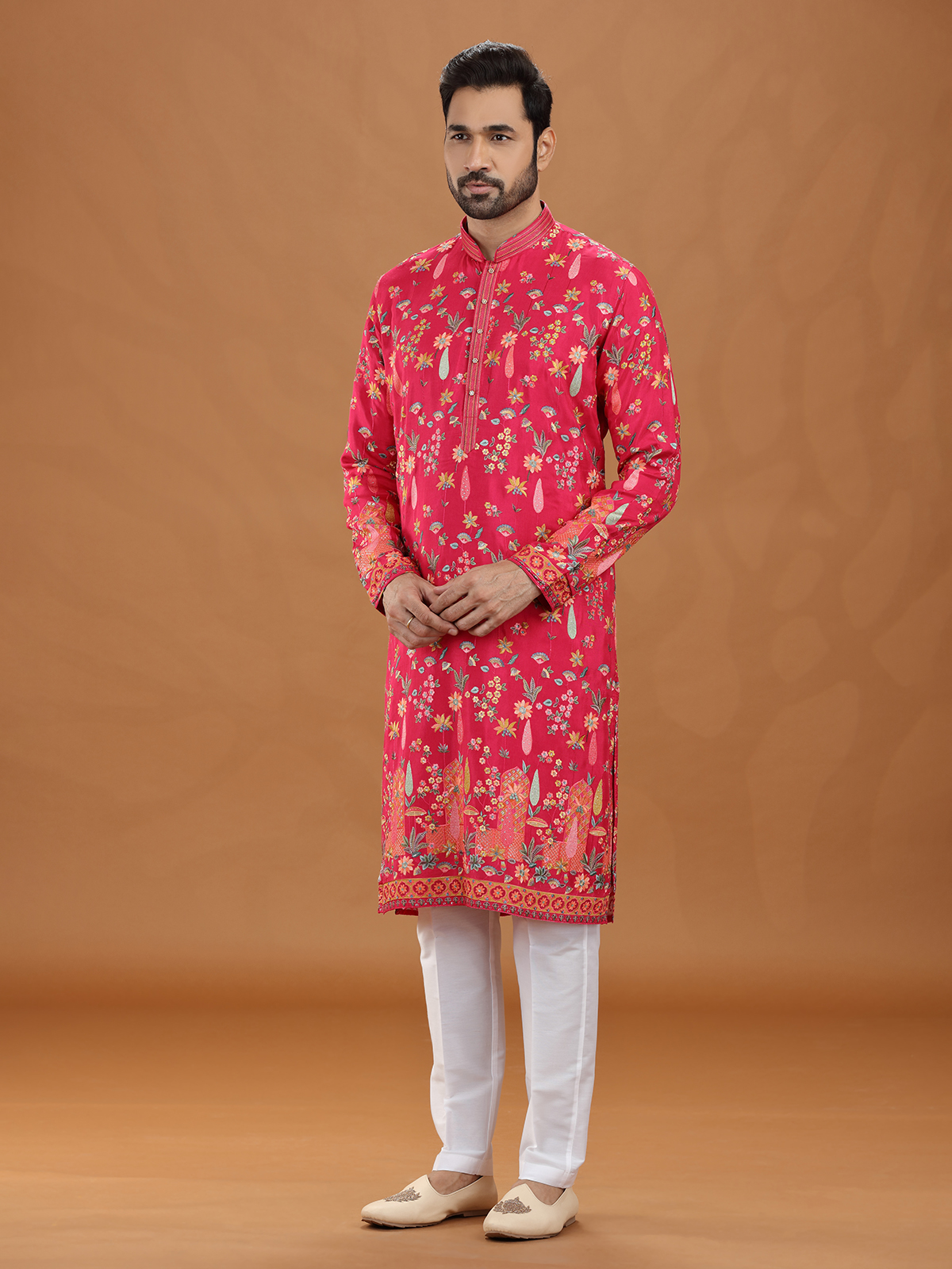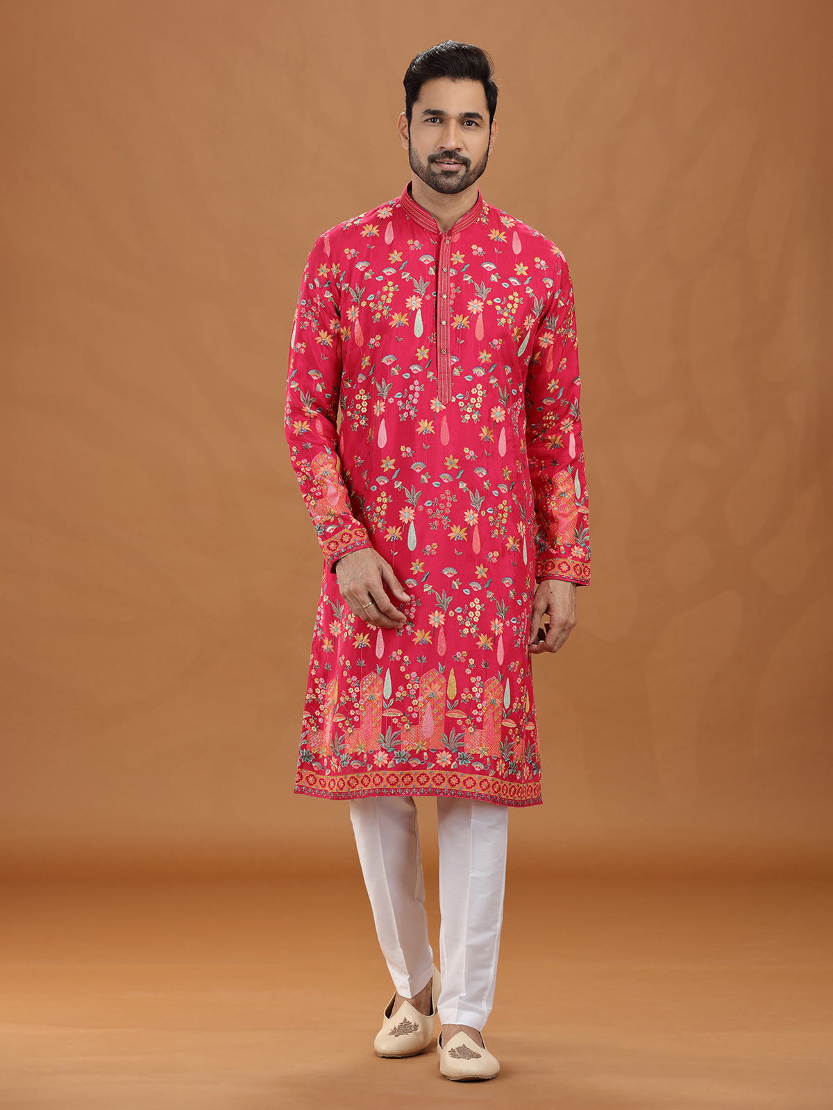 This magenta viscose kurta suit dazzles with intricate embroidery and sequins, creating a luxurious wedding look. The structured stand collar and pant elevate its regal charm. Richly detailed, it is an ideal choice for festive events and cultural occasions with elegance.