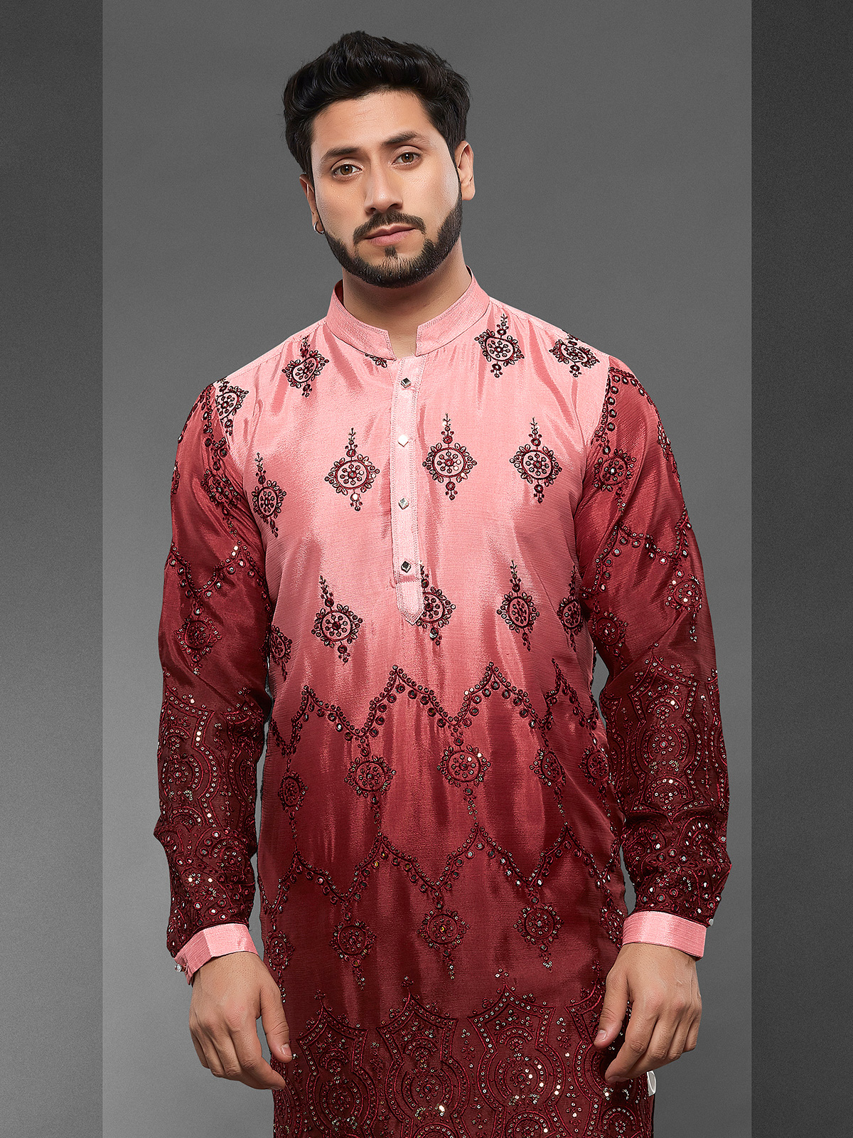 With this maroon and light pink silk kurta set, your closet will have a stylish touch added as this one has a nice shade sof both color and embroidery, mirror and sequins work. With its full sleeves and mandarin collar, this comfortable garment also includes a bottom.