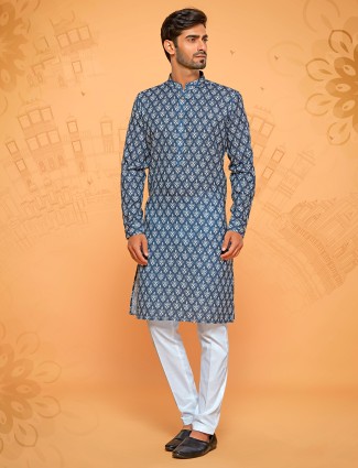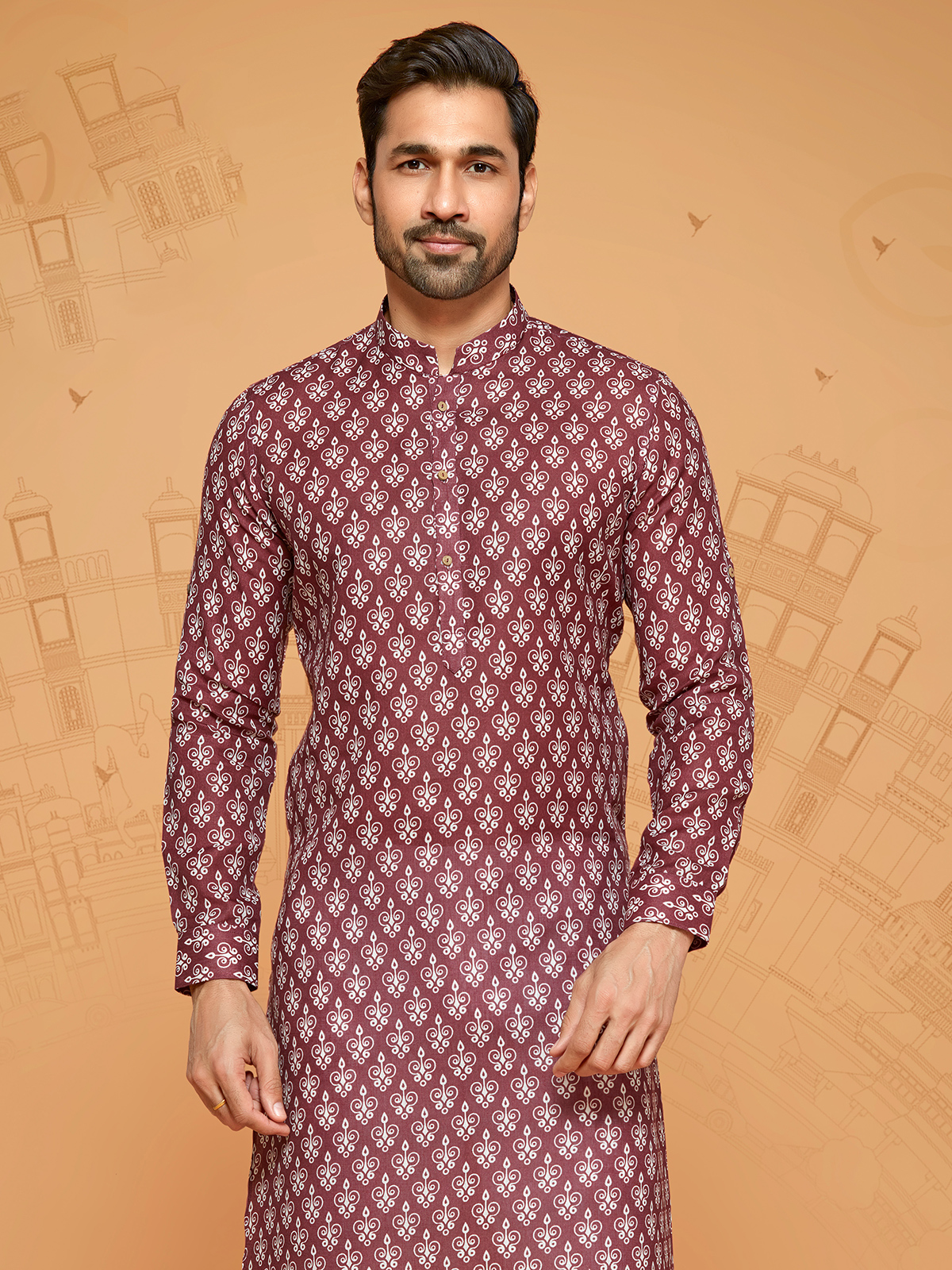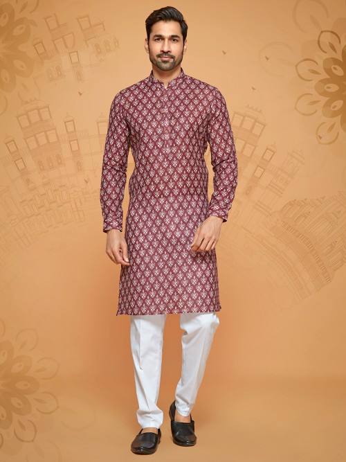 This cotton kurta suit with a maroon design has a classic appearance. It comes with a bottom, full sleeves, and a mandarin collar.