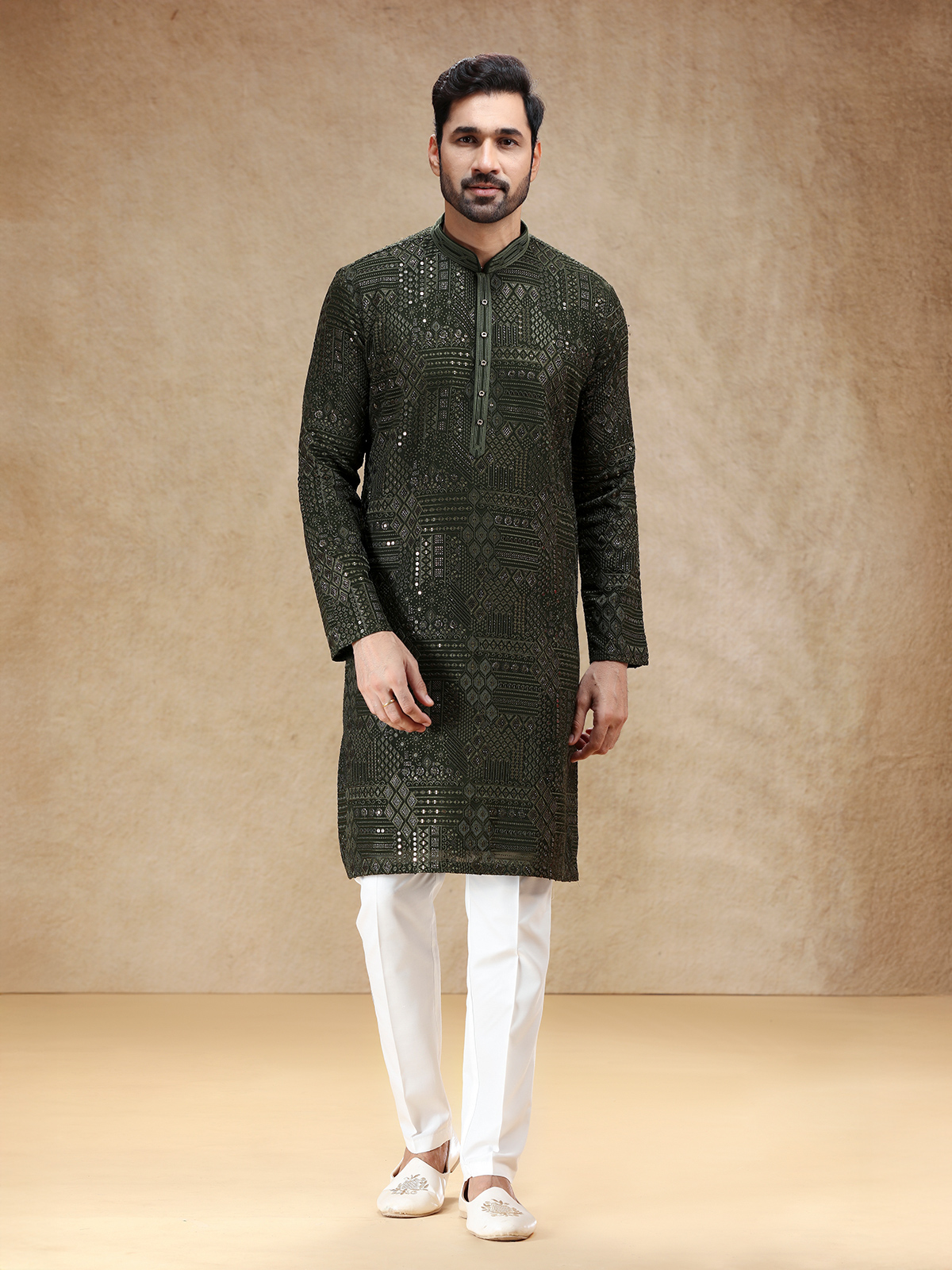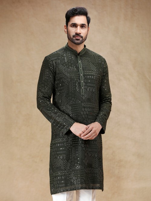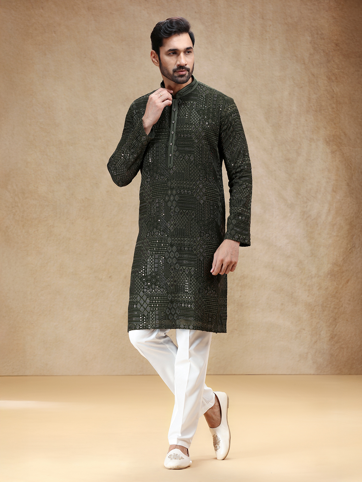 Bathed in festive mehendi green georgette, this kurta suit is adorned with resham and sequins that shimmer beautifully. The structured stand collar and full sleeves add balance, while pants complete its graceful silhouette. The rich green hue exudes freshness and refinement, creating attire that perfectly captures the spirit of joyous family celebrations and traditional gatherings.