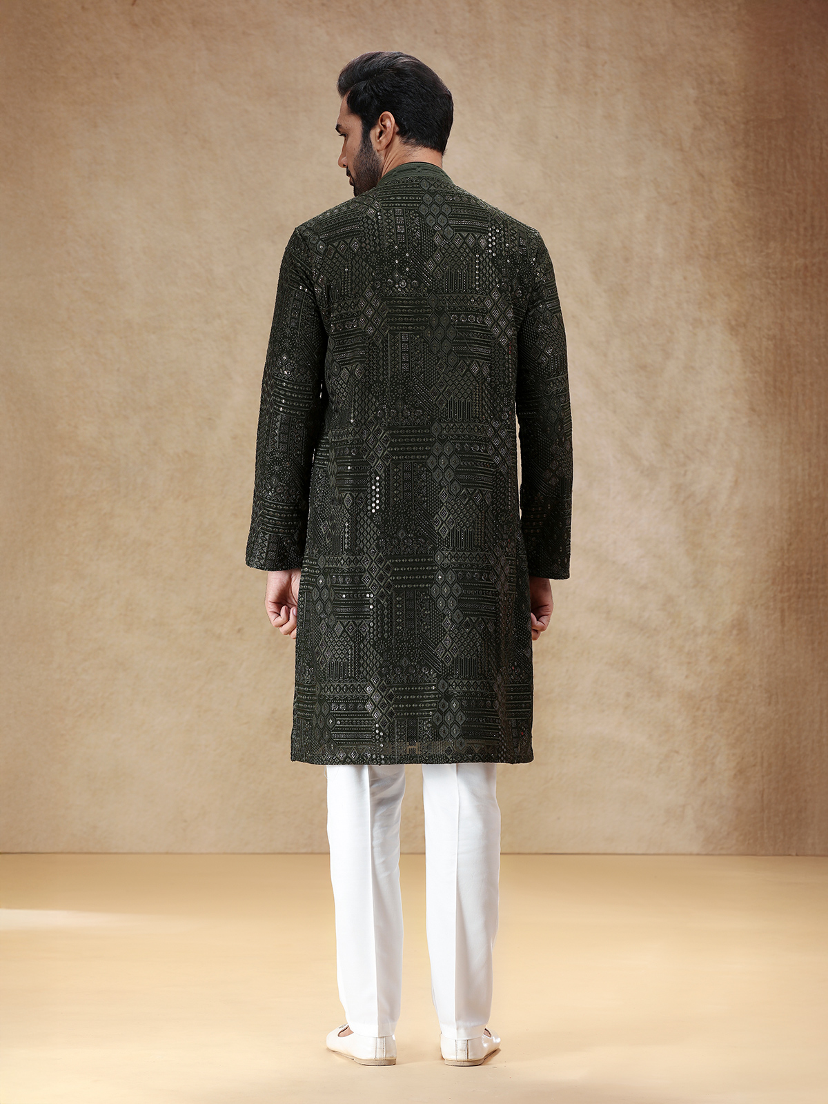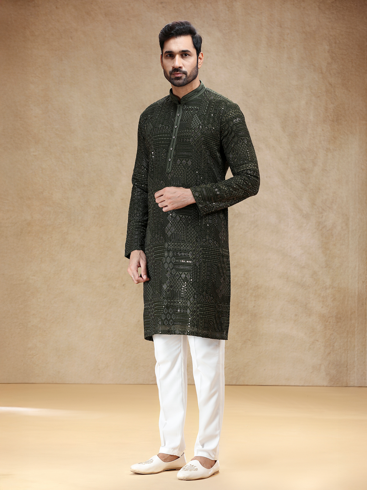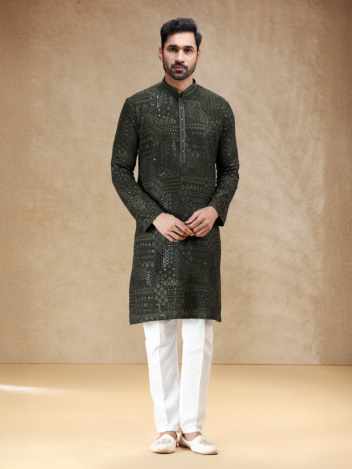 Bathed in festive mehendi green georgette, this kurta suit is adorned with resham and sequins that shimmer beautifully. The structured stand collar and full sleeves add balance, while pants complete its graceful silhouette. The rich green hue exudes freshness and refinement, creating attire that perfectly captures the spirit of joyous family celebrations and traditional gatherings.