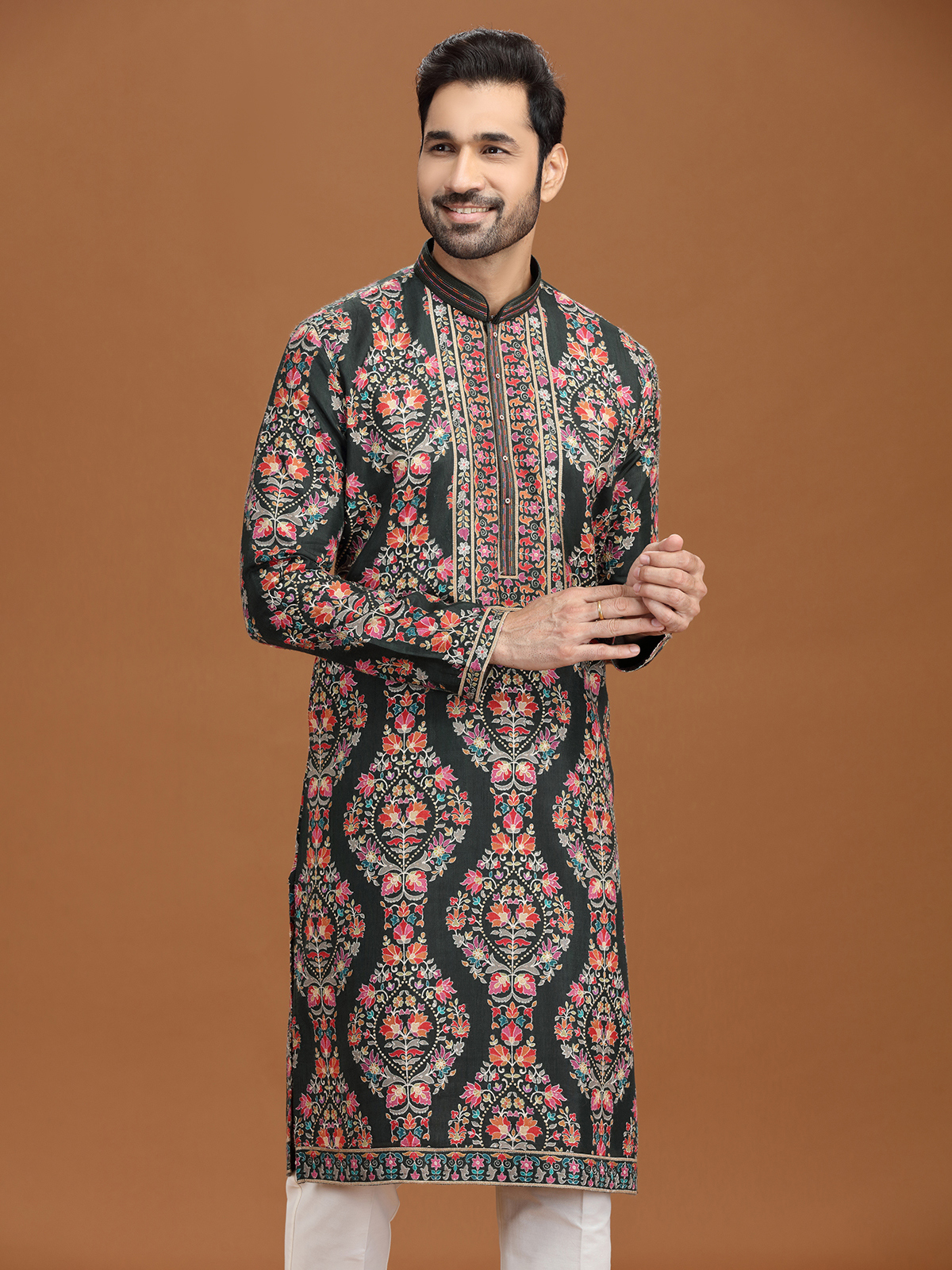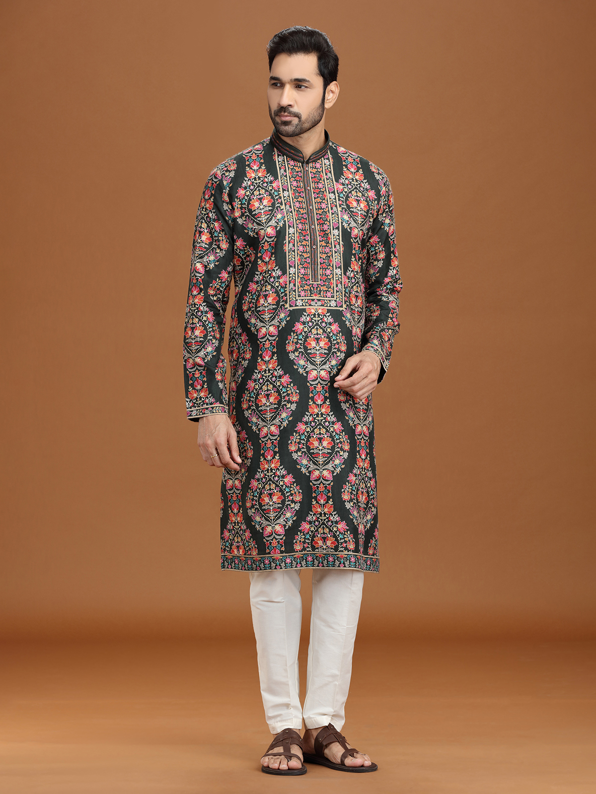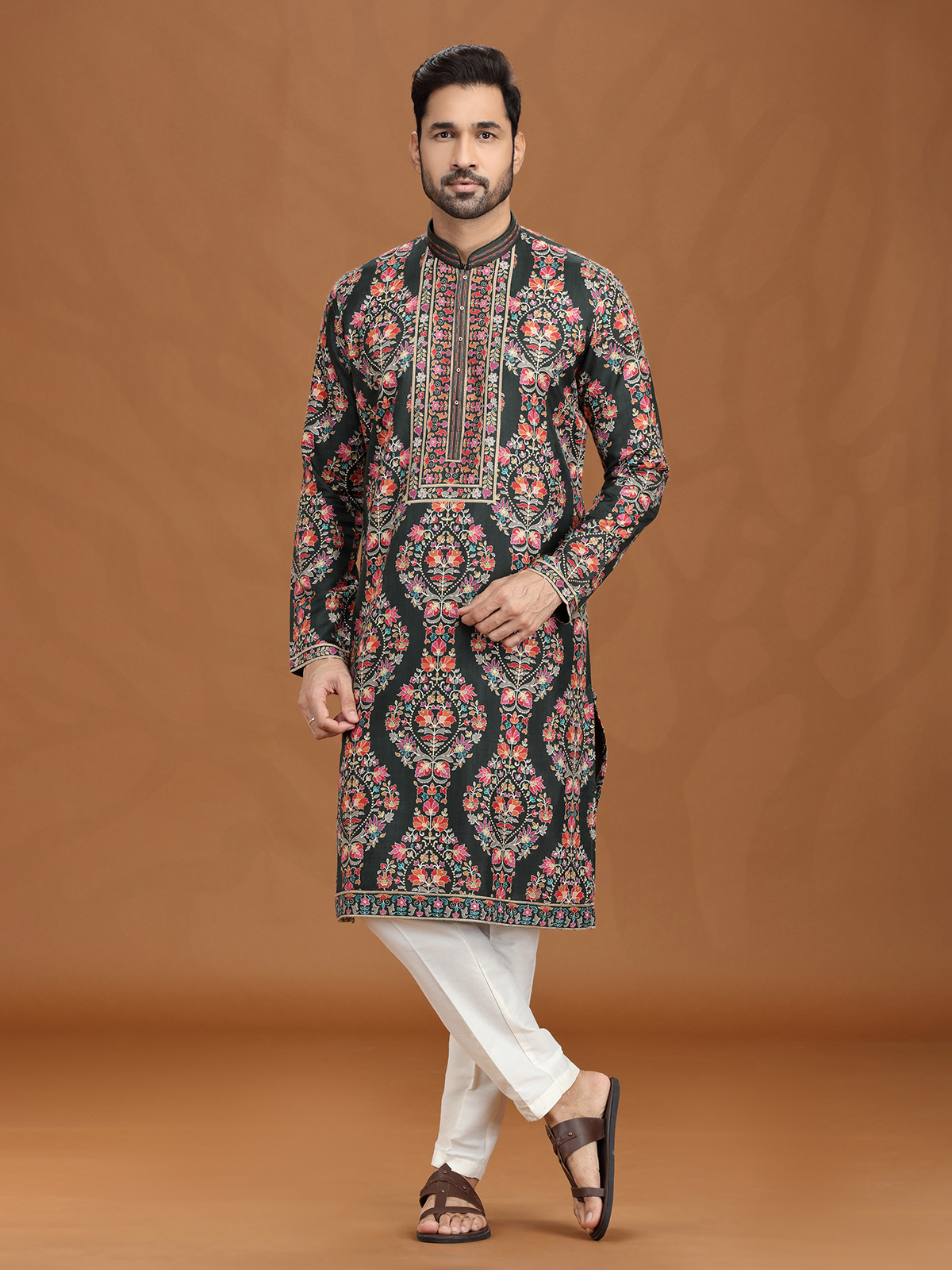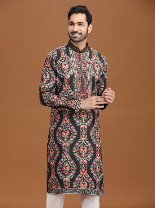 Richly hued in mehendi green, this viscose kurta suit is embellished with resham and sequins motifs that exude festive elegance. A smart stand collar with pant provides sleek balance. Ideal for mehendi ceremonies and celebrations, it combines traditional artistry with modern, comfortable wear.